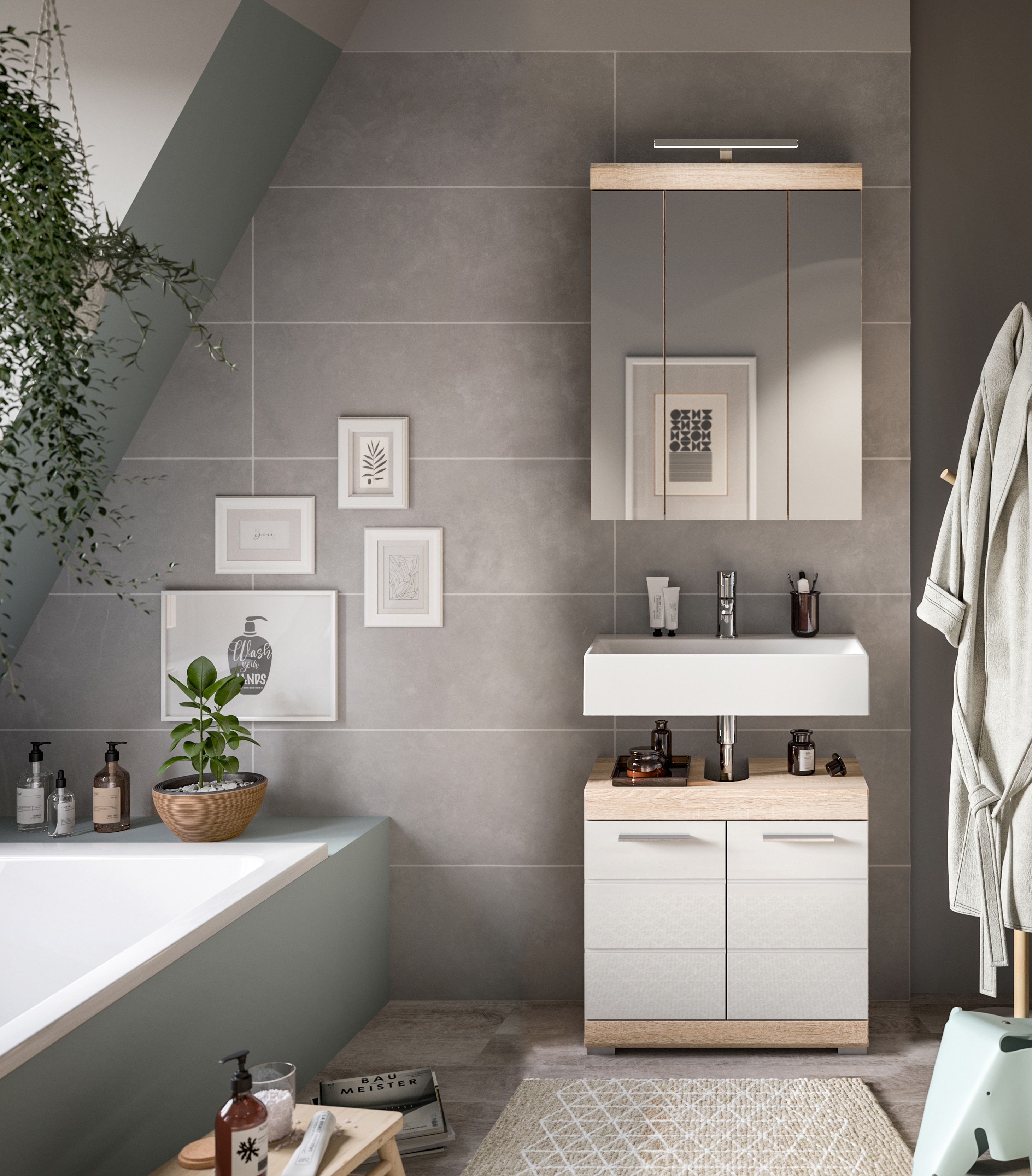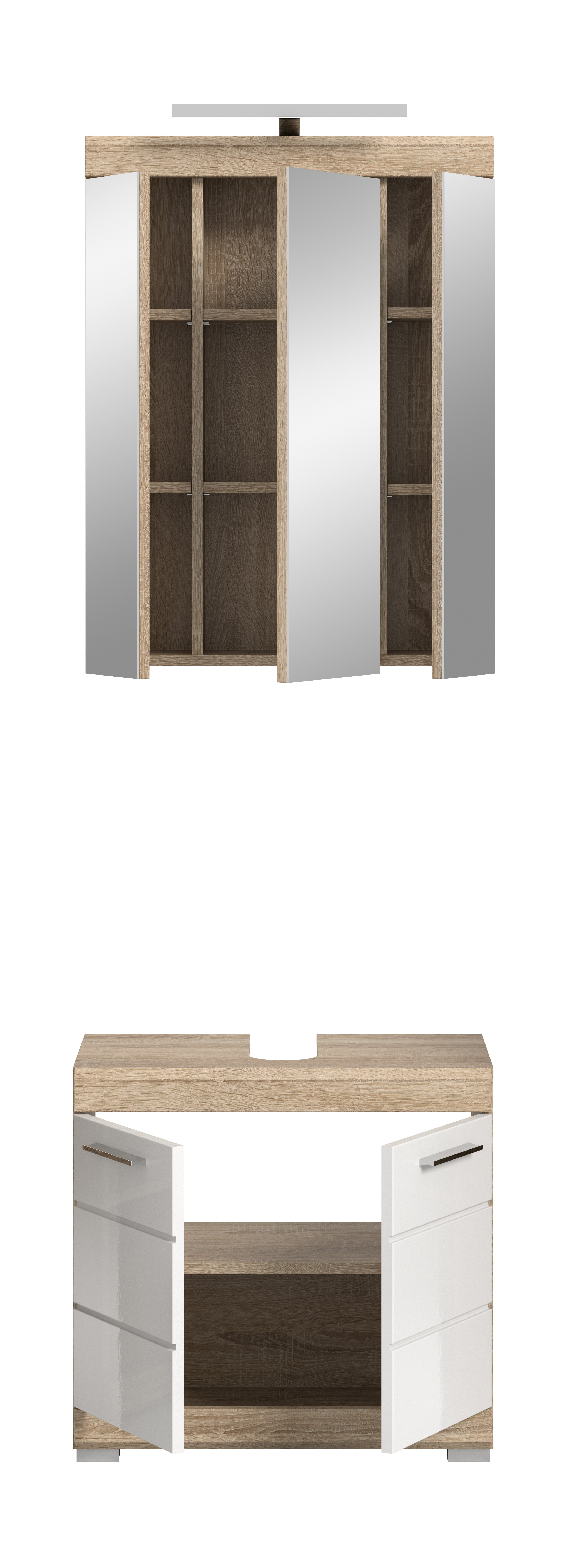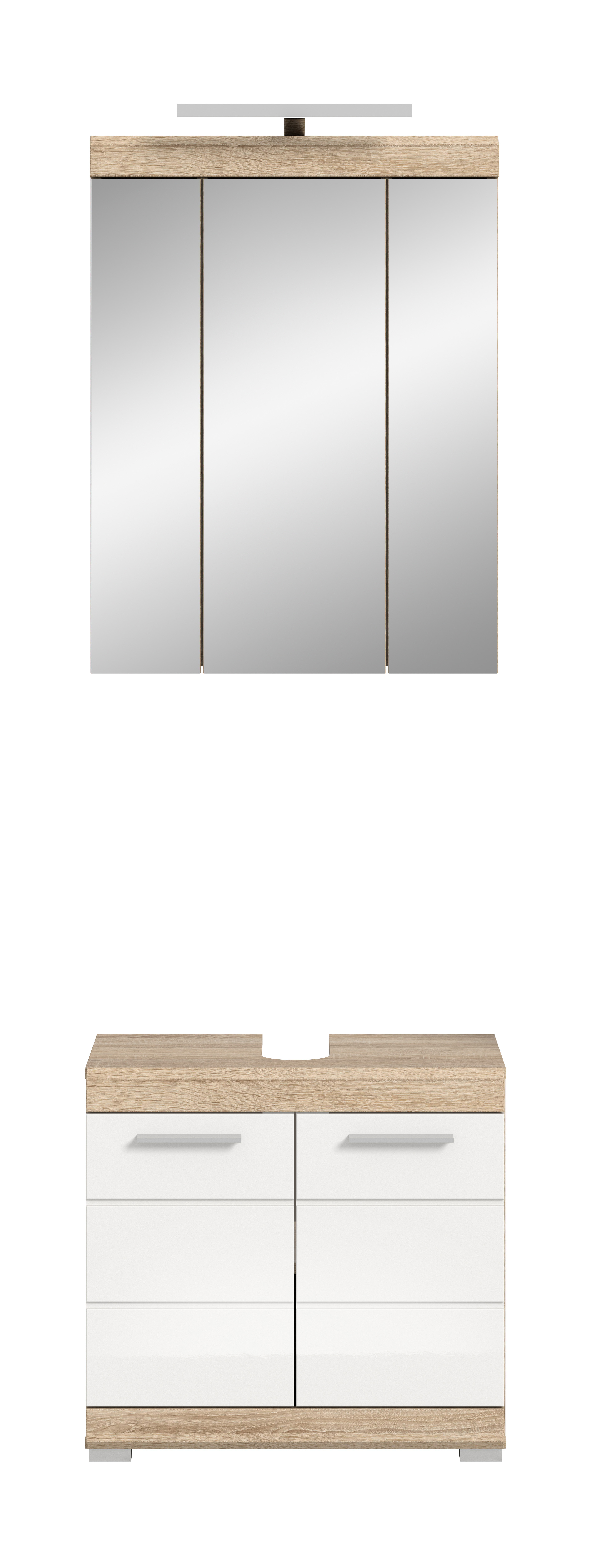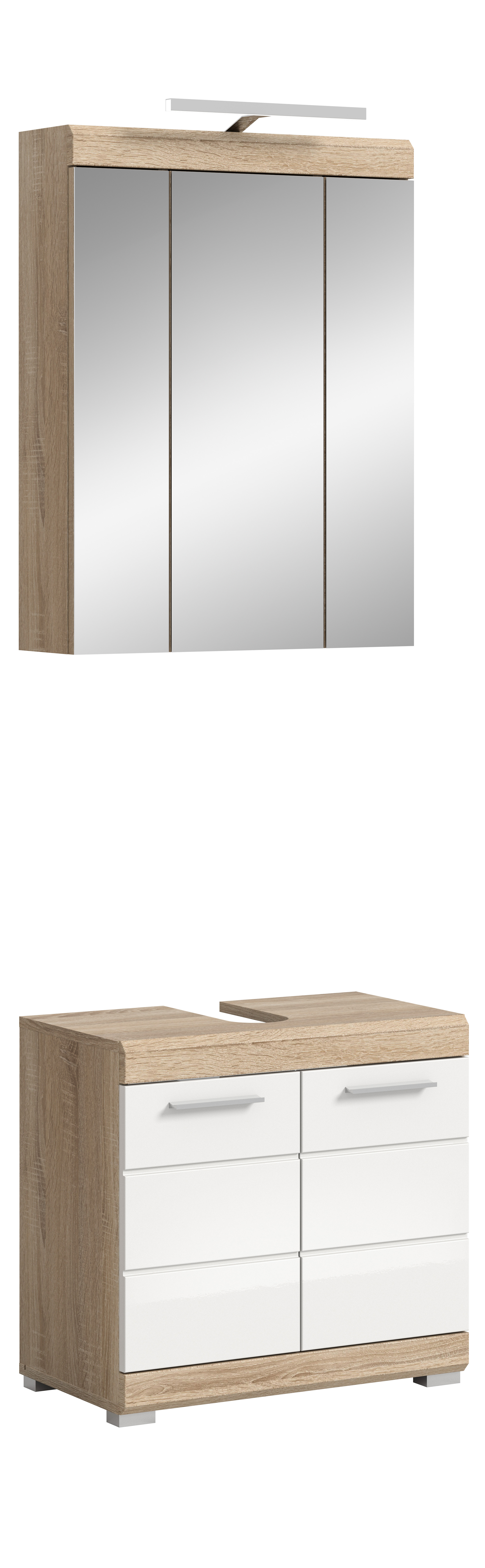 Entdecken Sie die perfekte Kombination aus Stil und Funktionalität für Ihr Badezimmer mit unserer Badkombination in Sonoma Eiche hell und weißem Hochglanz. Sie bietet bietet ausreichend Stauraum und verleiht Ihrem Raum einen modernen und ansprechenden Look. Tauchen Sie ein in zeitlose Eleganz und optimale Organisation mit diesem einzigartigen Möbelstück.
