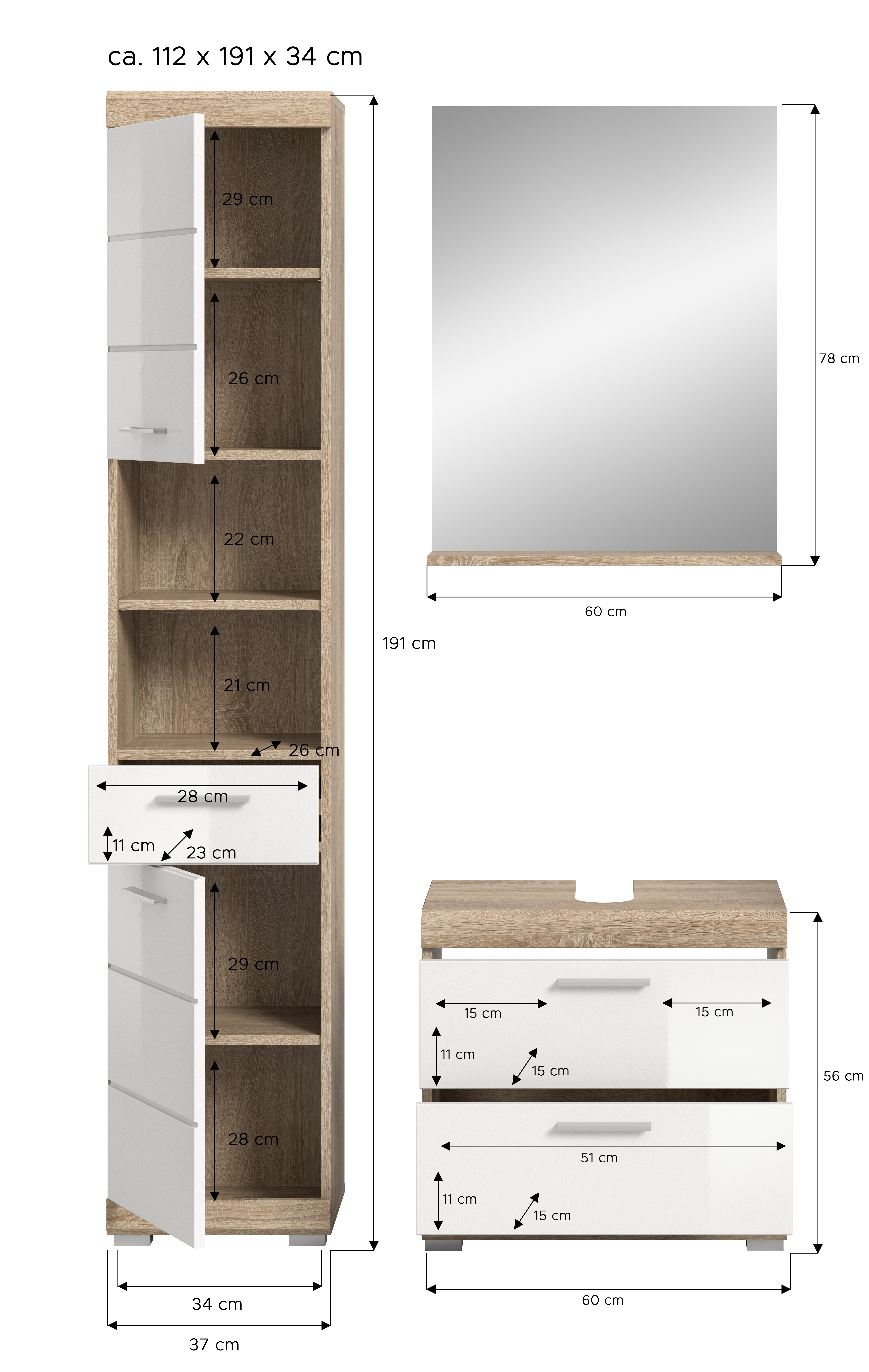 - Design/Stil: Die Kombination aus Sonoma Eiche hell und weißem Hochglanz tiefgezogenem Finish sorgt für ein modernes und ansprechendes Erscheinungsbild im Badezimmer oder Hauswirtschaftsraum.