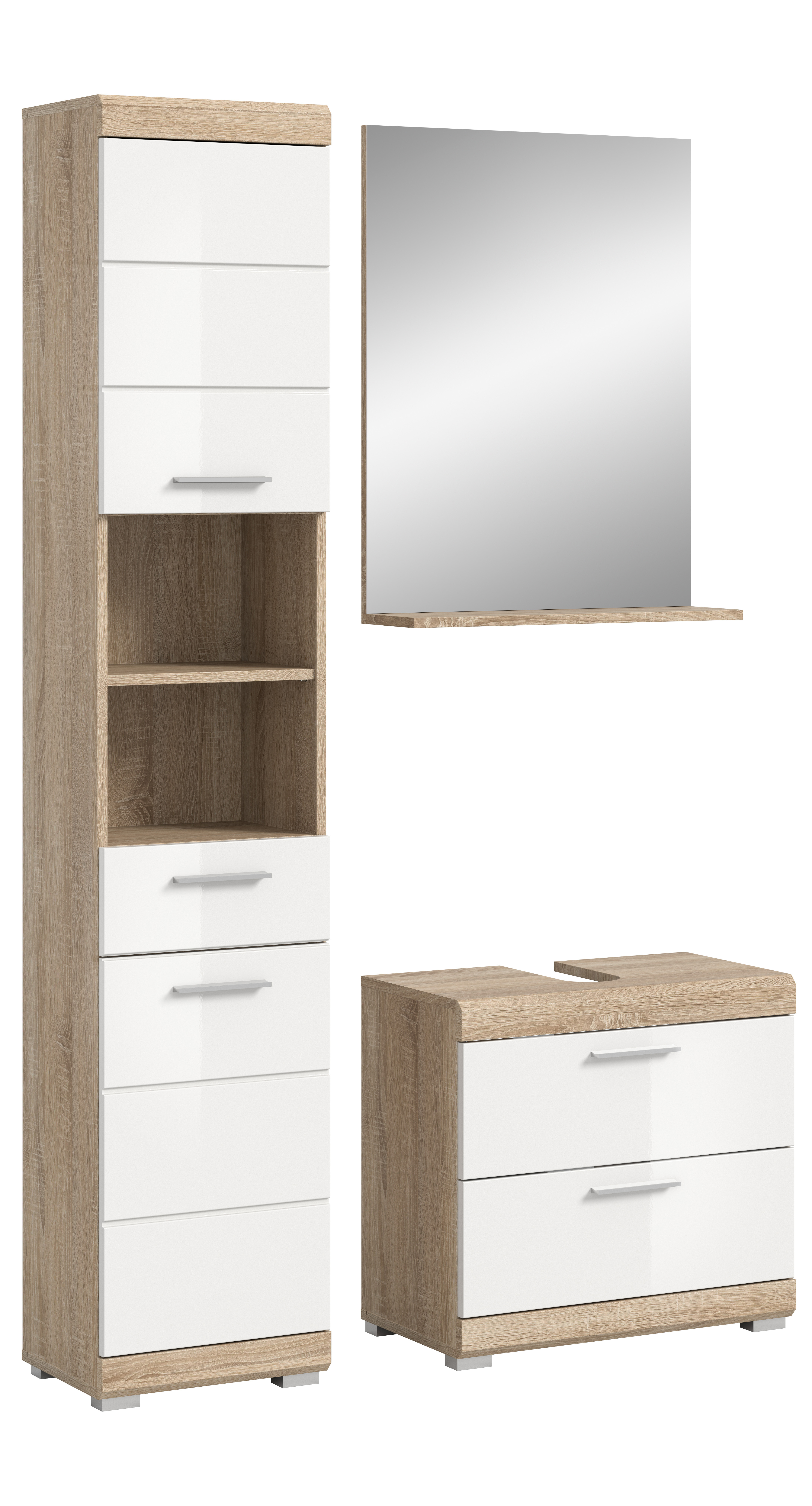Entdecken Sie die perfekte Kombination aus Stil und Funktionalität für Ihr Badezimmer mit unserer Badkombination in Sonoma Eiche hell und weißem Hochglanz. Sie bietet bietet ausreichend Stauraum und verleiht Ihrem Raum einen modernen und ansprechenden Look. Tauchen Sie ein in zeitlose Eleganz und optimale Organisation mit diesem einzigartigen Möbelstück.