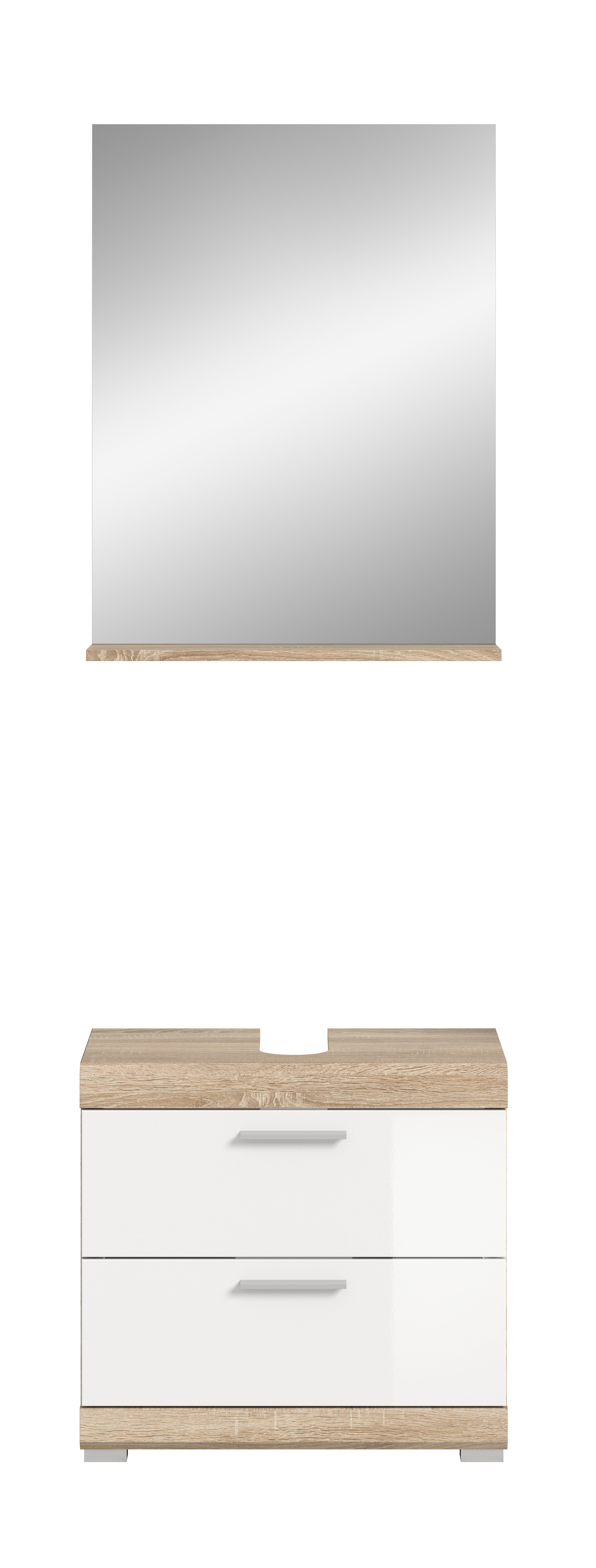 Entdecken Sie die perfekte Kombination aus Stil und Funktionalität für Ihr Badezimmer mit unserer Badkombination in Sonoma Eiche hell und weißem Hochglanz. Sie bietet bietet ausreichend Stauraum und verleiht Ihrem Raum einen modernen und ansprechenden Look. Tauchen Sie ein in zeitlose Eleganz und optimale Organisation mit diesem einzigartigen Möbelstück.