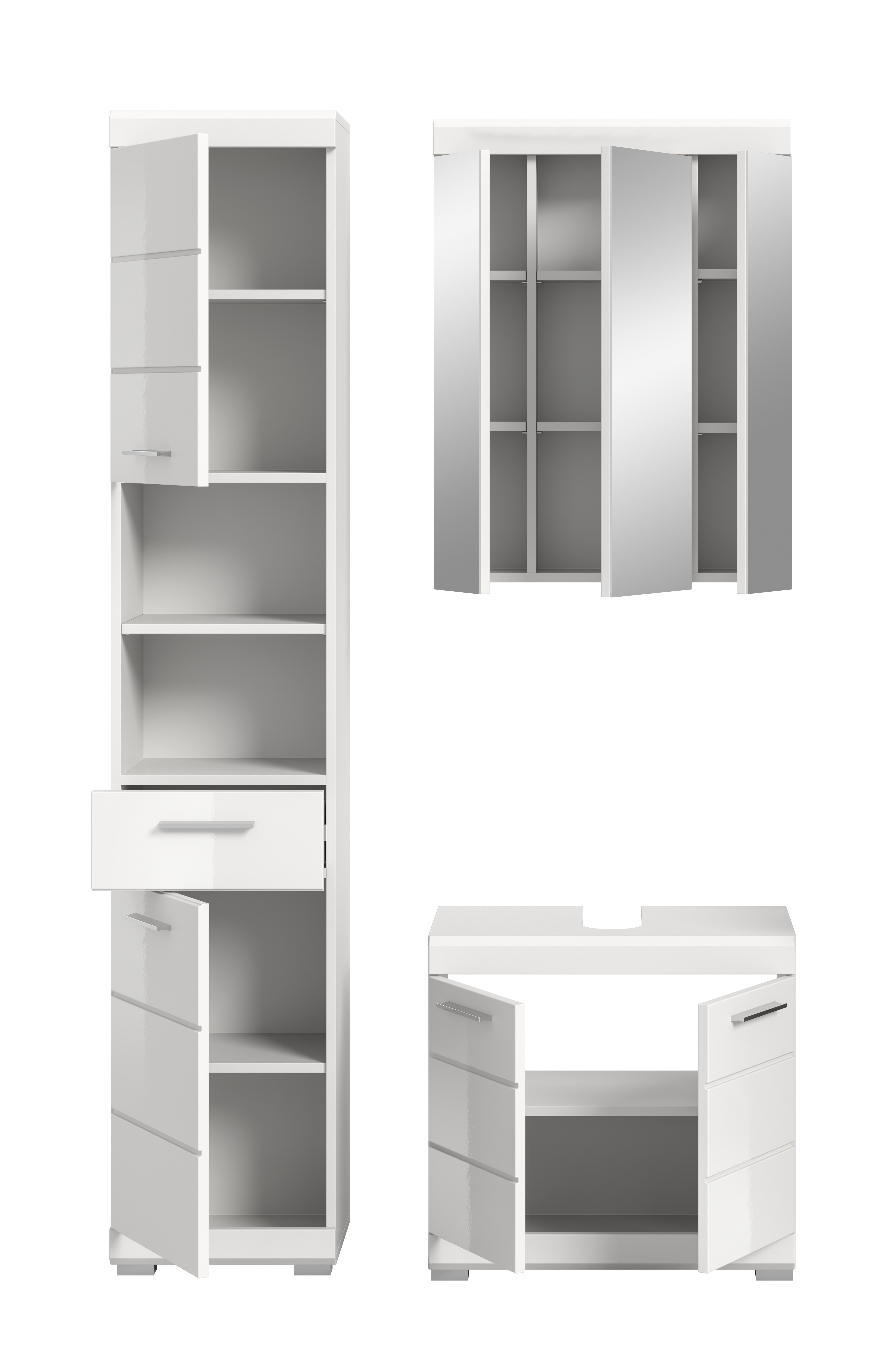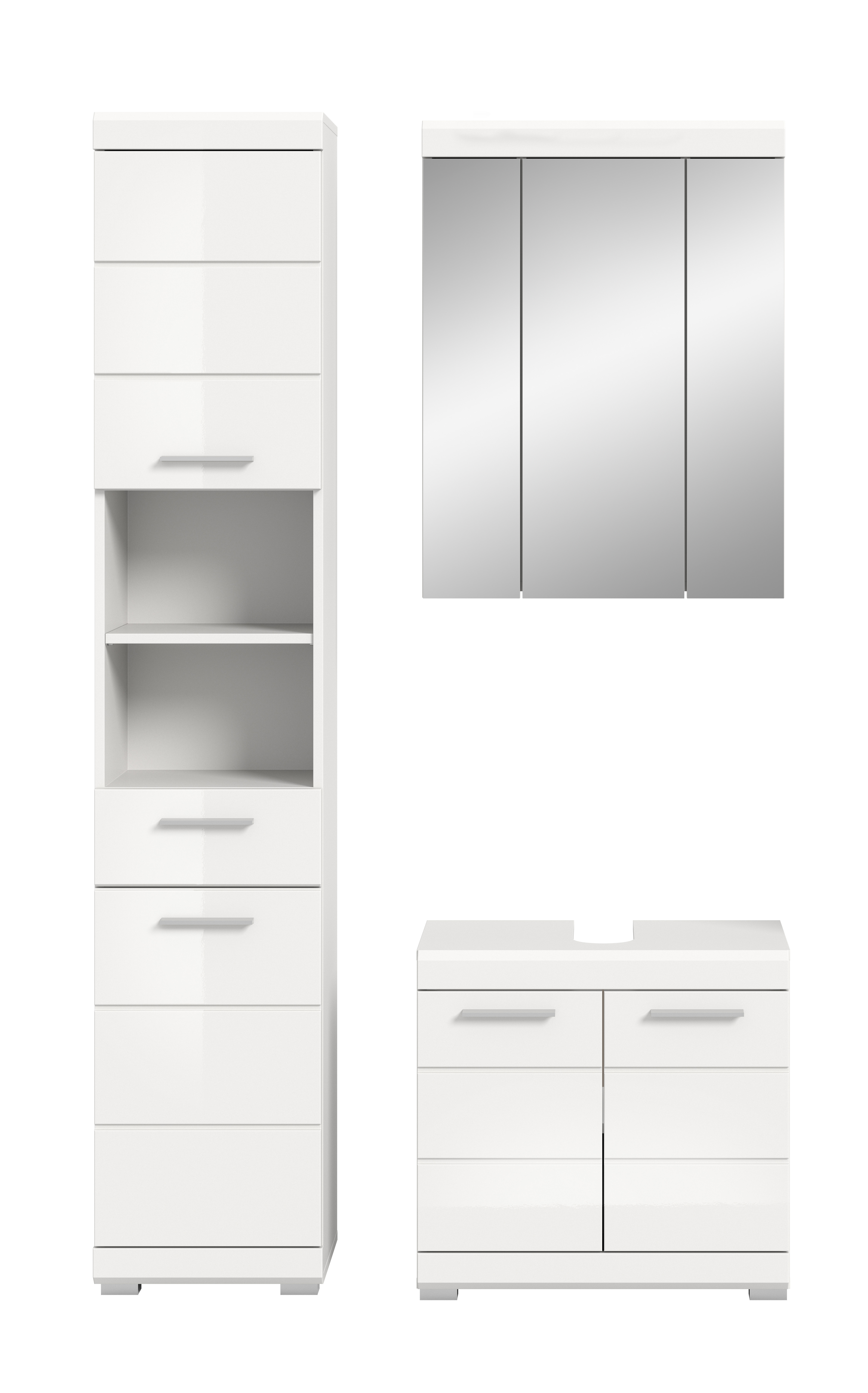 Verleihe deinem Badezimmer den ultimativen Style mit unserer Badkombination in angesagtem weiß Nachbildung und weißem Hochglanz tiefgezogenem Finish. Mit ihrem trendigen Design und der hochwertigen Verarbeitung setzt sie ein modernes Statement in deinem Zuhause. Entdecke jetzt die perfekte Verbindung von Coolness und Funktionalität für dein Badezimmer!