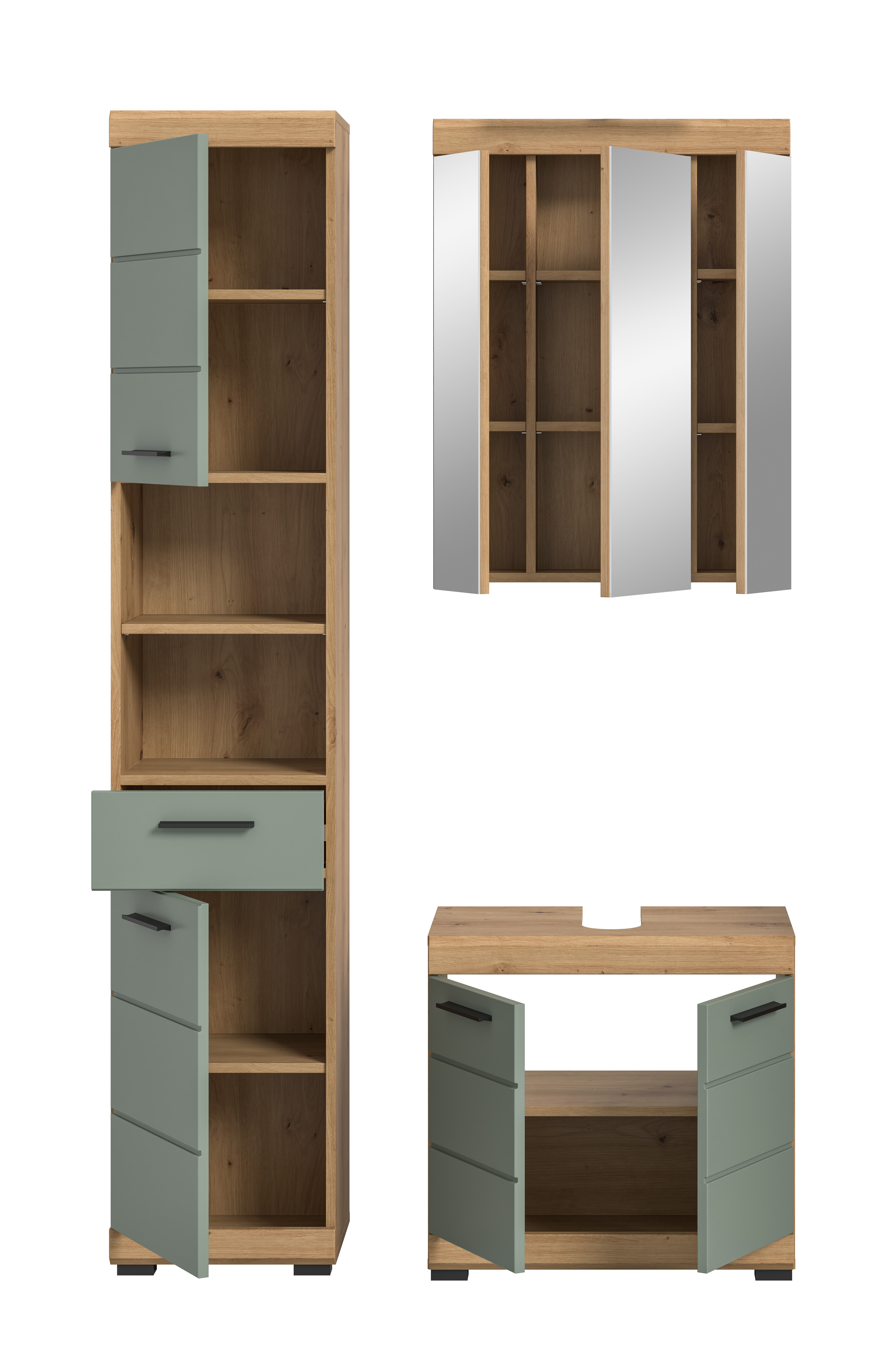 Verleihe deinem Badezimmer den ultimativen Style mit unserer Badkombination in angesagtem Salbei Nachbildung und Artisan Eiche Finish. Mit ihrem trendigen Design und der hochwertigen Verarbeitung setzt sie ein modernes Statement in deinem Zuhause. Entdecke jetzt die perfekte Verbindung von Coolness und Funktionalität für dein Badezimmer!