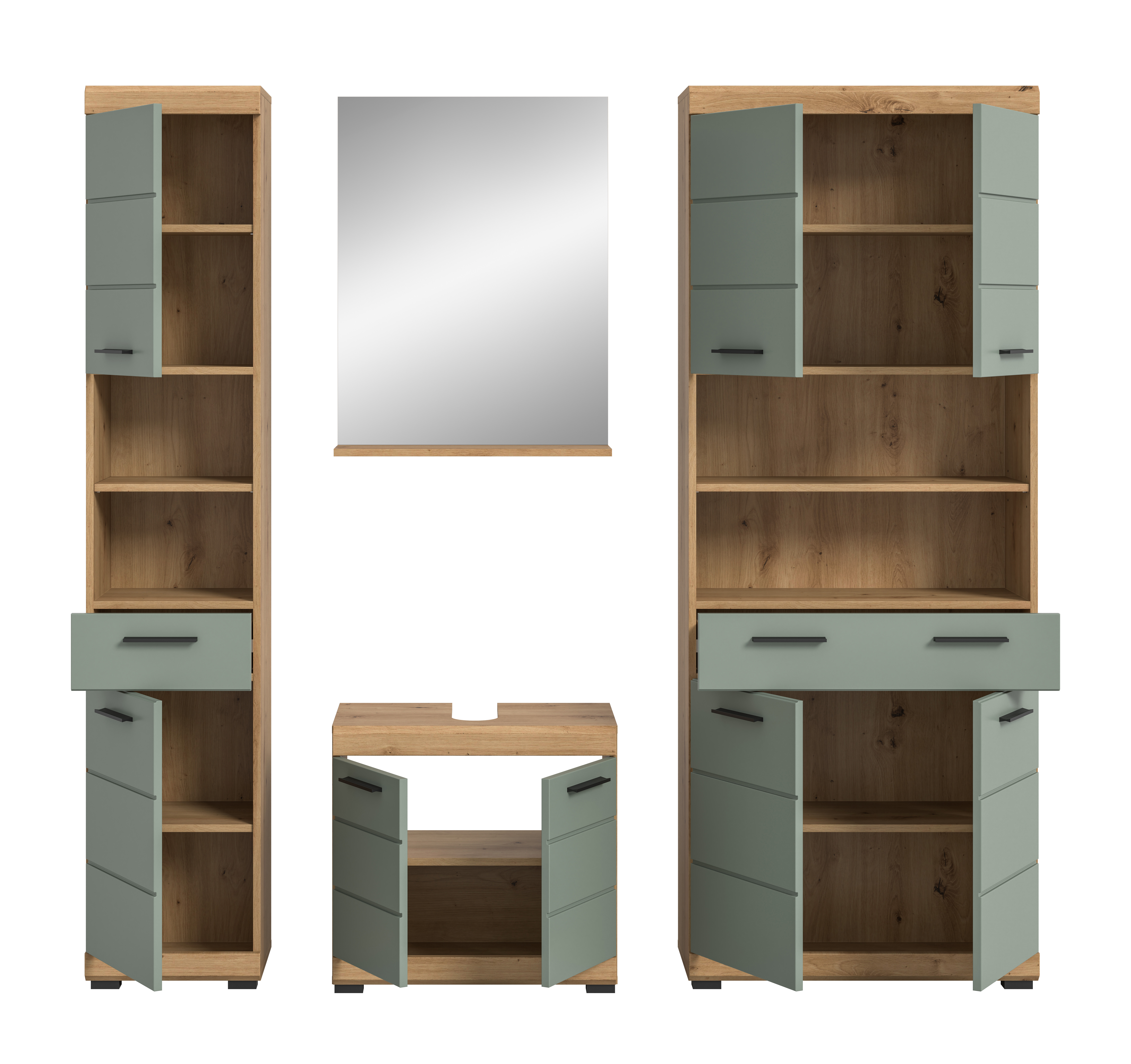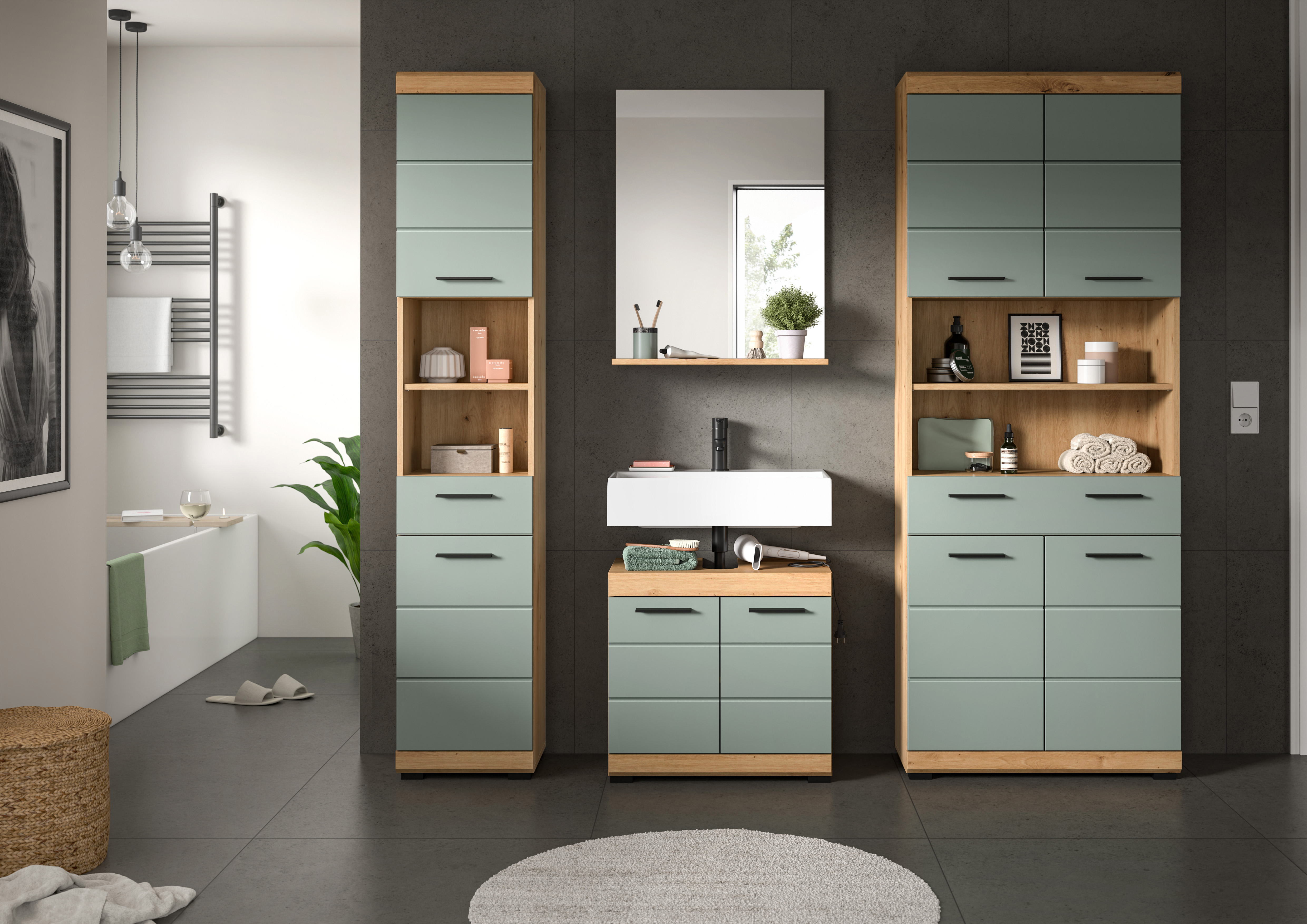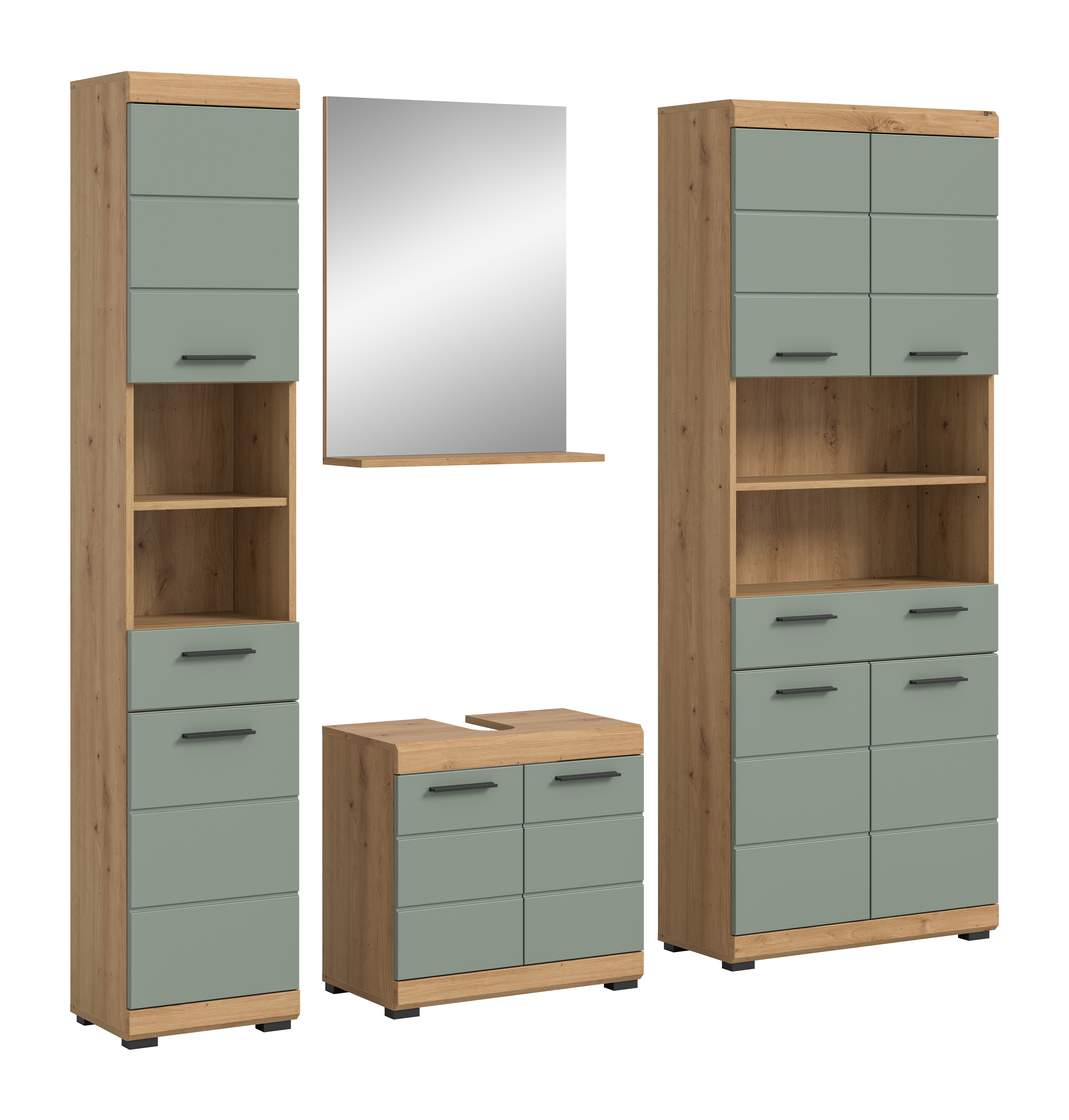 Verleihe deinem Badezimmer den ultimativen Style mit unserer Badkombination in angesagtem salbei Nachbildung und Artisan Eiche Nachbildung. Mit ihrem trendigen Design und der hochwertigen Verarbeitung setzt sie ein modernes Statement in deinem Zuhause. Entdecke jetzt die perfekte Verbindung von Coolness und Funktionalität für dein Badezimmer!