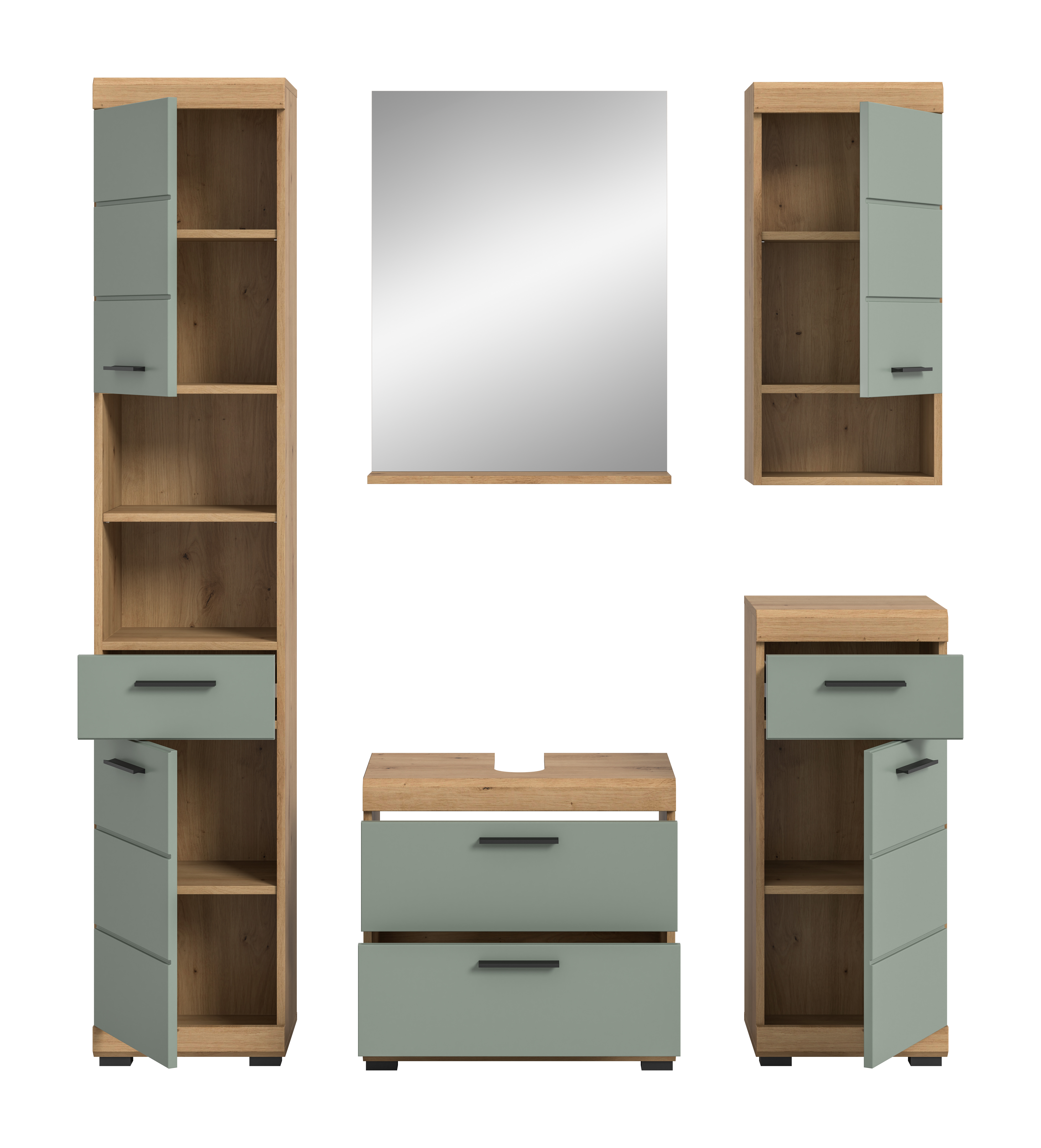 Verleihe deinem Badezimmer den ultimativen Style mit unserer Badkombination in angesagtem salbei Nachbildung und Artisan Eiche Nachbildung. Mit ihrem trendigen Design und der hochwertigen Verarbeitung setzt sie ein modernes Statement in deinem Zuhause. Entdecke jetzt die perfekte Verbindung von Coolness und Funktionalität für dein Badezimmer!