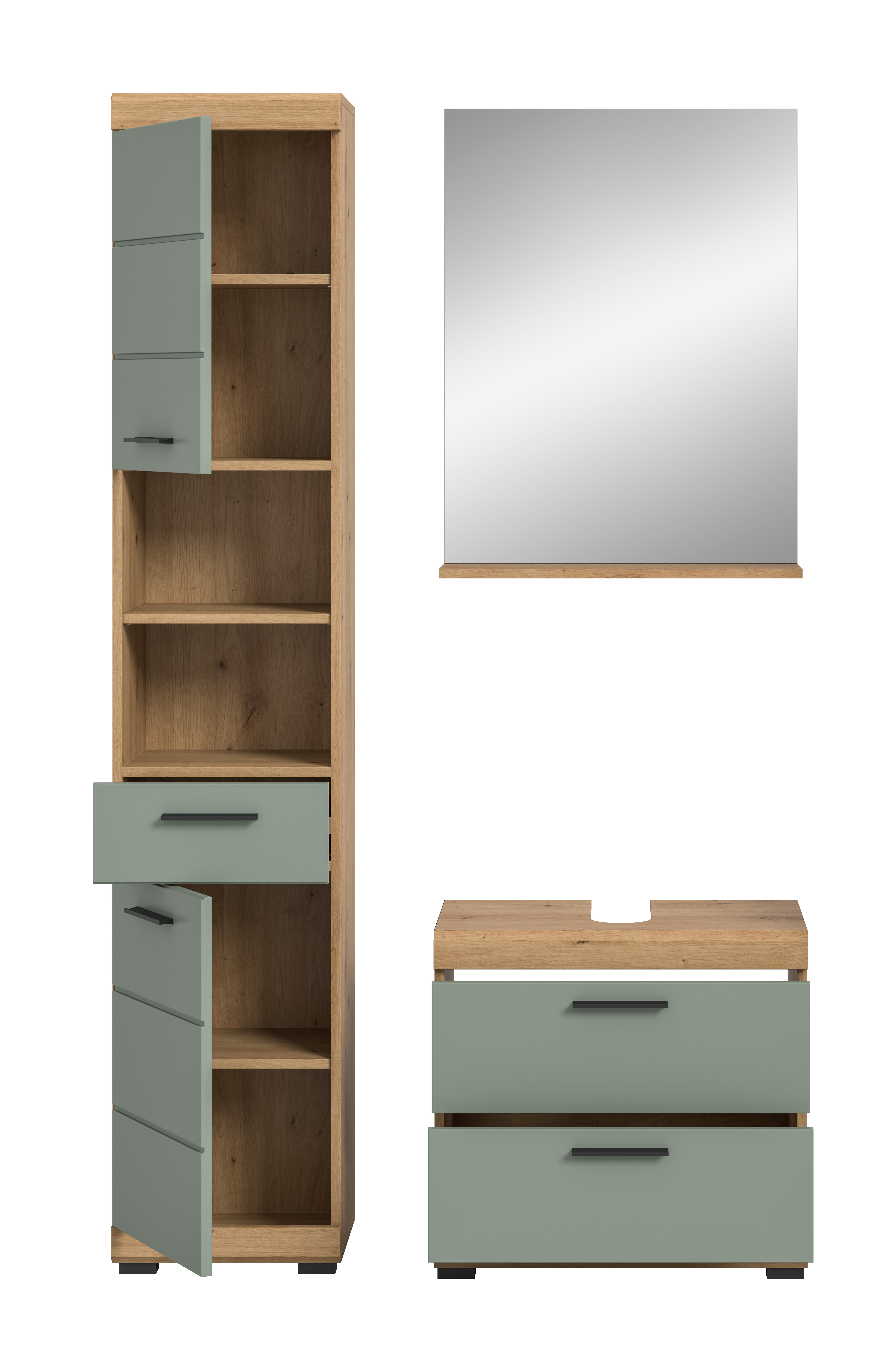 Verleihe deinem Badezimmer den ultimativen Style mit unserer Badkombination in angesagtem salbei Nachbildung und Artisan Eiche Nachbildung. Mit ihrem trendigen Design und der hochwertigen Verarbeitung setzt sie ein modernes Statement in deinem Zuhause. Entdecke jetzt die perfekte Verbindung von Coolness und Funktionalität für dein Badezimmer!