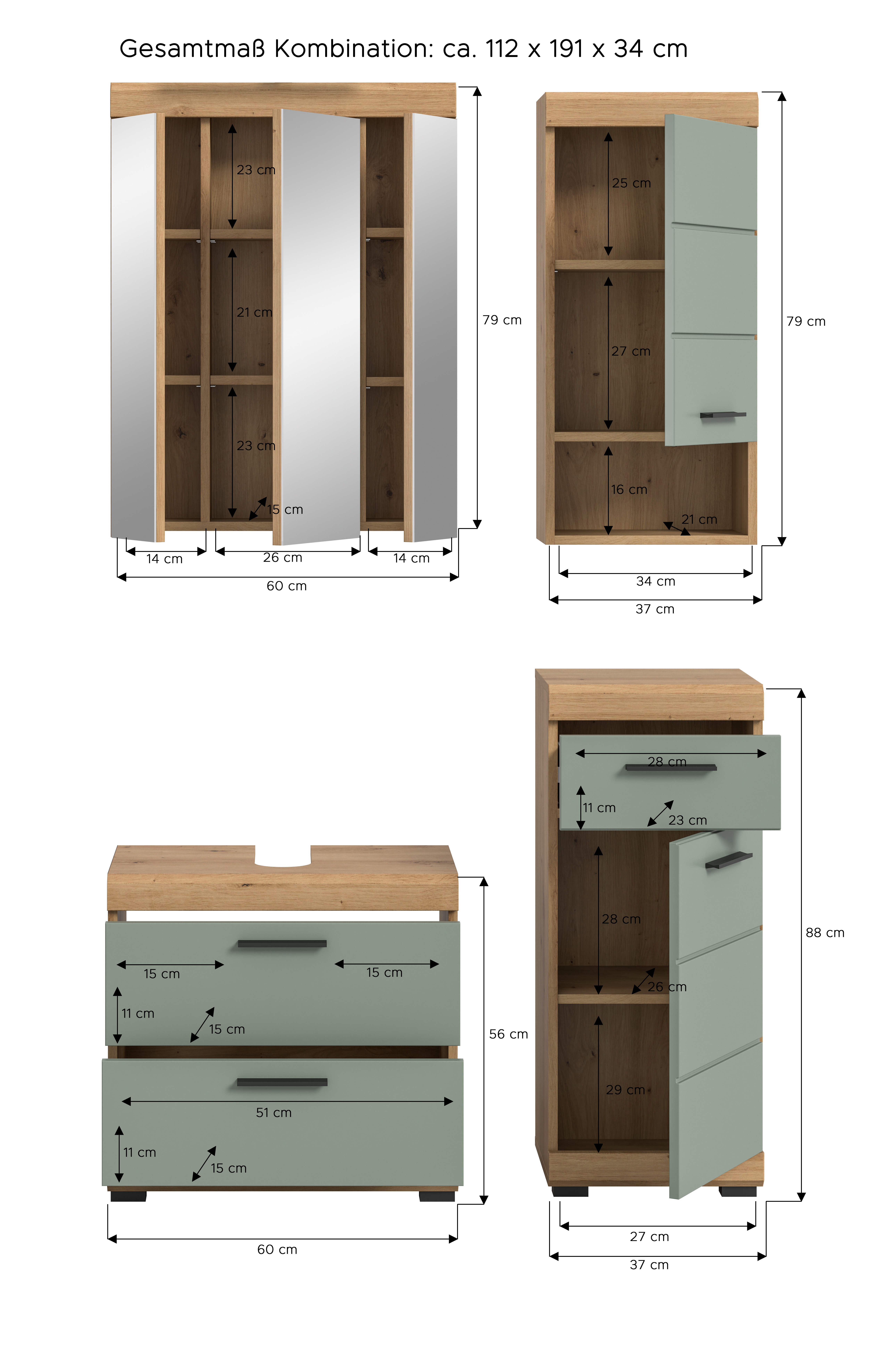 - Einsatzbereich: Die Badkombination ist vielseitig einsetzbar und eignet sich perfekt für Badezimmer oder Hauswirtschaftsräume, um Stauraum zu schaffen und gleichzeitig das Erscheinungsbild des Raumes zu verbessern.