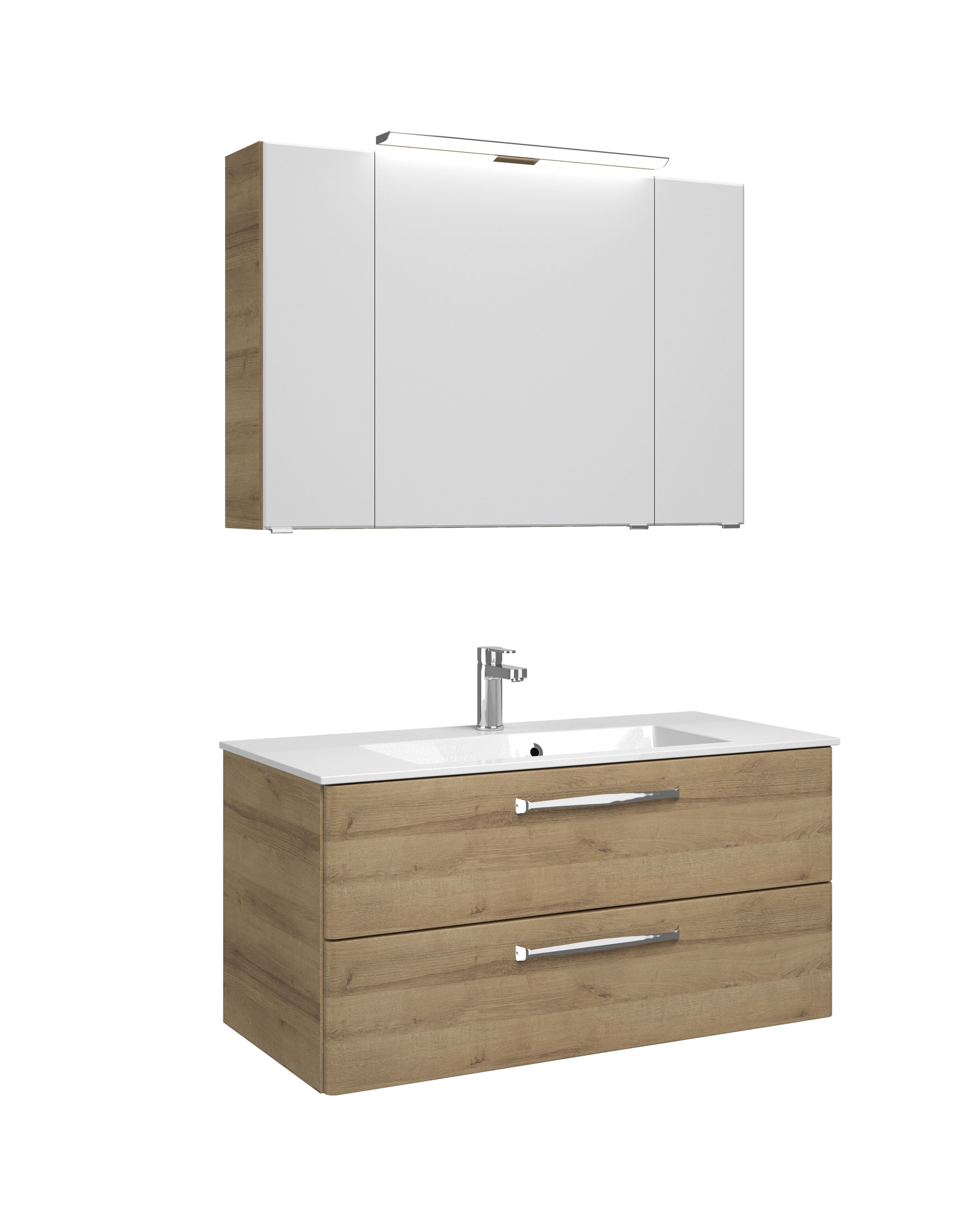 1 Spiegelschrank mit 3 Spiegeltüren und 6 Einlegeböden, inklusive LED-Aufbauleuchte, Schalter und Steckdose