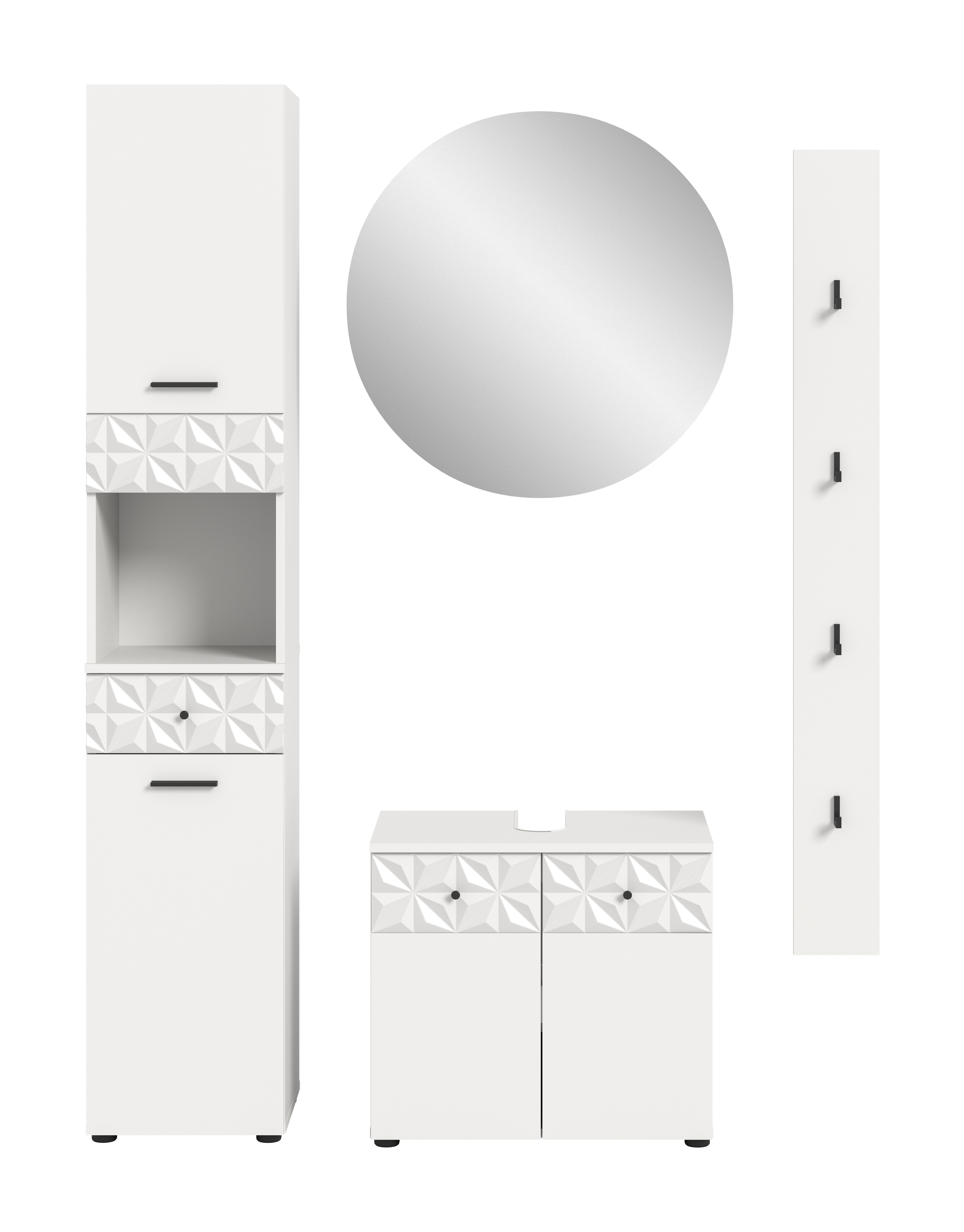Die Badkombination in weißer Nachbildung verbindet modernes Design mit hoher Funktionalität und nachhaltiger Verarbeitung. Perfekt geeignet, um Ihr Badezimmer stilvoll zu gestalten. Diese stilvolle Badkombination bringt Ordnung und Eleganz in Ihr Badezimmer und unterstützt gleichzeitig einen nachhaltigen Lebensstil. Kombinieren Sie modernes Design mit praktischen Funktionen für eine Wohlfühloase in Ihrem Zuhause!