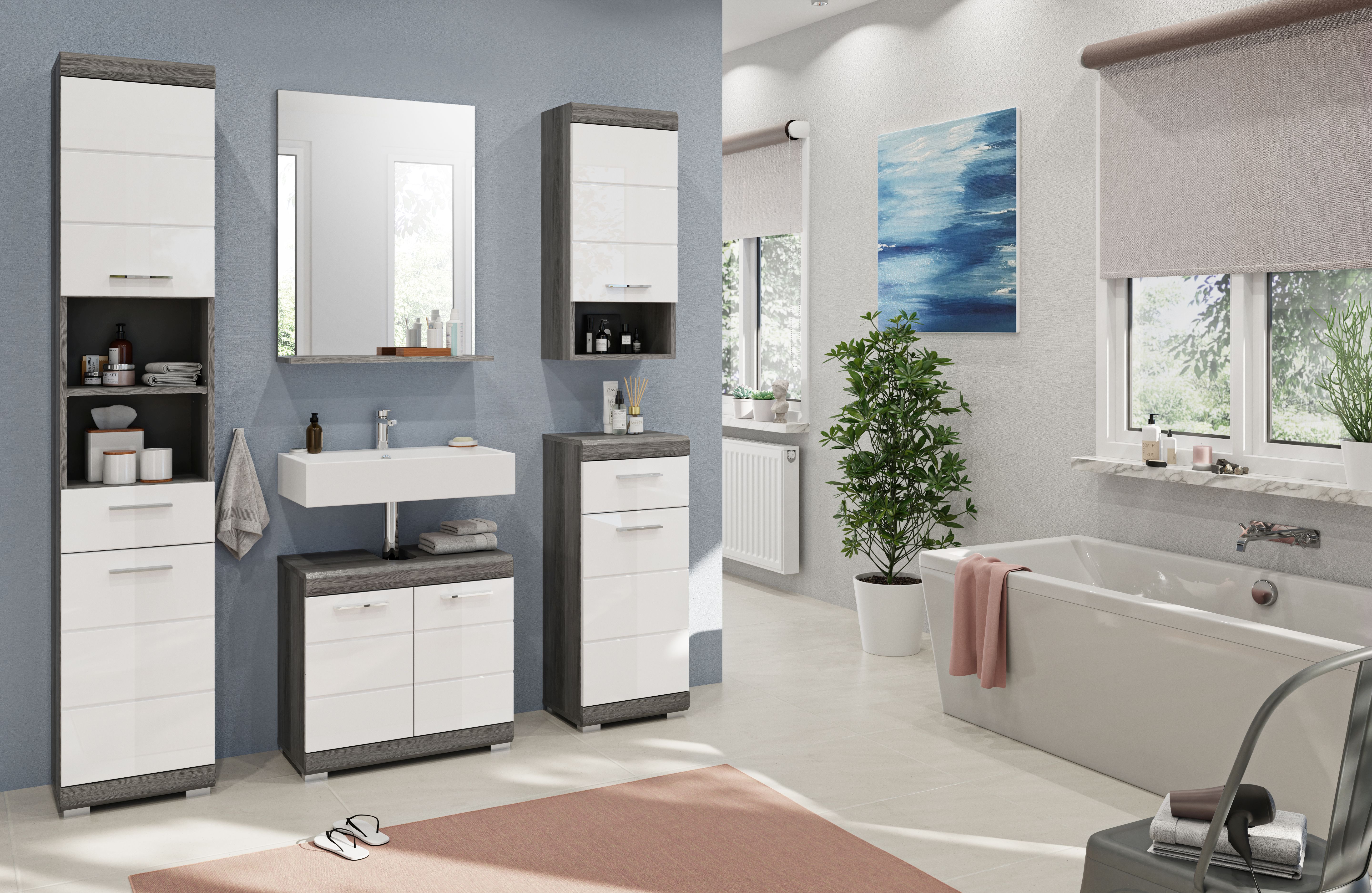 - Design/Stil: Schlichter Standschrank in Rauchsilber Nachbildung und weißem Hochglanz tiefzieh, der sich nahtlos in verschiedene Badezimmer- und Hauswirtschaftsräume einfügt und ein modernes und ordentliches Erscheinungsbild bietet.