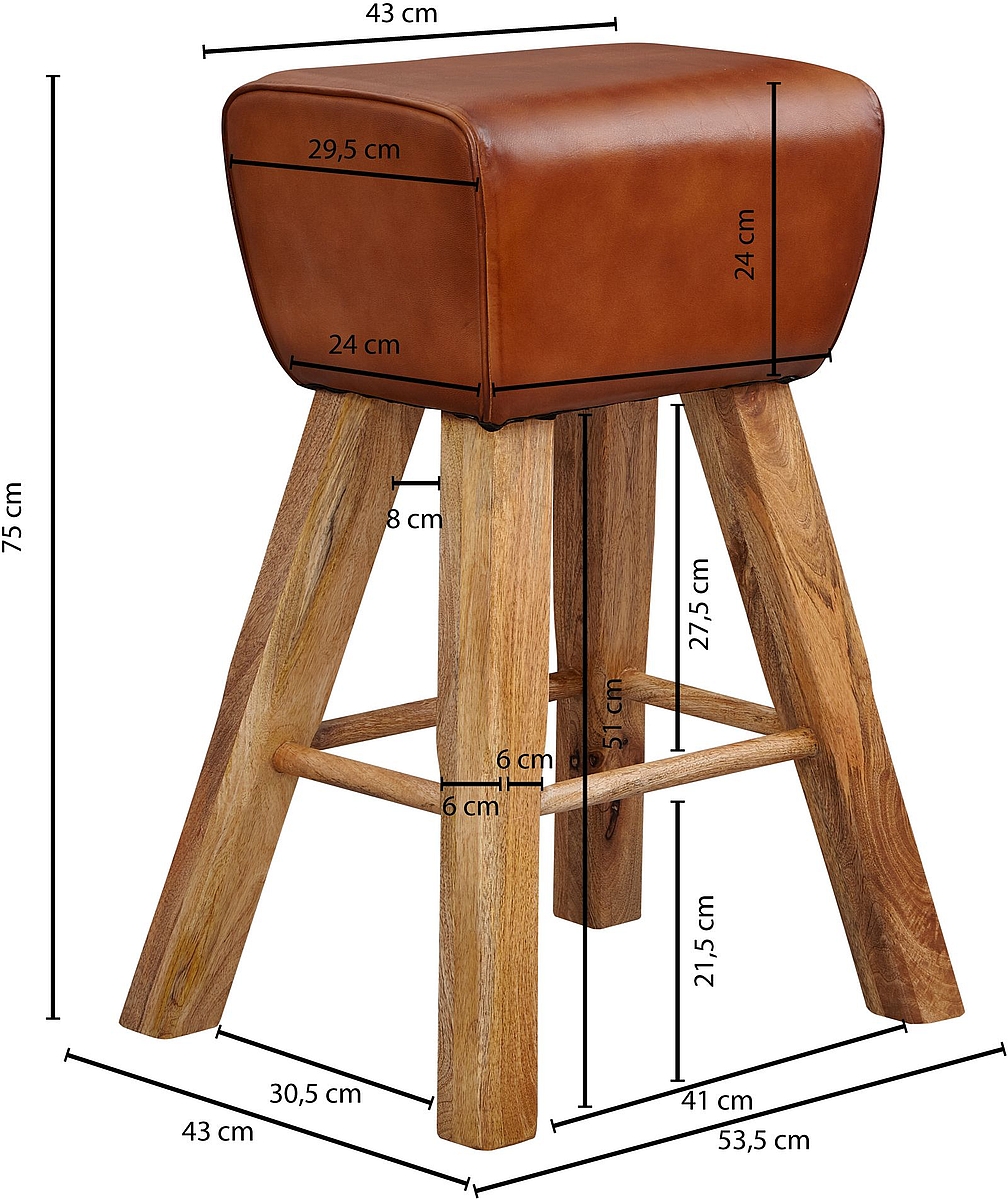 - MATERIAL ✔ Bezug der Sitzfläche: Ziegenleder // Standbeine und Fußablagen: Massives Mango Naturholz mit schützender Klarlackbeschichtung.