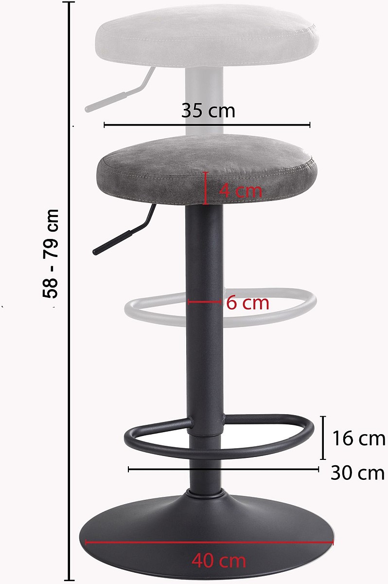 ABMESSUNGEN ✔ Breite: 40 cm // Höhe: 58 - 79 cm // Tiefe: 40 cm // Sitzhöhe: 58 - 79 cm // Durchmesser Sitzfläche: 35 cm.