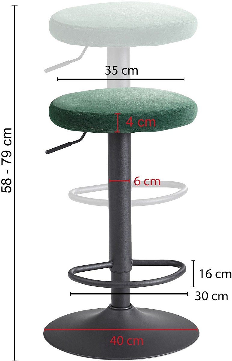 ABMESSUNGEN ✔ Breite: 40 cm // Höhe: 58 - 79 cm // Tiefe: 40 cm // Sitzhöhe: 58 - 79 cm // Durchmesser Sitzfläche: 35 cm // Maximalbelastbarkeit: 100 kg.