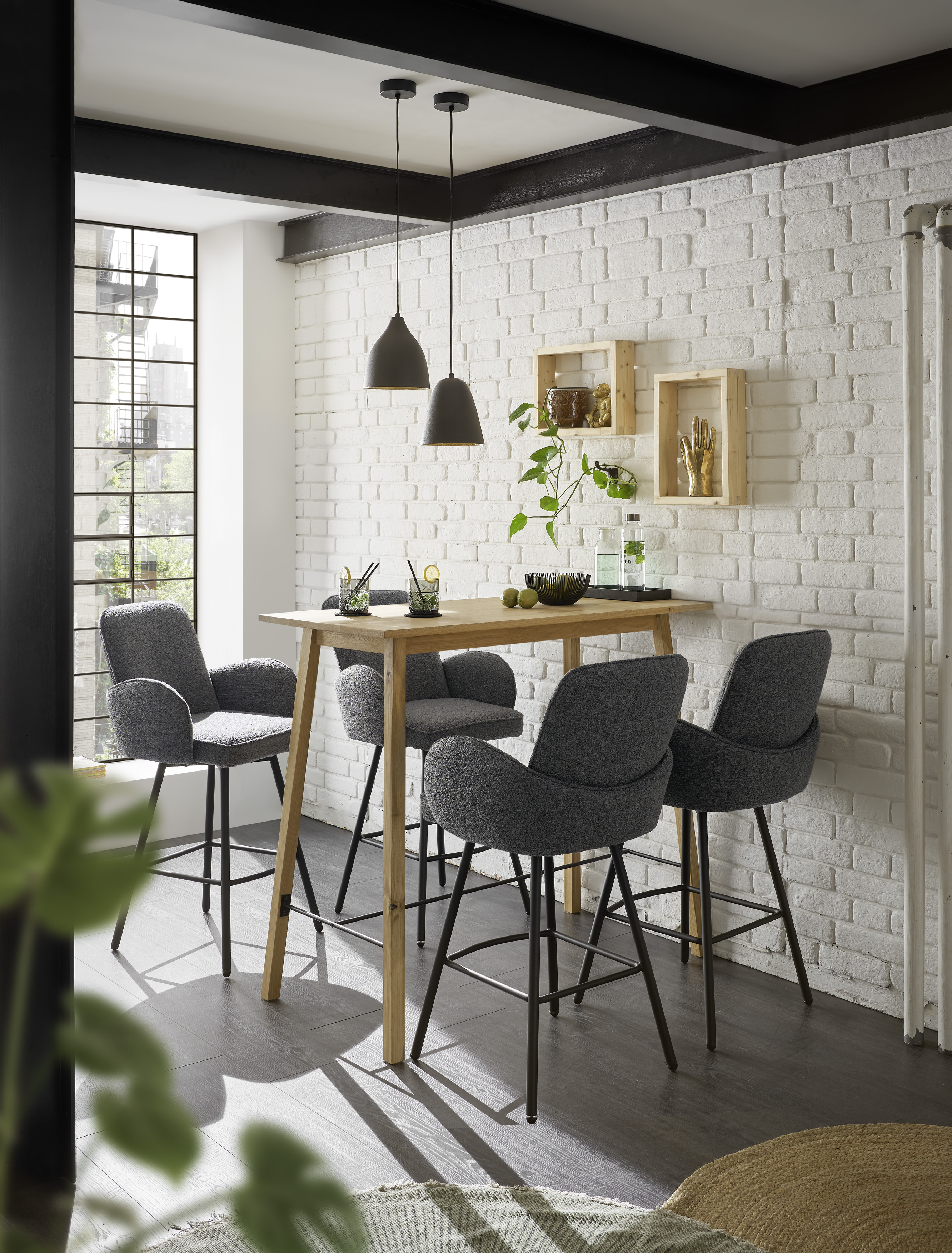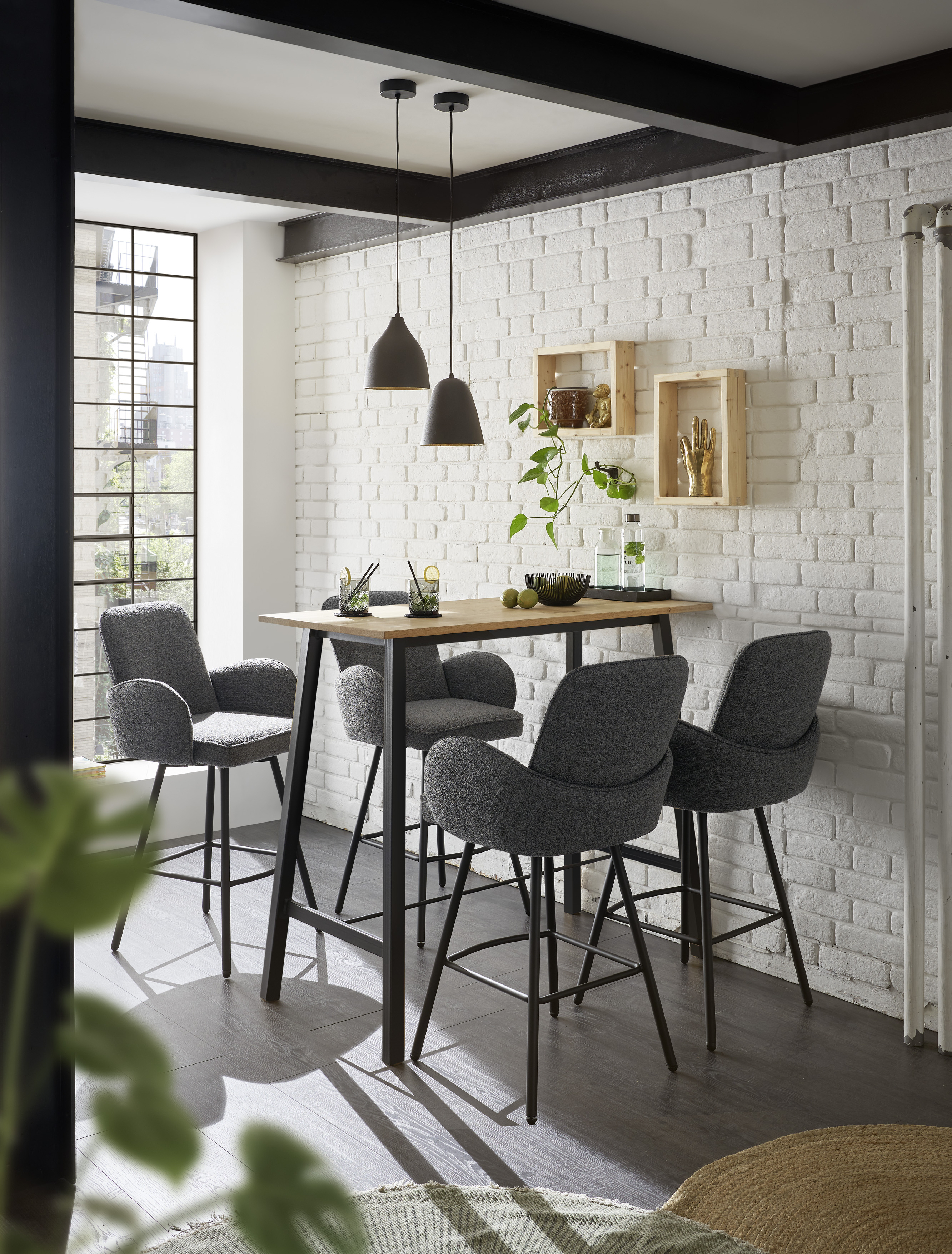Die gepolsterten Sitzflächen sind mit langlebigem Strukturstoff bezogen, bieten eine angenehme Haptik und tragen zu einer einladenden Atmosphäre bei. Das schwarze Metallgestell sorgt für stabilen Stand und langlebige Nutzung. Besonders praktisch ist die 180°‑Drehfunktion mit Auto‑Return, die flexibles Sitzen und komfortables Ein‑ und Aussteigen ermöglicht.