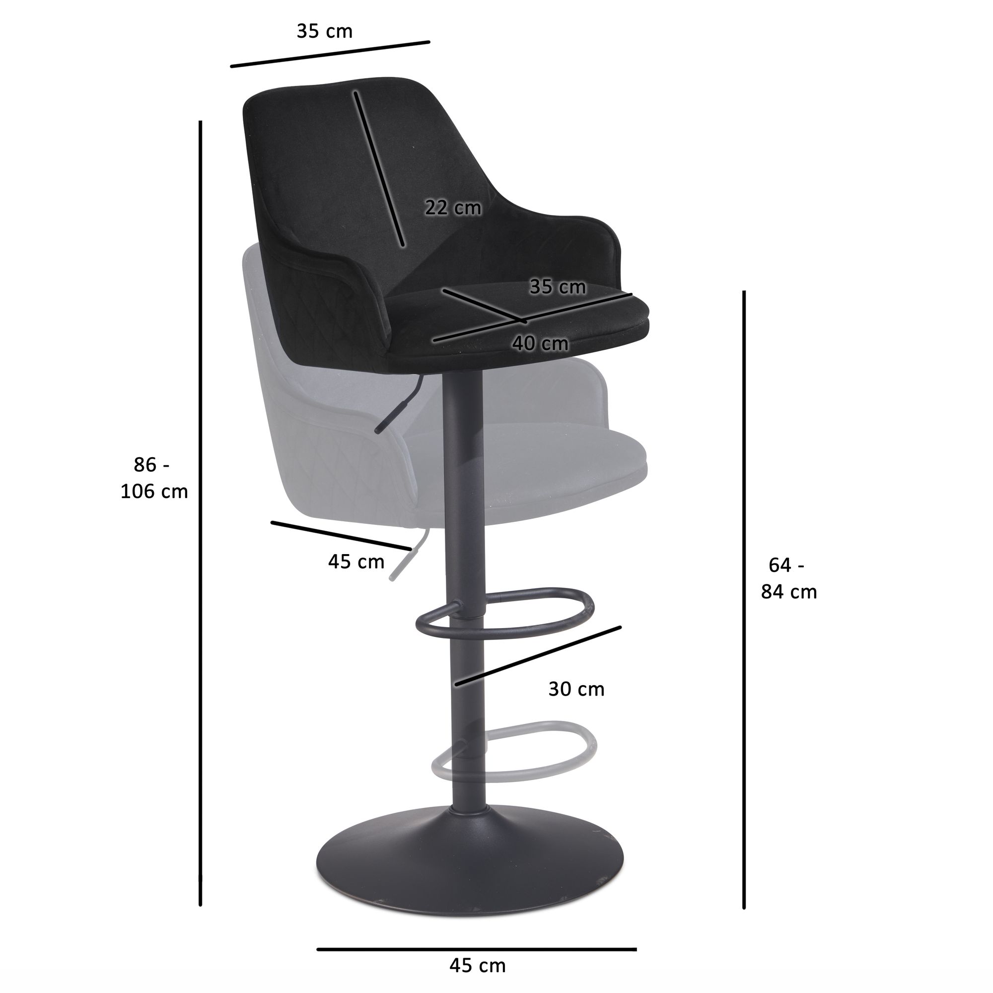 ABMESSUNGEN - Breite: ca. 45 cm // Höhe: ca. 86 - 106 cm // Tiefe: ca. 45 cm // Sitzhöhe: ca. 64 - 84 cm // Sitzfläche (BxT): ca. 40 x 35 cm // Durchmesser Standfläche: ca. 45 cm.