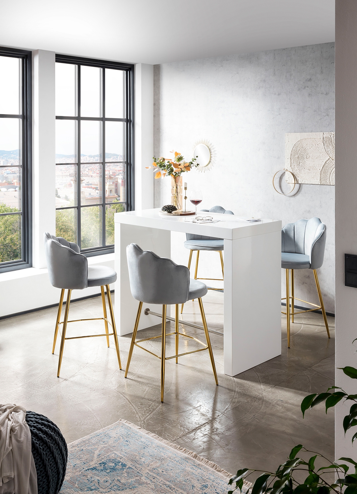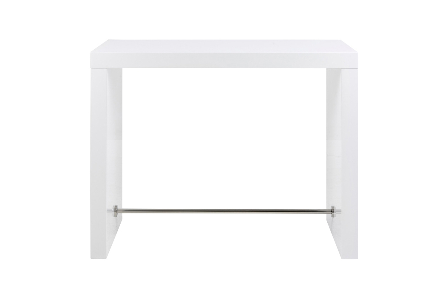 Dieser Bartisch verbindet Funktionalität mit schlichter Eleganz und schafft zusätzliche Steh- oder Sitzmöglichkeit in Küche oder Essbereich. Die weiße Hochglanzoberfläche verleiht dem Tisch nicht nur einen modernen Look, das pflegeleichte MDF macht eine Reinigung zudem spielend leicht. Die Querstrebe aus rostfreiem Stahl verleiht dem Tisch Stabilität, ohne die großzügige Beinfreiheit einzuschränken. Der Tisch kann mit entsprechenden Hockern entweder als Bartisch genutzt werden, oder aber als Stehtisch und Küchentheke.