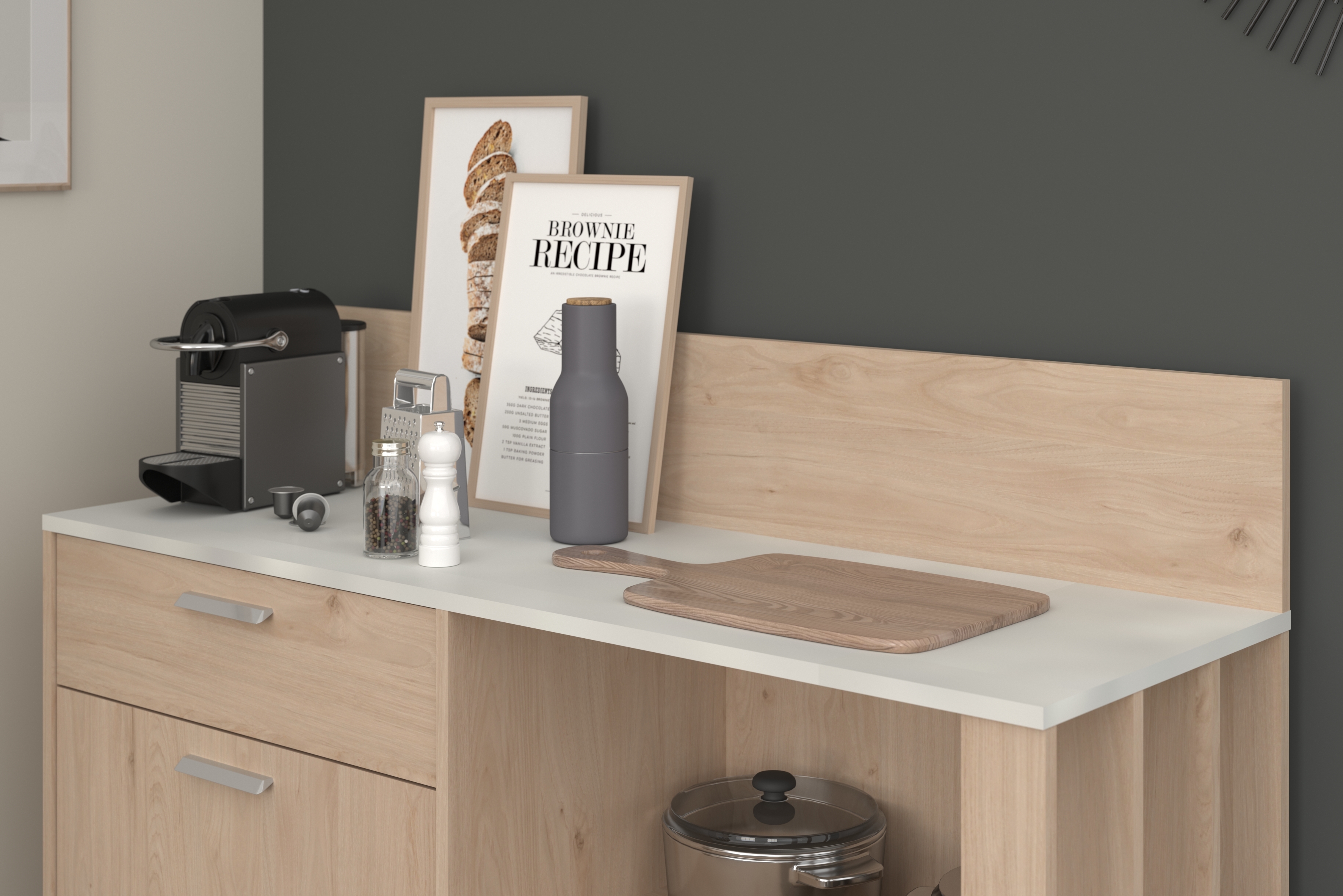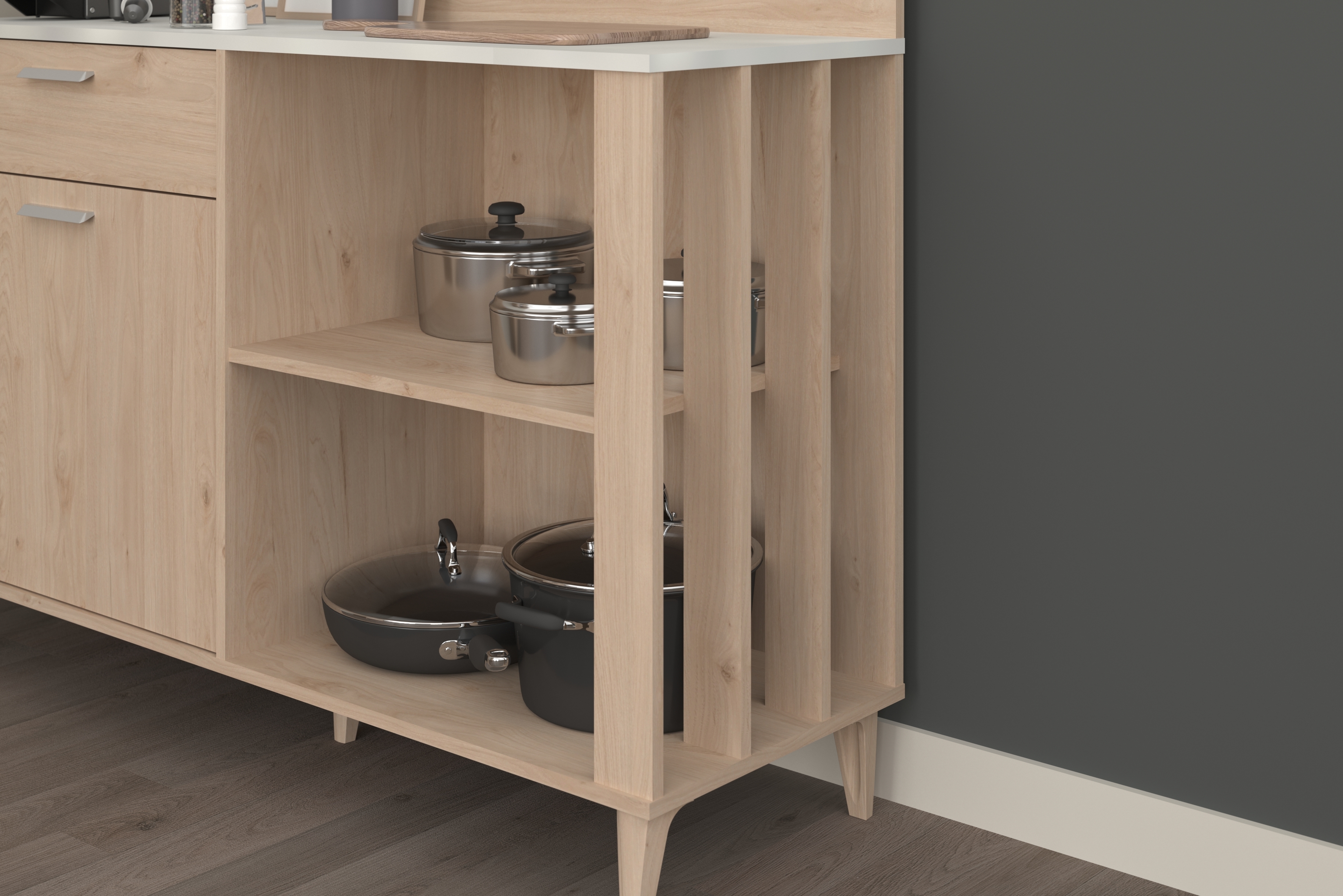Links: 1 Schubkasten, darunter 1 Tür, dahinter 2 Fächer