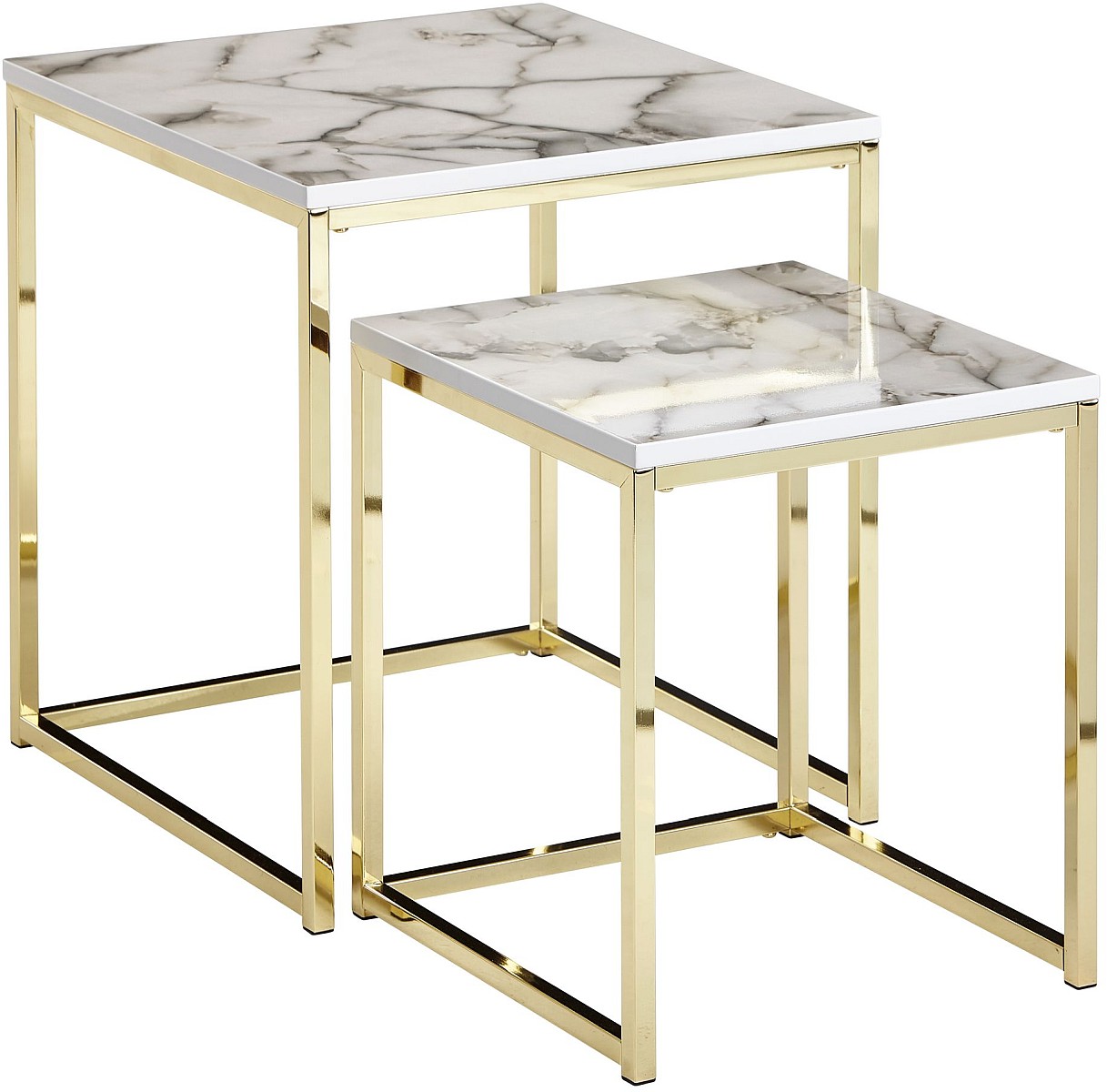 MATERIAL ✔ Tischplatten: Foliertes MDF in weißer Marmor Optik mit schützender PVC-Beschichtung // Gestelle: lackierter Stahl.