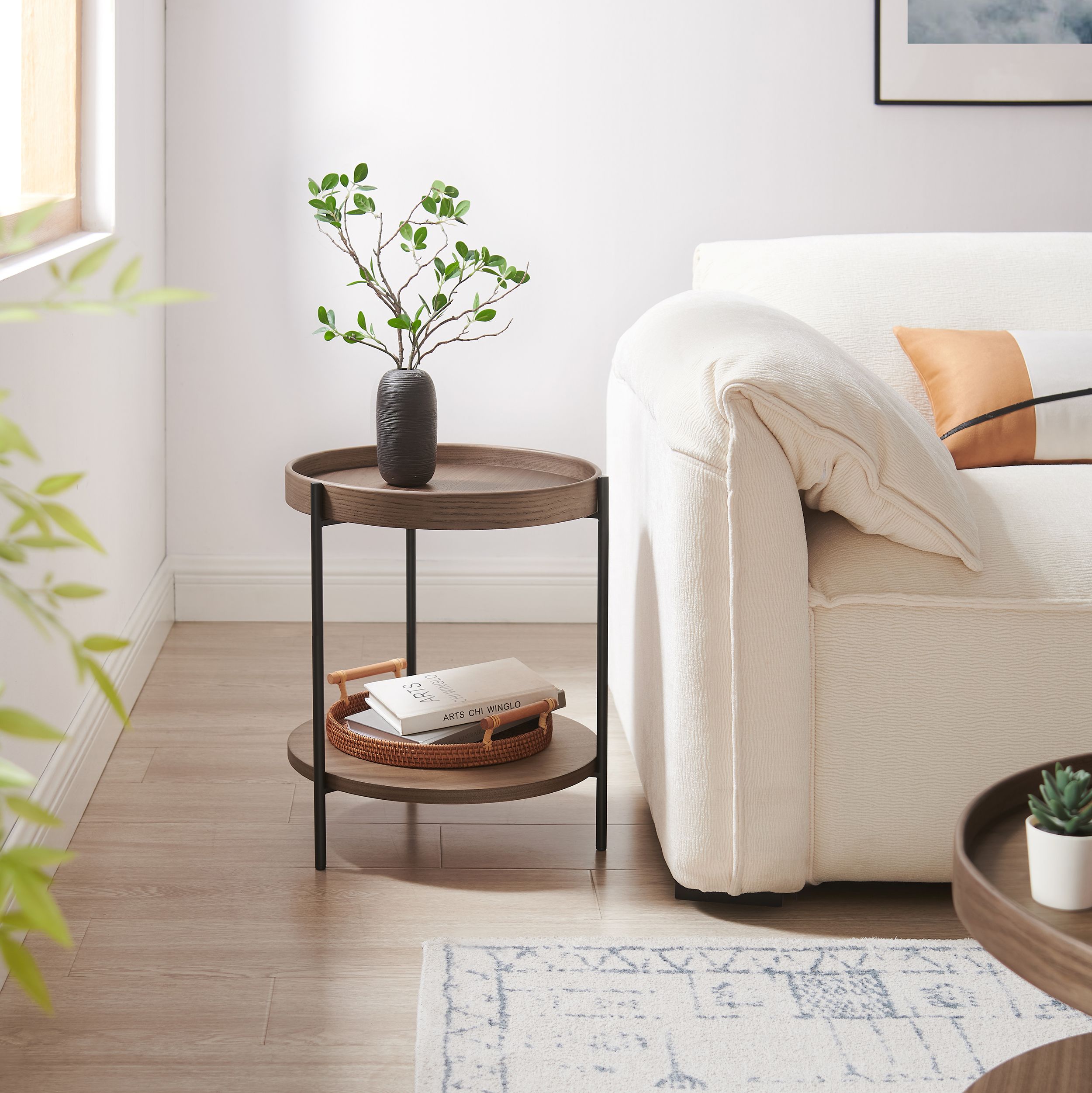 Tischplatte und Ablage: MDF (Mitteldichte Holzfaserplatte) mit Eschenholzfurnier in walnussfarben lackiert
