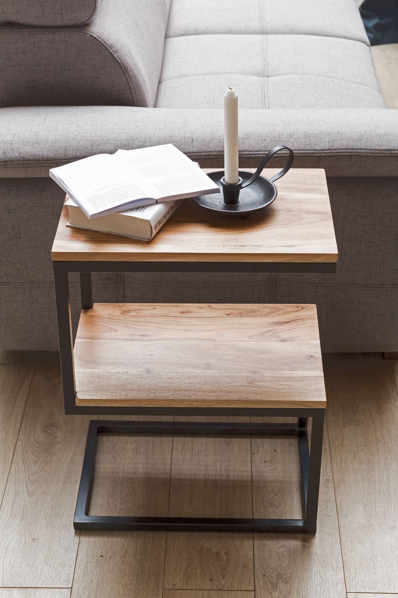 - DESIGN ✔ Moderner Anstelltisch in Form eines \\"S\\" mit Metallgestell und zwei Ablageflächen aus Massivholz