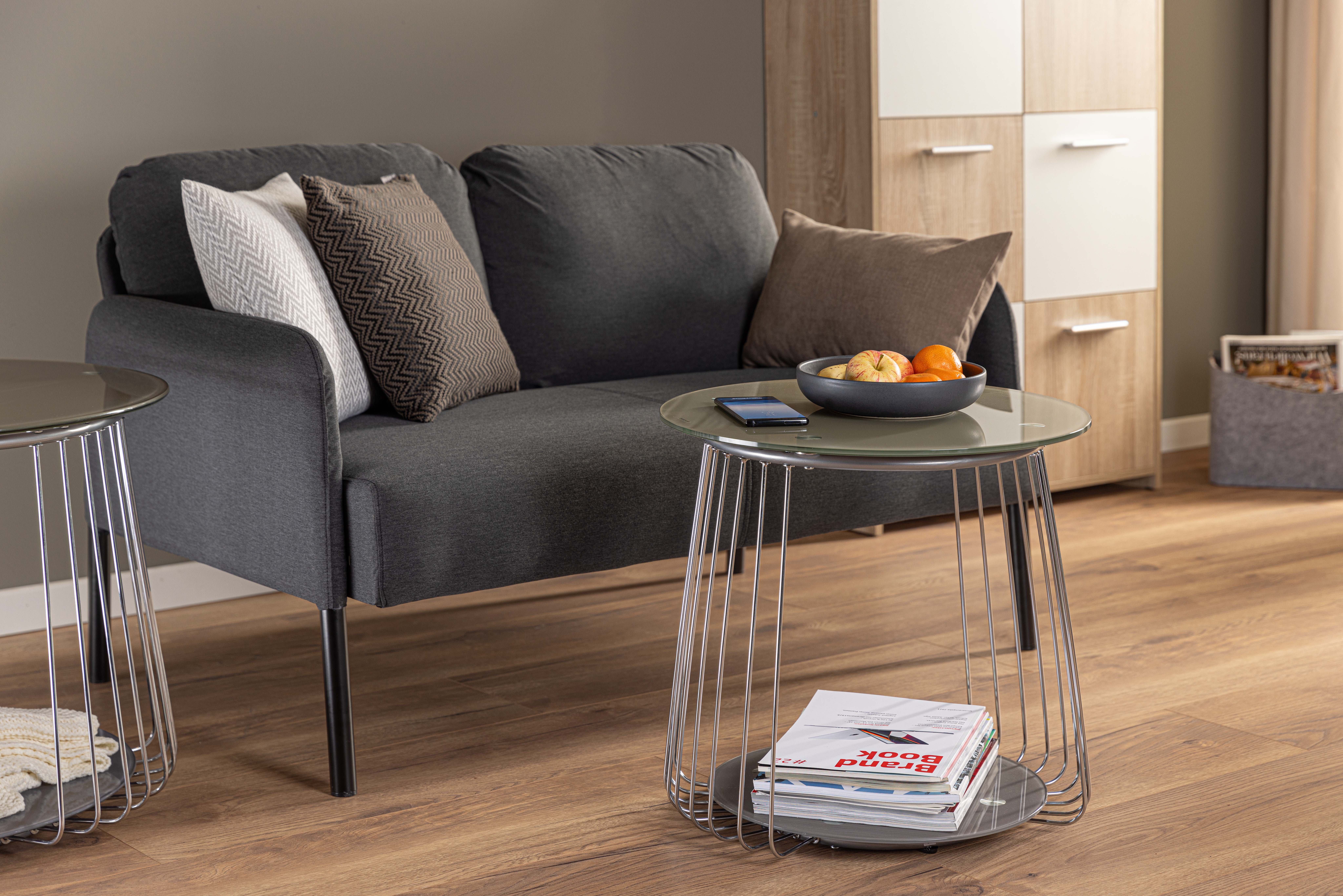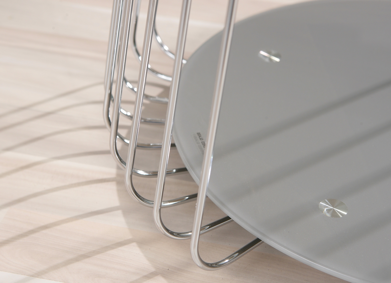 Sein stilvolles Design kombiniert Glas und verchromtes Metall, was ihm einen originellen und modernen Look verleiht. Der Tisch ist solide verarbeitet und verfügt über zwei runde Tischplatten mit einem Durchmesser von 50 cm aus satiniertem Sicherheitsglas.