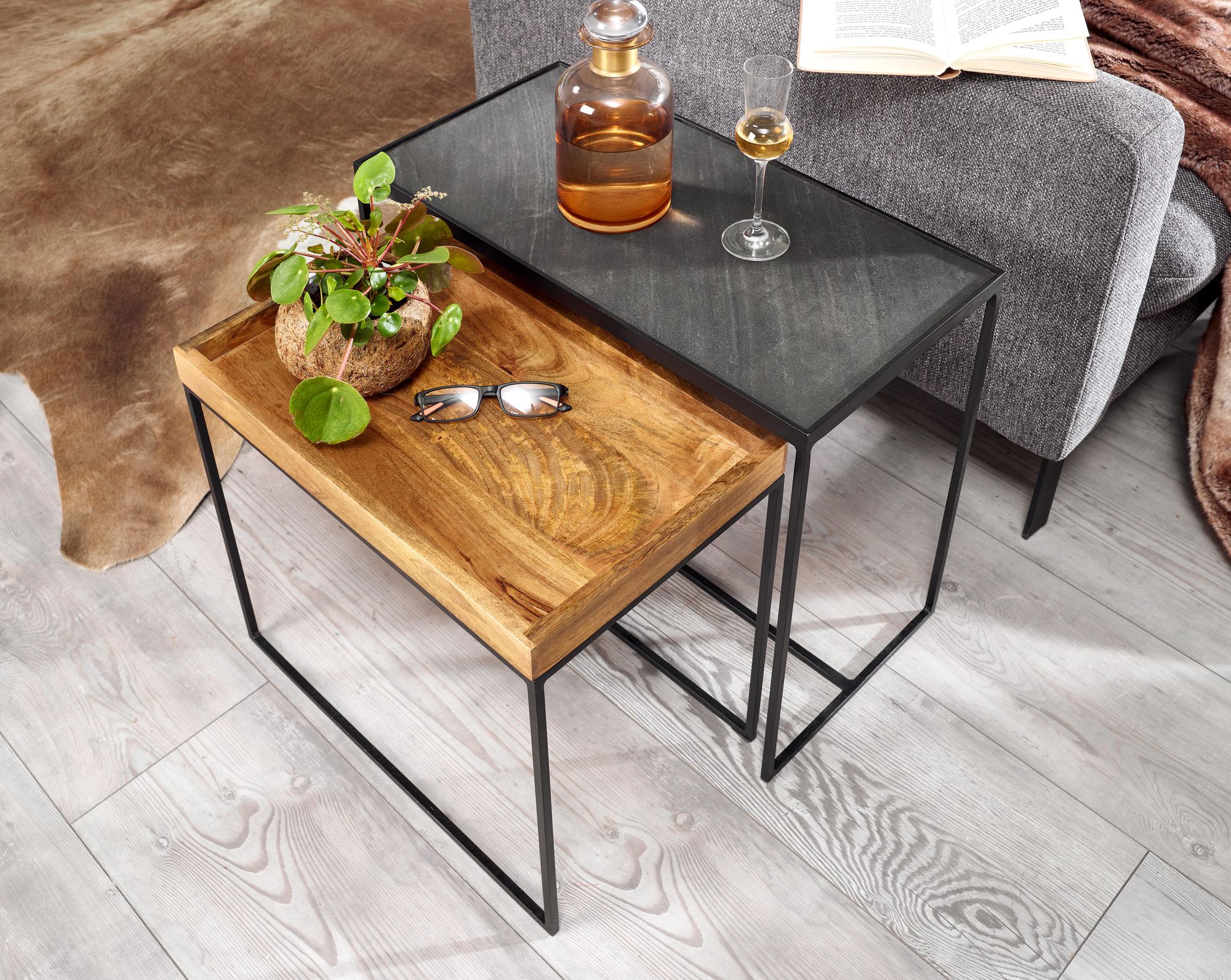 Tischplatten: MDF (Mitteldichte Holzfaserplatte) grau / Mango massiv (Indien)