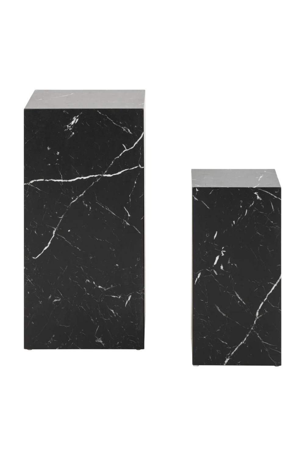 Dieses schicke Beistelltisch 2er Set lässt Ihr Wohnzimmer gleich viel edler wirken. Die schlichte Würfelform mit viel Fläche bringt die tolle schwarze Marmoroptik besonders zur Geltung. Der Beistelltisch ist vielseitig einsetzbar, nicht nur neben der Couch, sondern auch als Nachttisch oder als freistehender Blickfang. Die unterschiedlichen Höhen können entweder stilvoll nebeneinander platziert werden oder je nach Bedarf an verschiedenen Stellen im Wohnraum einzeln Einsatz finden. Auch als Blumen- oder Accessoirehocker wird das Set zum stylischen Blickfang in Ihrem Zuhause.