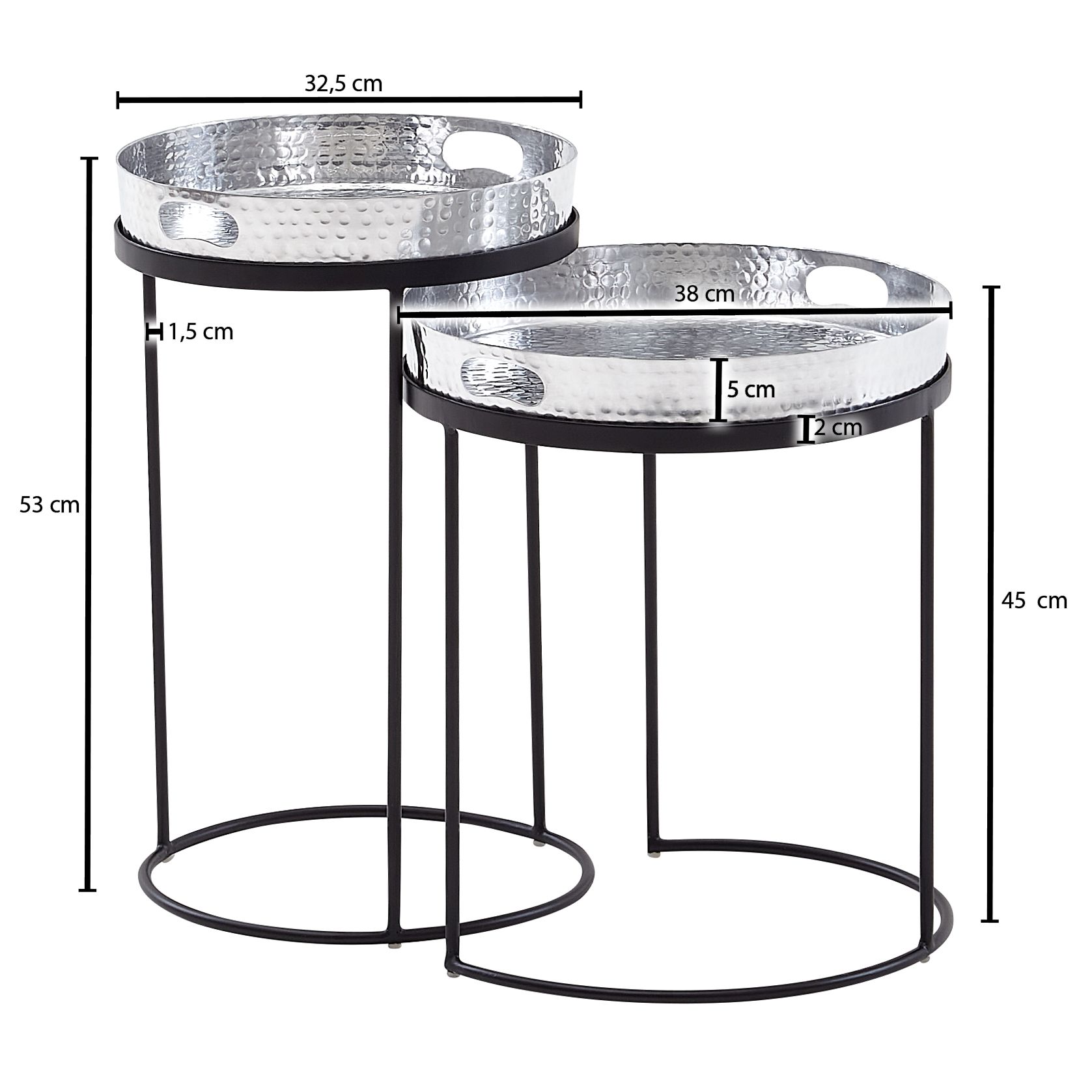 MATERIAL ✔ Die Tischplatten bestehen aus silberfarben lackiertem Aluminium. Die Gestelle sind aus lackiertem Eisen.