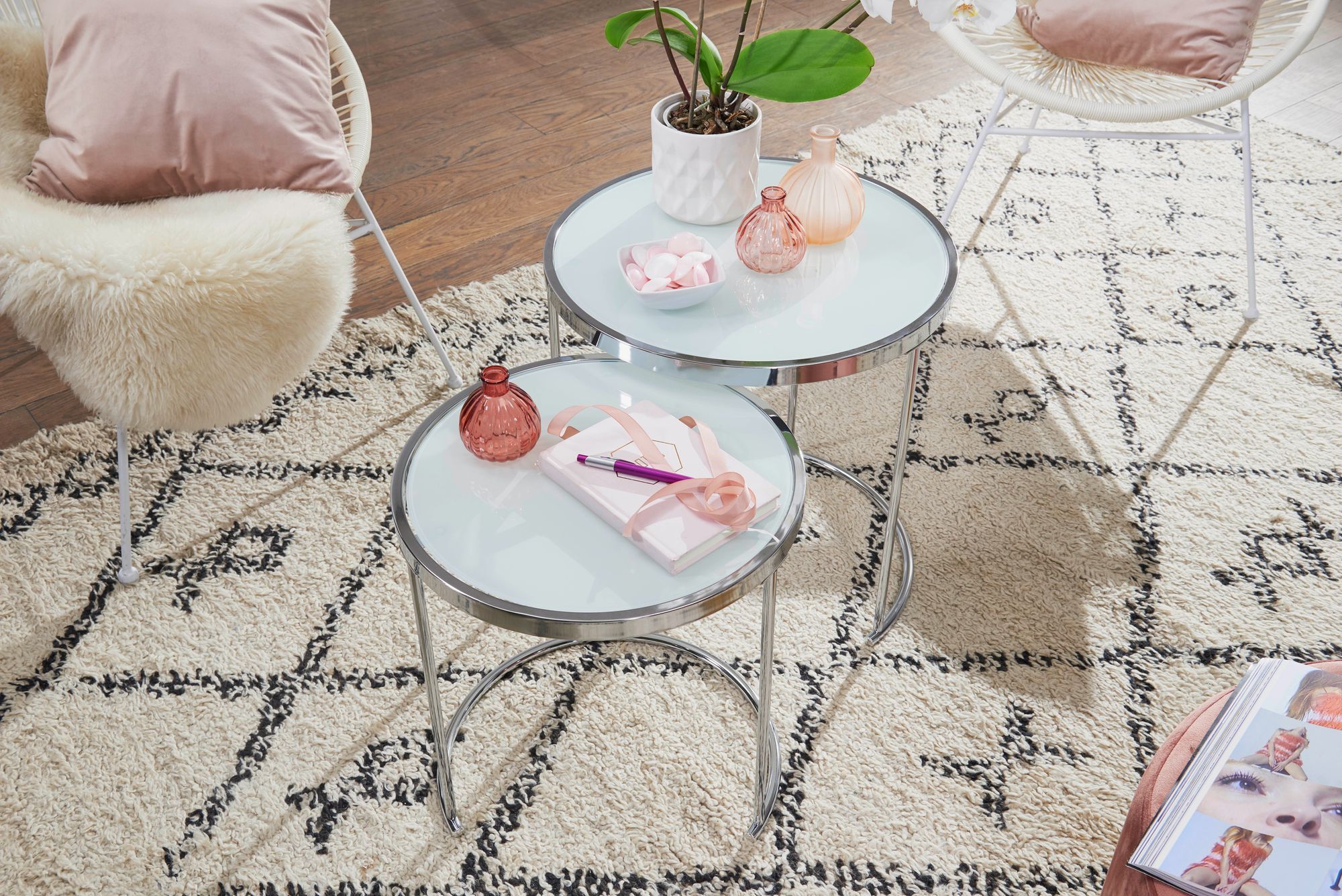 - MATERIAL ✔ Die Tischplatten der Couchtische bestehen aus weißem Einscheiben-Sicherheitsglas. Das Gestell ist aus verchromtem Metall.