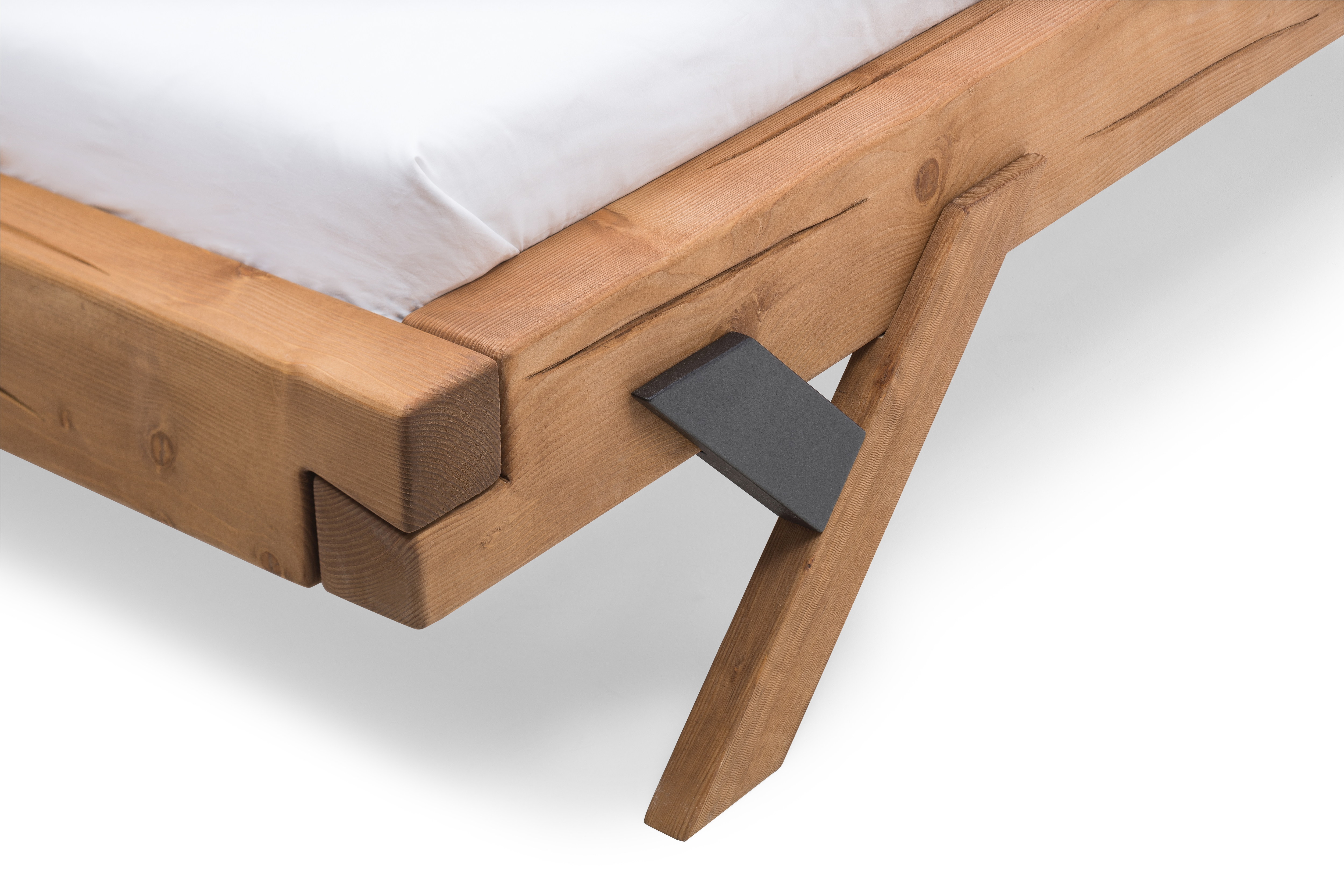 Mit diesem rustikalen Balkenbett aus hochwertigem Massivholz zieht urige Gemütlichkeit in das heimische Schlafzimmer ein. Das robuste Bettgestell aus massivem Fichtenholz bringt eine geballte Ladung Natur nach Hause und sorgt für Stabilität und Langlebigkeit. Fichtenholz ist dank seiner lebhaften Struktur eine beliebte Wahl für Massivholzmöbel. Wuchsrisse und Astlöcher im Holz machen das Bett zum faszinierenden Einzelstück mit markanter Ausstrahlung. Ein besonderer Hingucker bei diesem Balkenbett sind die charakteristischen Eckverbindungen. Diese unterstreichen nicht nur die solide Optik des Bettes, sie sorgen auch für höchste Belastbarkeit. Für einen modernen Twist sorgt das Gestell mit Y-Beinen und schwarzen Farbabsetzungen. Der massive Look des Holzbettes wird zudem durch schräge Unterbrechungen im komfortabel geneigten Kopfteil aufgelockert. Das solide Bett vereint auf charmante Weise den modernen Stil und traditionelle Fertigungsweise in einem langlebigen Möbelstück. Mit diesem Balkenbett zieht ein besonders pflegeleichtes Möbelstück in die eigenen vier Wände. Die geölte Oberfläche ist sehr pflegeleicht, strapazierfähig und schützt das Holz vor Staub und Verschmutzungen. Kleinere Verschmutzungen mit einem angefeuchteten Tuch abwischen.