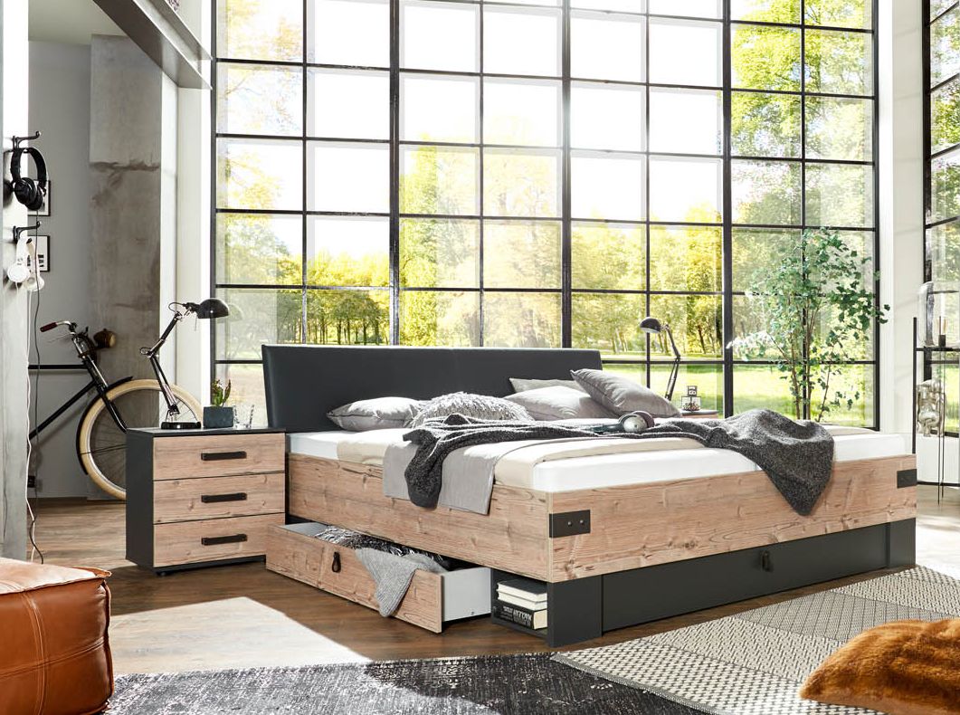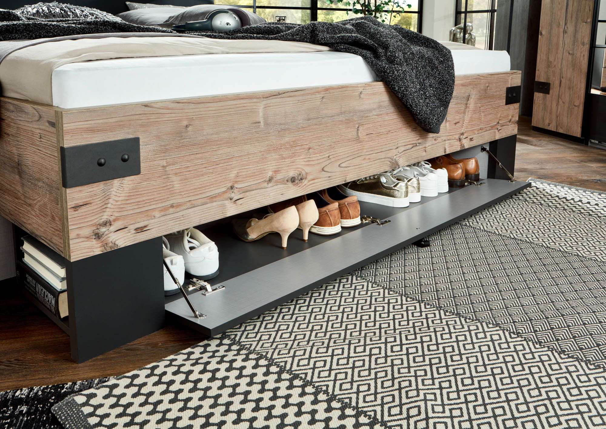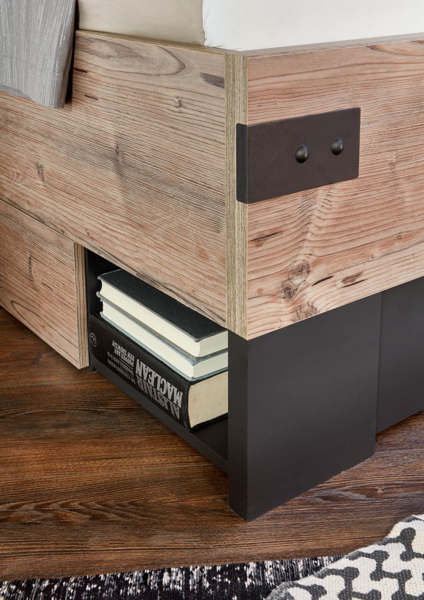 1 Bettrahmen inklusive 2 Bettschubkästen und 1 klappbares Fach am Fußteil