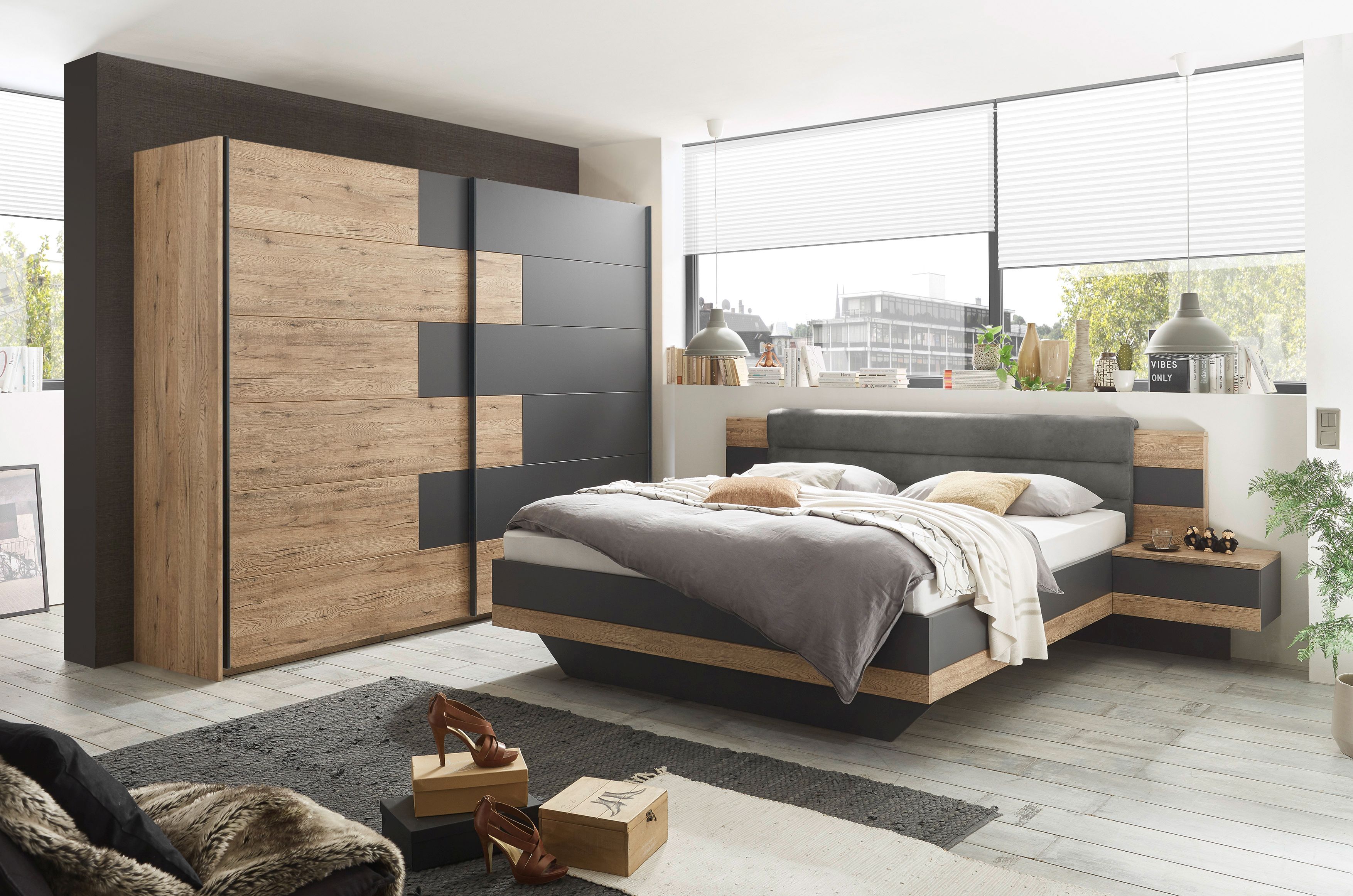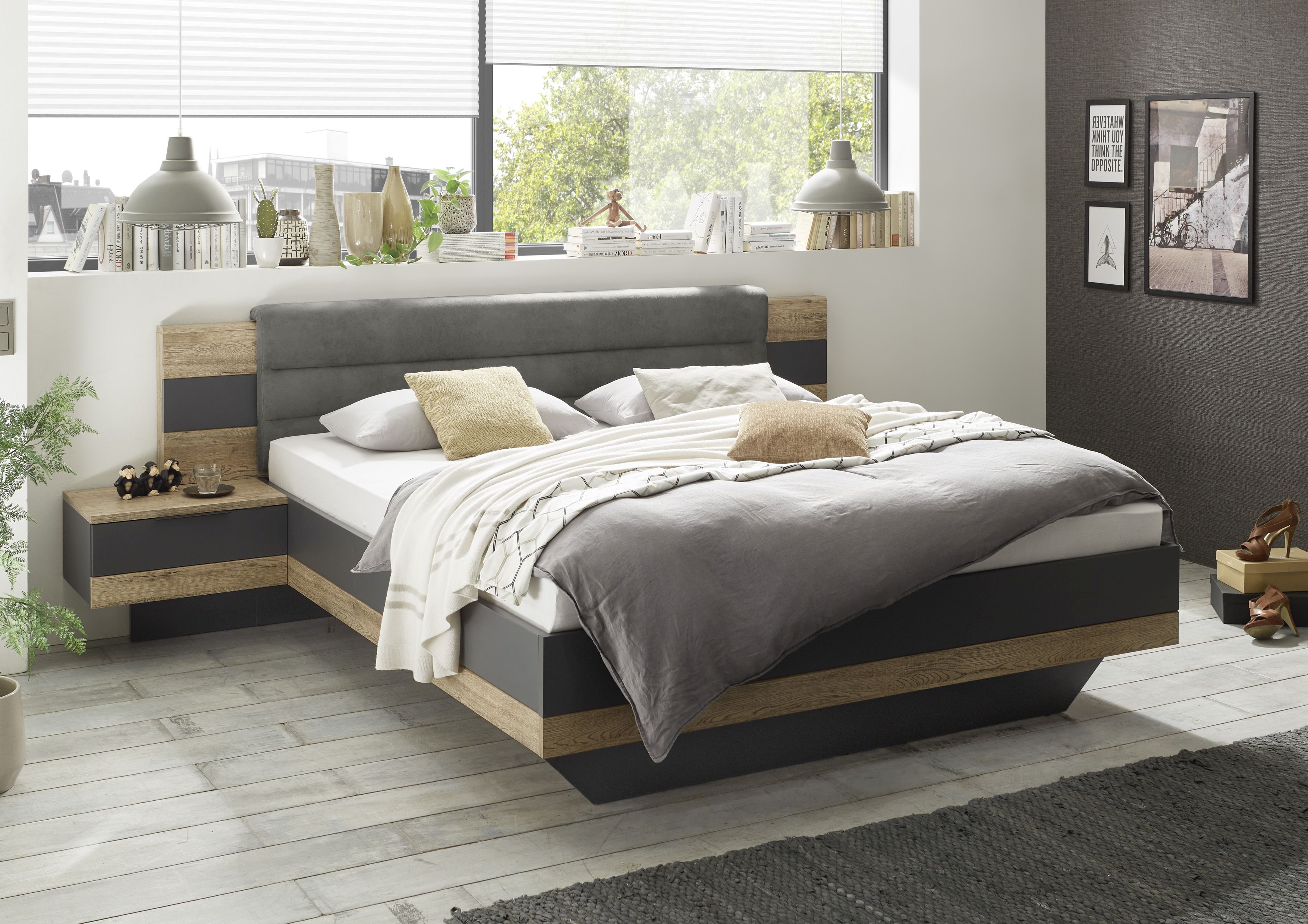 LINEA Stilvolle Doppelbett Bettanlage 180 x 200 cm mit 2x Nachtkommoden - Schlafzimmer Komplett-Set in Bartex Eiche Optik, Graphit - 296 x 97 x 210 cm (B/H/T)