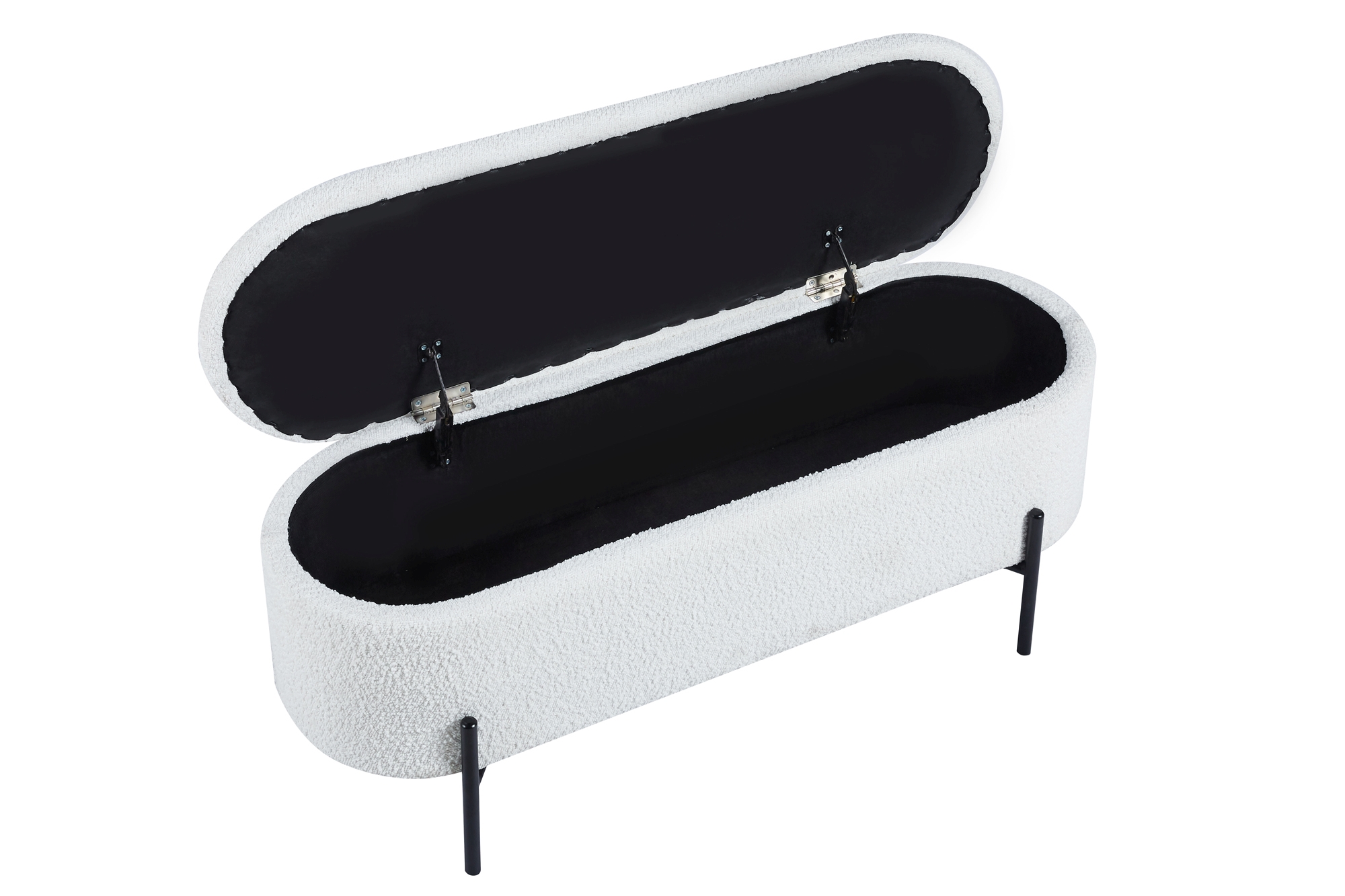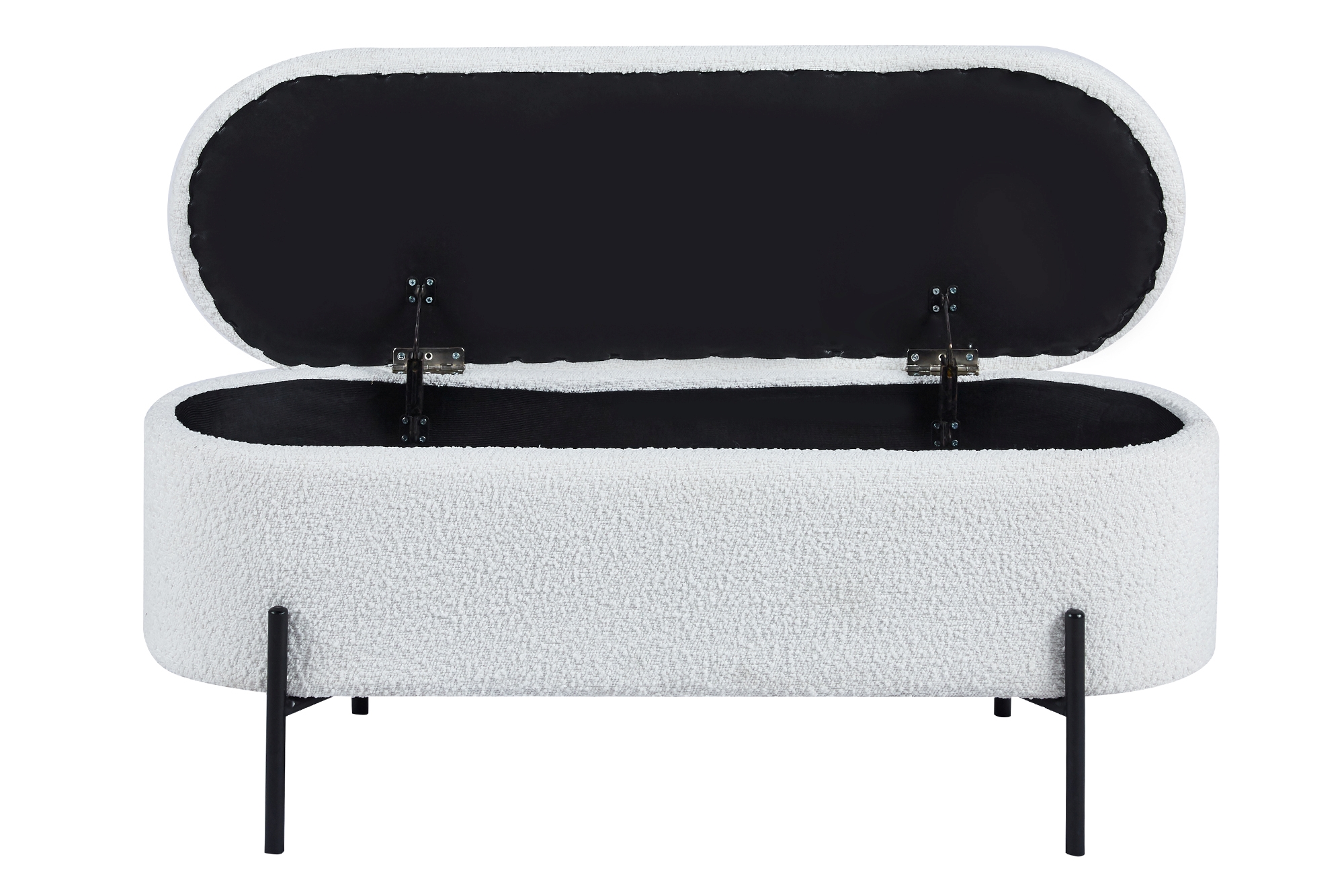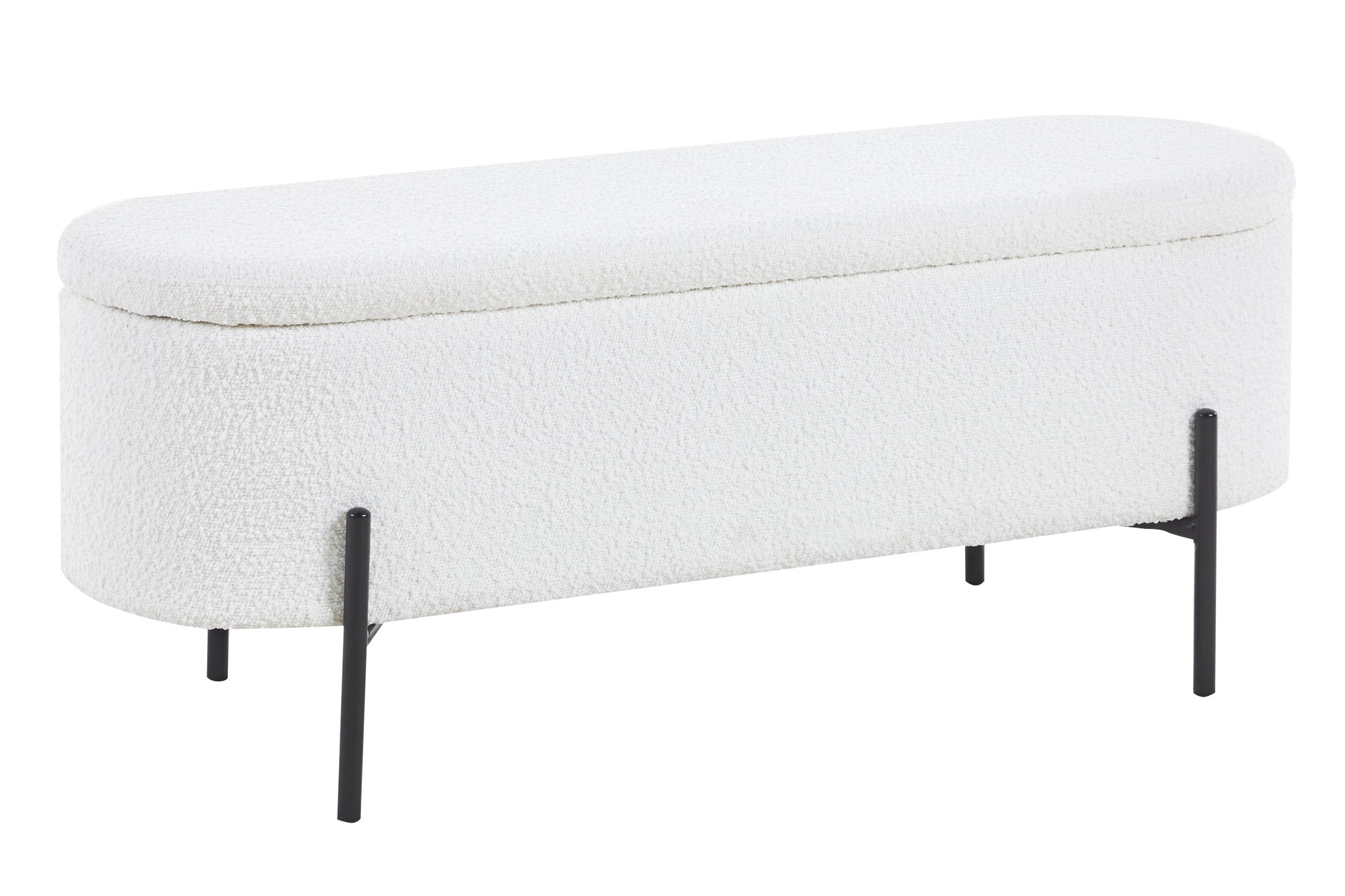 Wer skandinavisches Design mit praktischem Nutzen sucht, für den ist diese Bettbank mit angesagtem Bouclé Bezug die richtige Wahl. Der Polsterhocker punktet nicht nur mit topaktuellem Design, sondern bietet hinter dem klappbaren Deckel auch eine clevere Stauraumfunktion. Ob Decken, Bettbezug oder Kleidung – In der Bettbank können Sie auf stilvolle Weise Ordnung schaffen und Herumliegendes verstauen. Der Bouclé Stoff, der schon lange Einzug in unsere Wohn- und Schlafzimmer gehalten hat, vermittelt Wärme und Geborgenheit. Außerdem spiegelt der Stoff mit seiner wolligen Optik die Essenz des beliebten Scandi Styles gekonnt wider. Das Design-Gestell mit hohen Füßen besteht aus pulverbeschichtetem schwarzem Metall und rundet den Look ab.
