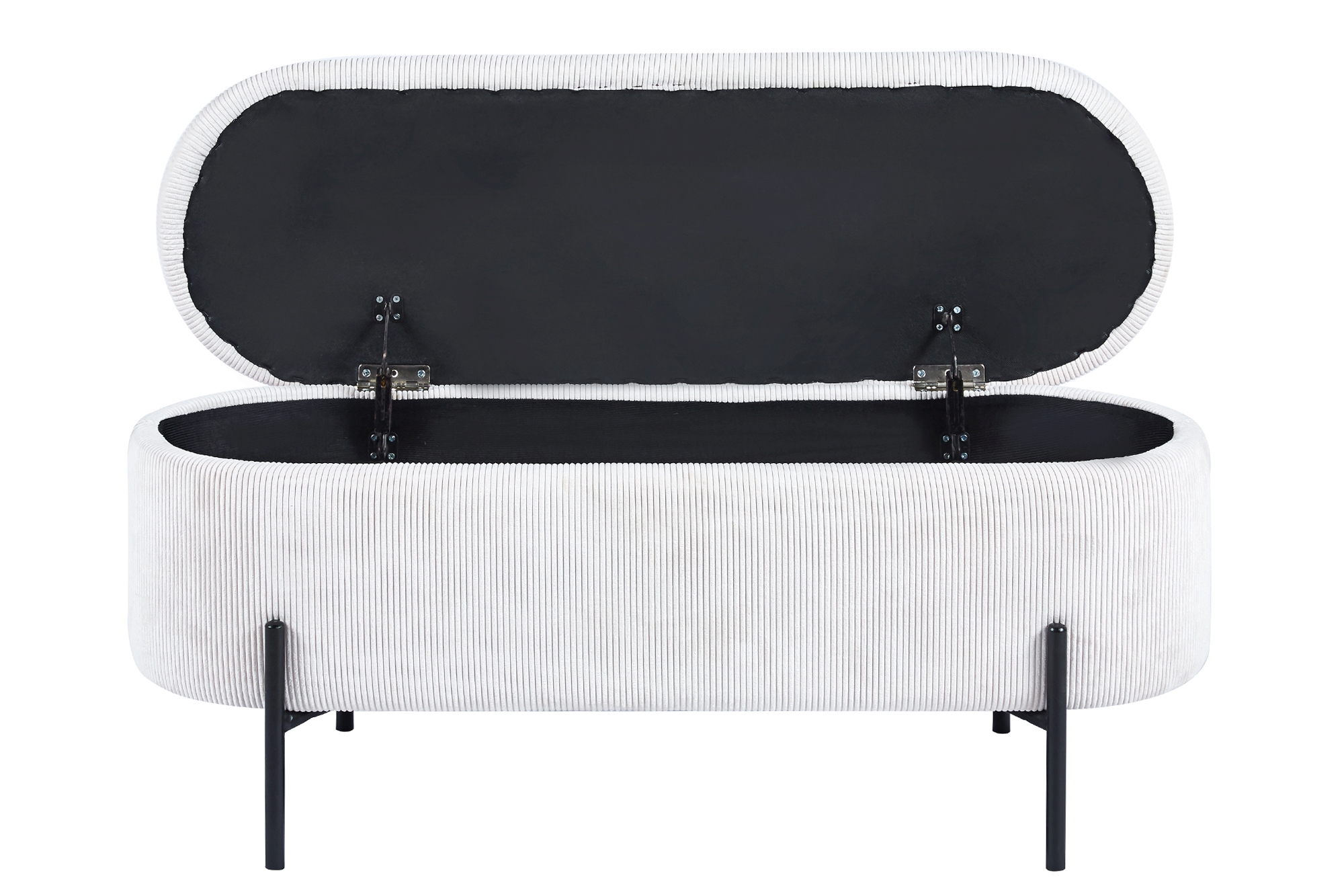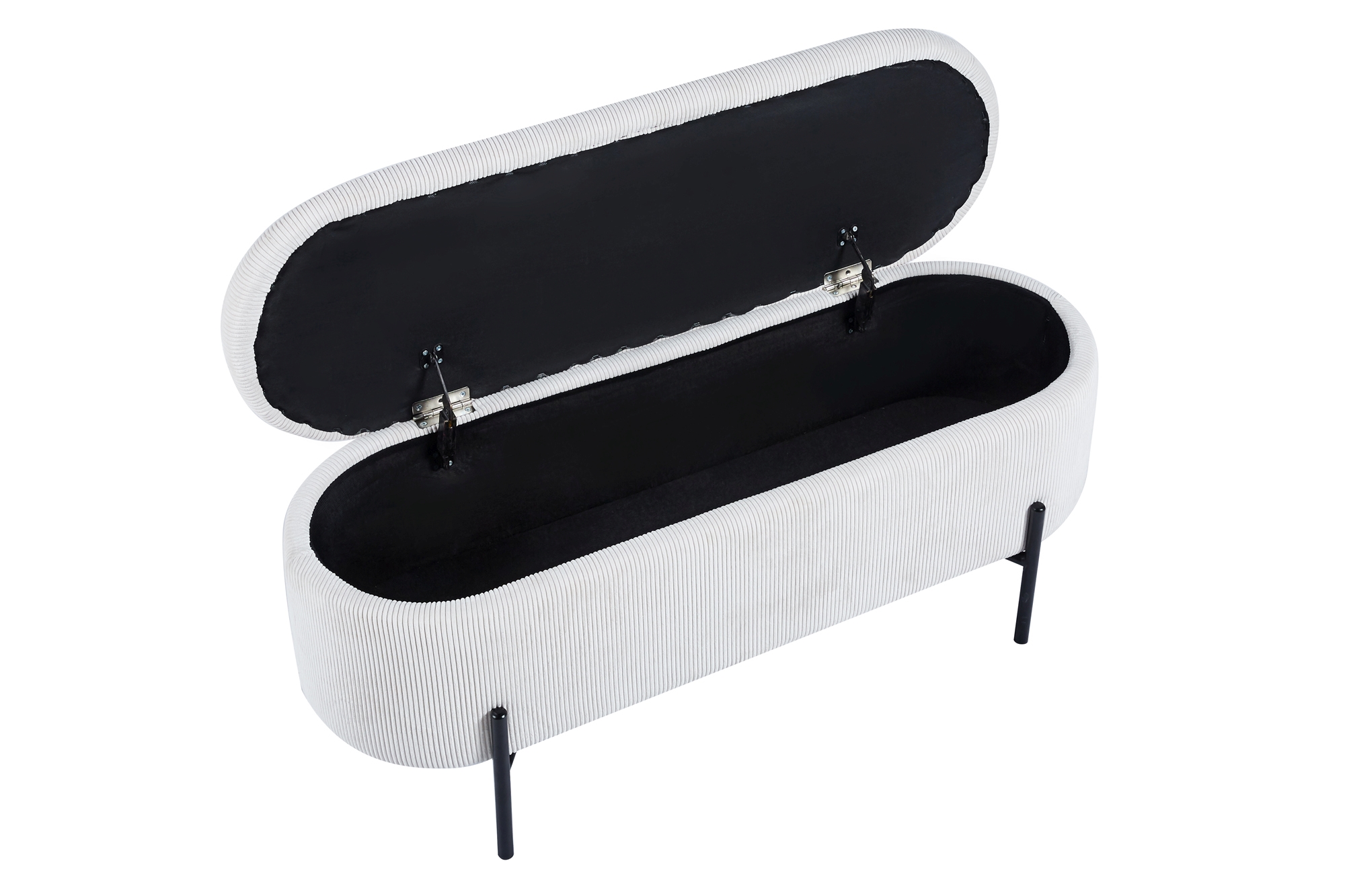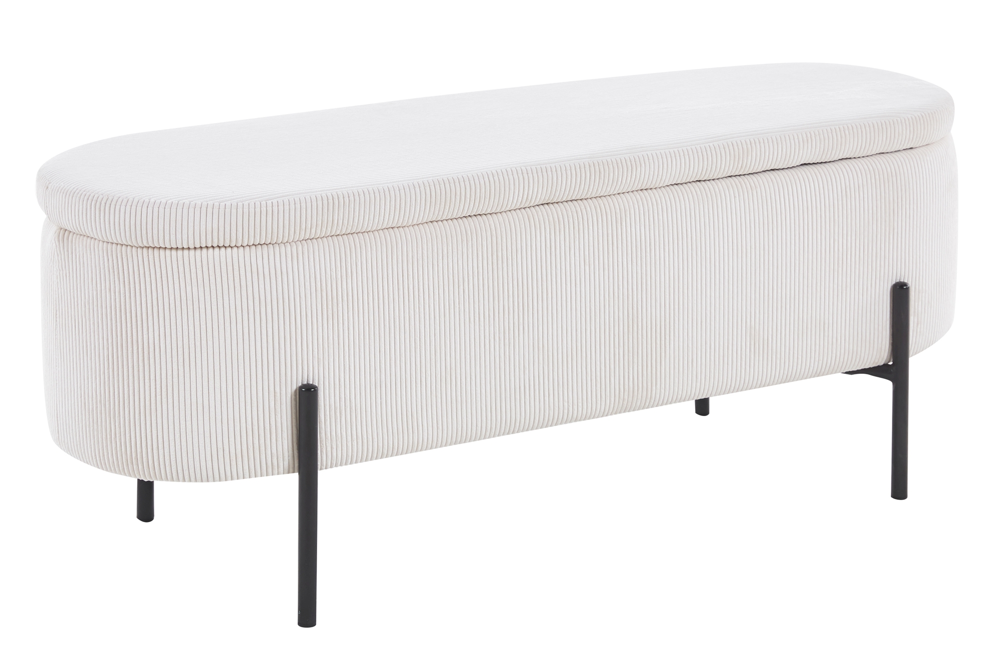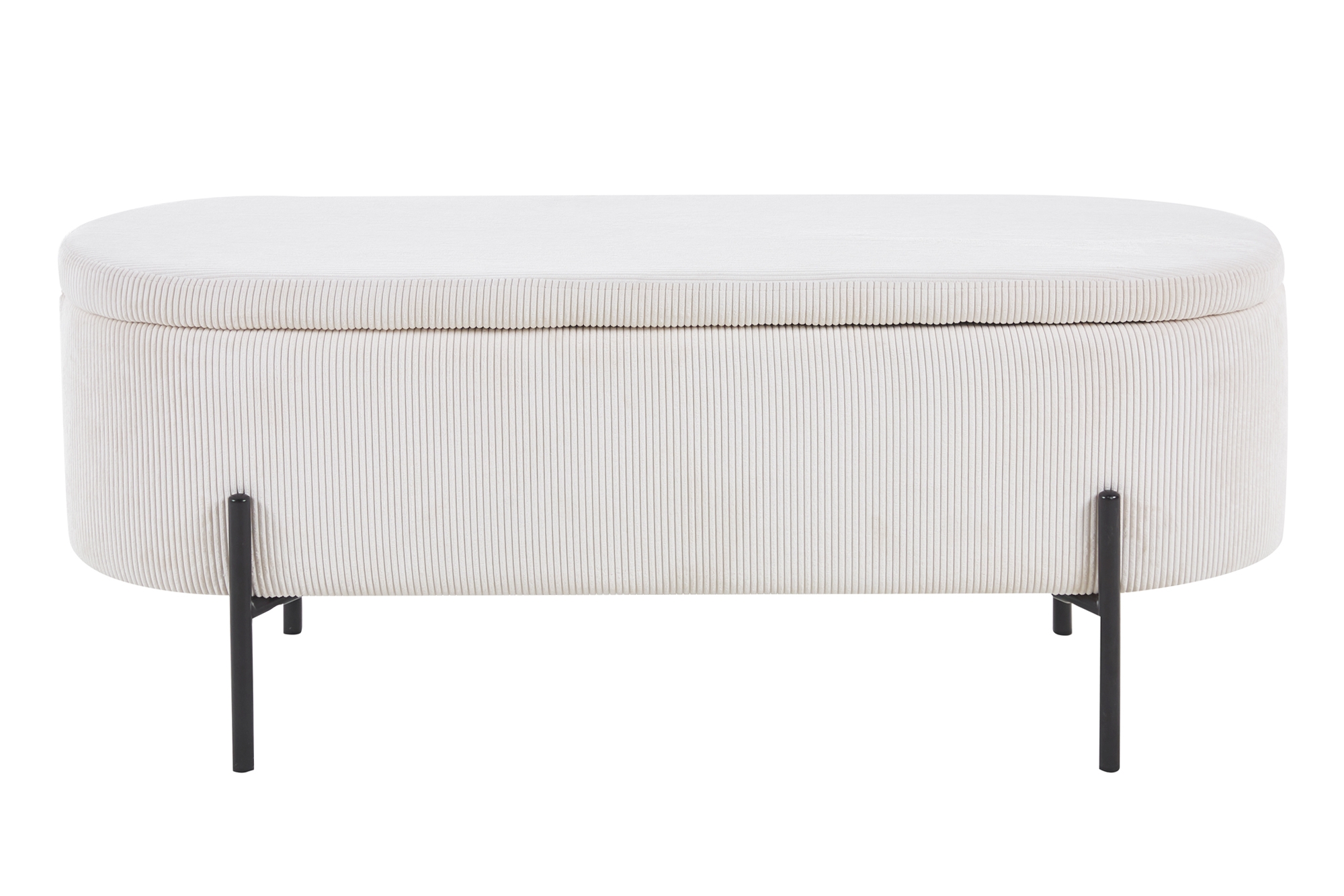 Wer skandinavisches Design mit praktischem Nutzen sucht, für den ist diese Bettbank mit angesagtem Cord Bezug die richtige Wahl. Der Polsterhocker punktet nicht nur mit topaktuellem Design, sondern bietet hinter dem klappbaren Deckel auch eine clevere Stauraumfunktion. Ob Decken, Bettbezug oder Kleidung – In der Bettbank können Sie auf stilvolle Weise Ordnung schaffen und Herumliegendes verstauen. Der weiche Cord-Stoff verleiht der Bettbank einen modernen Look und sorgt mit seinen charakteristischen Nähten für eine interessante Optik. Das Design-Gestell mit hohen Füßen besteht aus pulverbeschichtetem schwarzem Metall und rundet den Look ab.