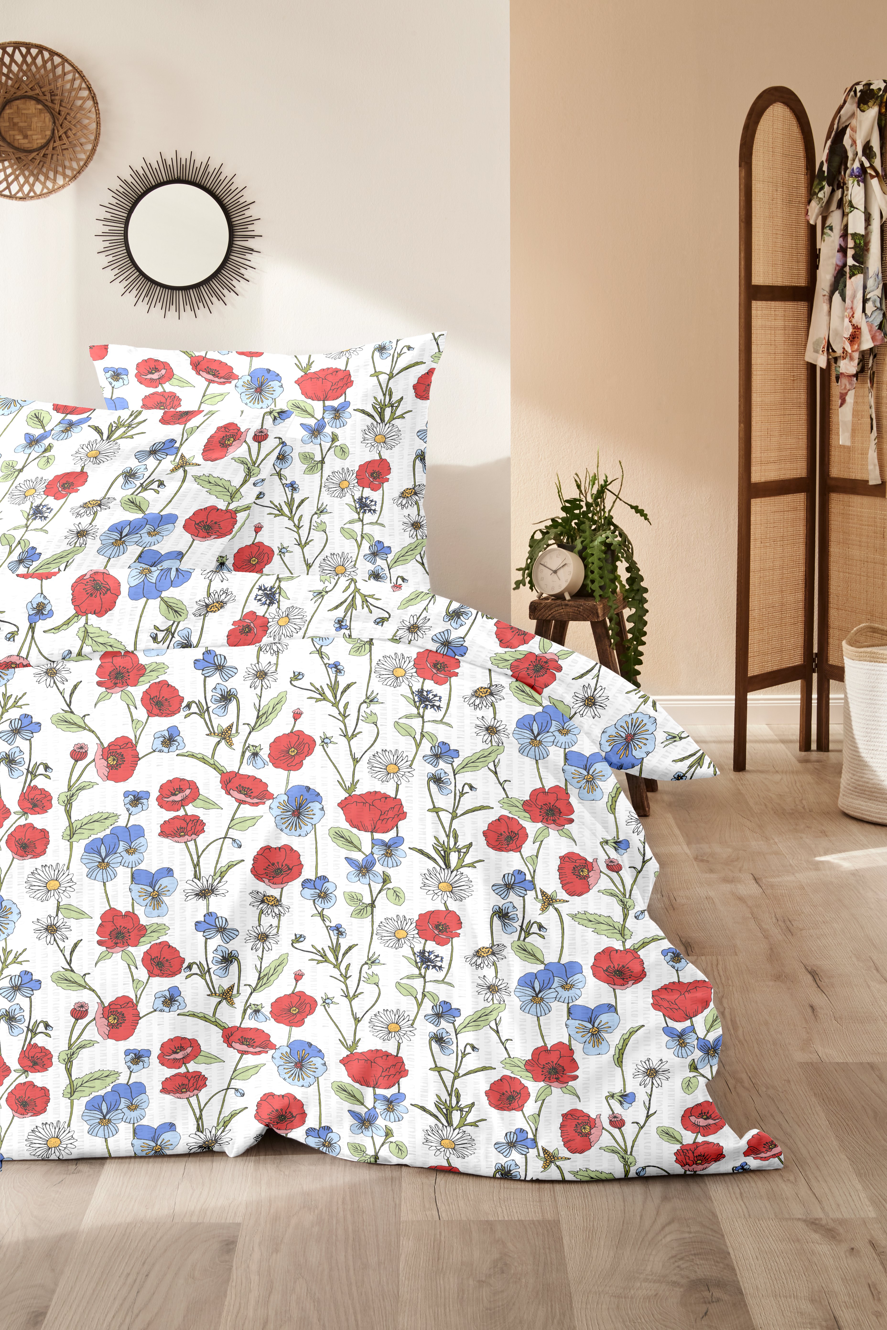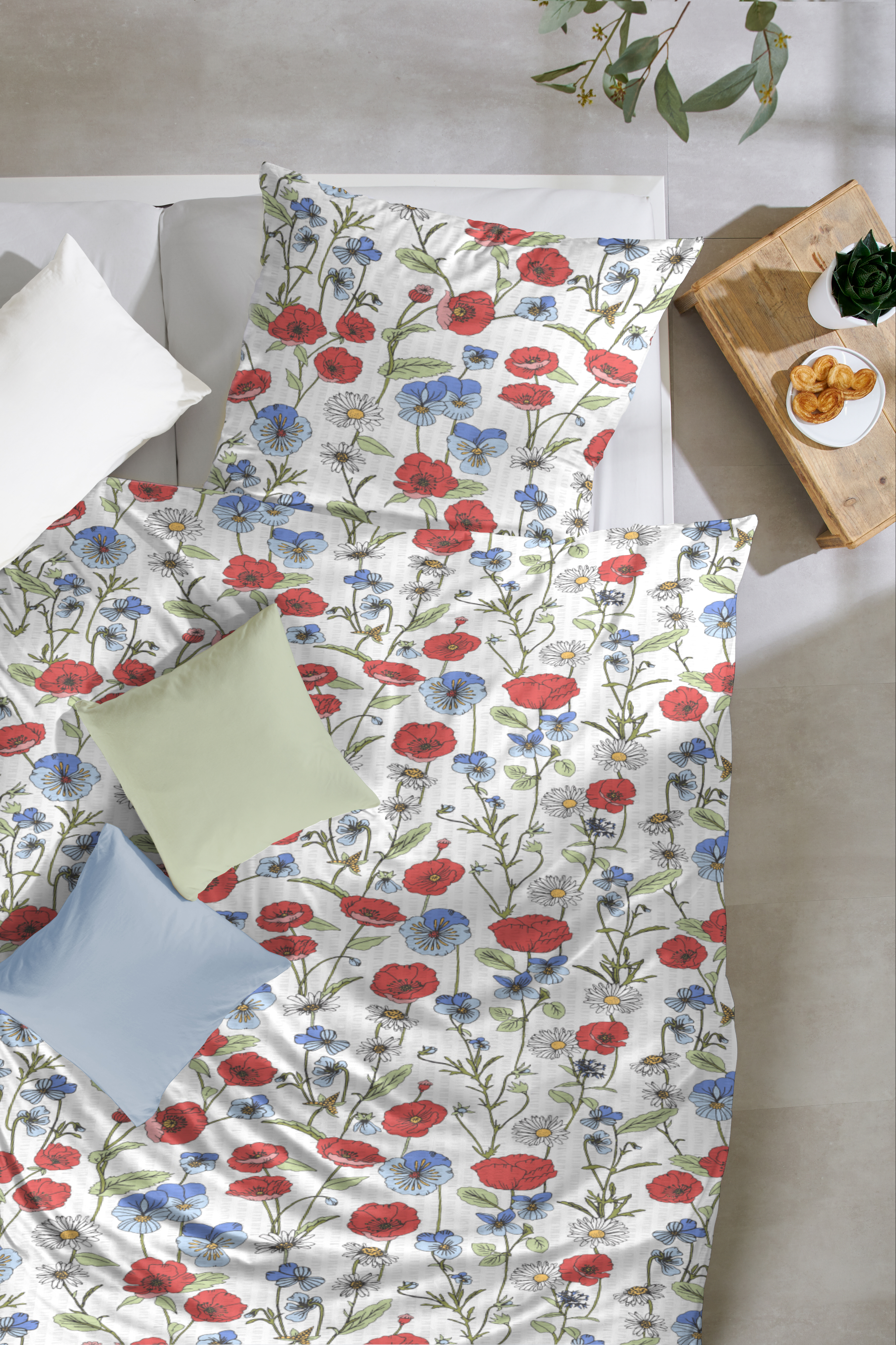 Farbe: blau, weiß, rot mit Mohnblumenmotiv