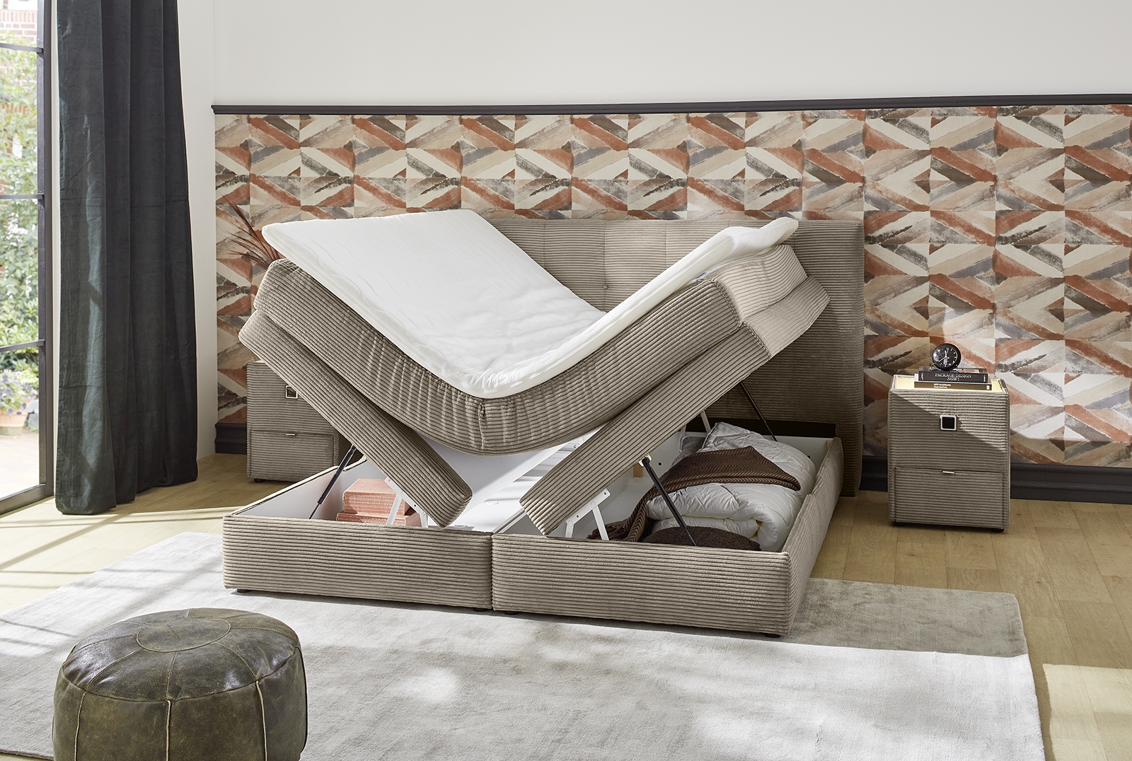2 Bettkästen; für ein leichtgängiges Öffnen und Schließen werden Gasdruckfedern eingesetzt, so dass der Bettkasten ohne großen Kraftaufwand genutzt werden kann
