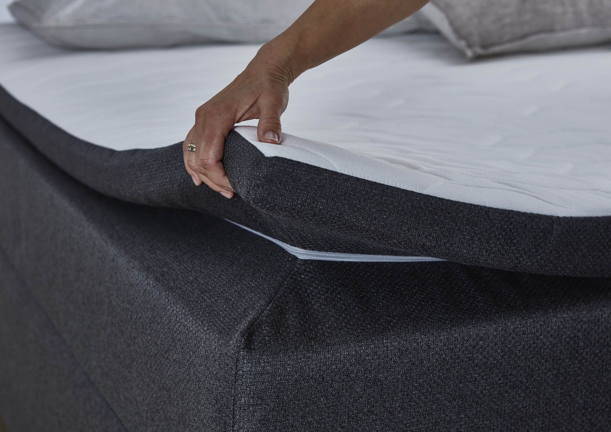 Durchhgehende Topper-Schaumplatte aus ca. 6 cm PU-Komfortschaum (25 kg/m³), mit einseitigem Noppenprofil (Zur Veränderung des Liegekomforts kann die Topper-Schaumplatte innerhalb der Hülle gewendet werden).