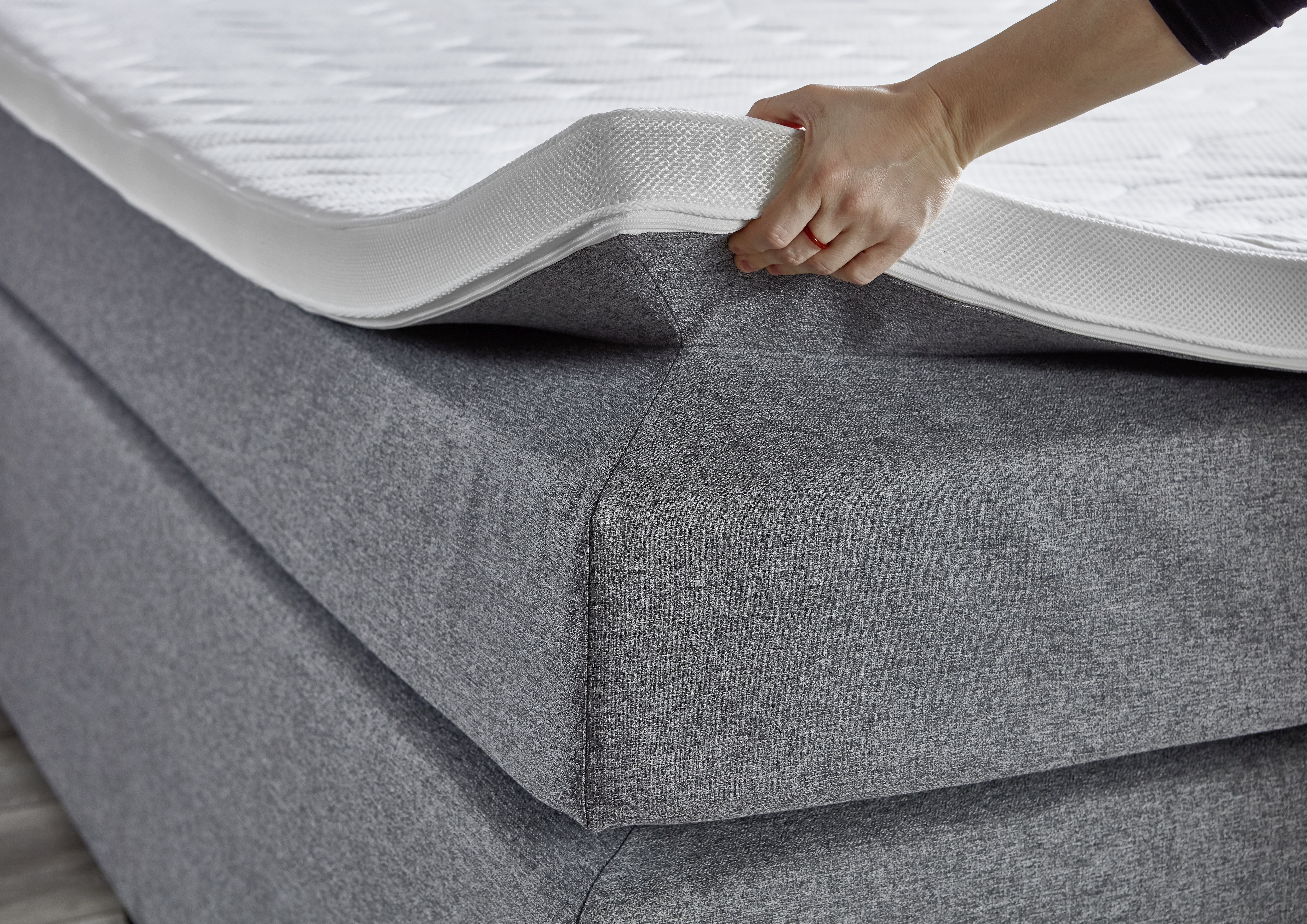 Topper fest mit Basismatratze vernäht, in Optik eines separaten Toppers, ohne, dass dieser verrutschen kann. Durch eine Vertiefung / Überlappung besteht die Möglichkeit ein Spannbettlaken zu fixieren, ohne dass die Seiten der Matratze überdeckt werden