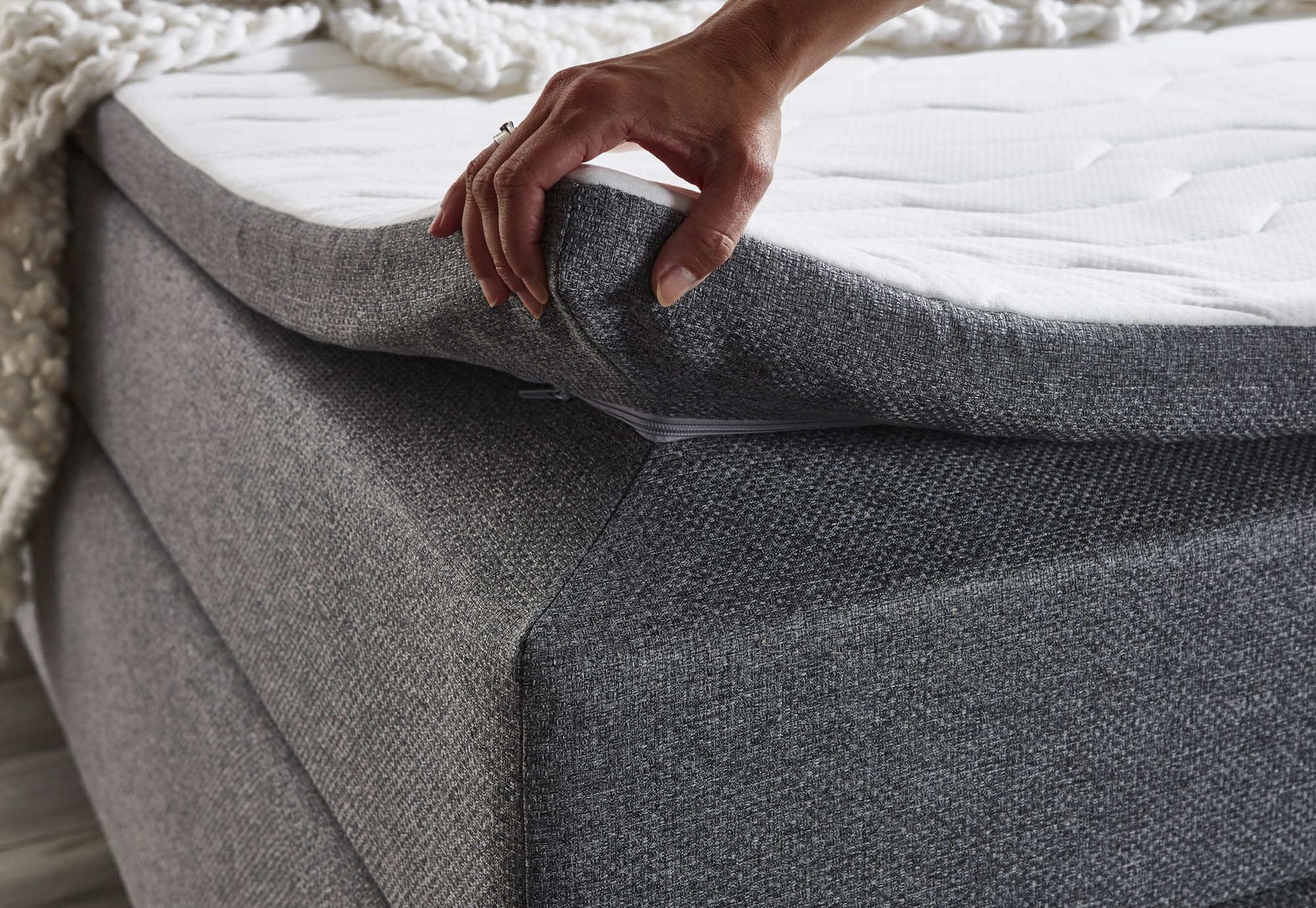 Durchgehende Topper-Schaumplatte aus ca. 6 cm PU-Komfortschaum (25 kg/m³), mit einseitigem Noppenprofil (Zur Veränderung des Liegekomforts kann die Topper-Schaumplatte innerhalb der Hülle gewendet werden)