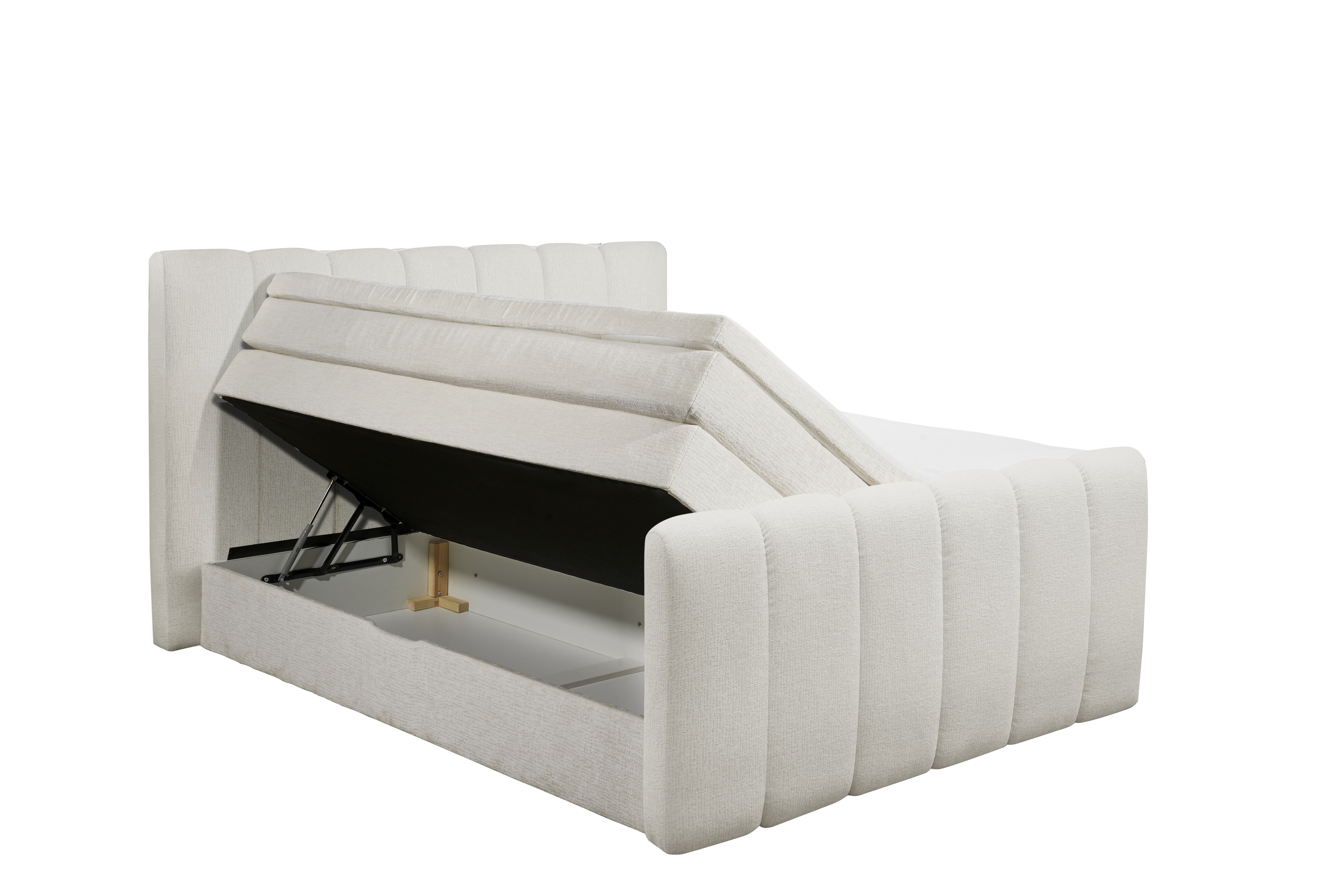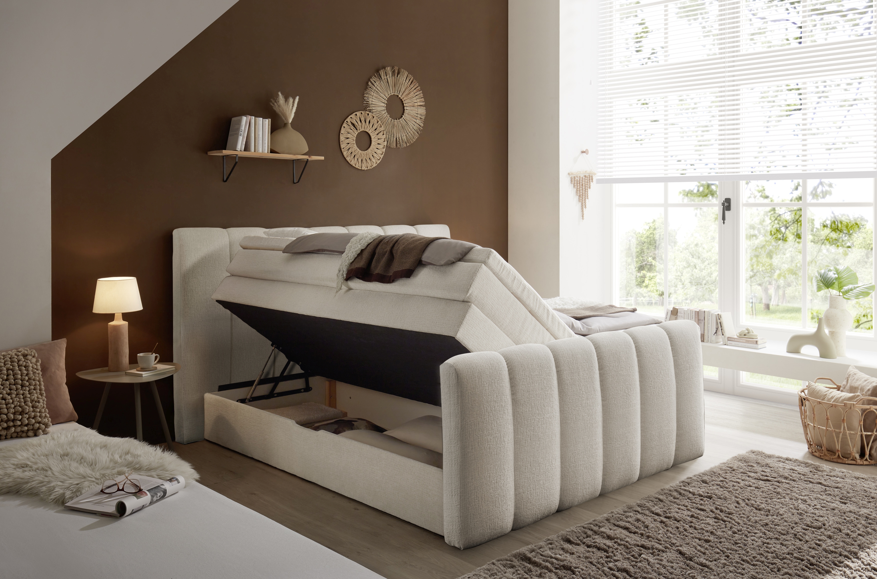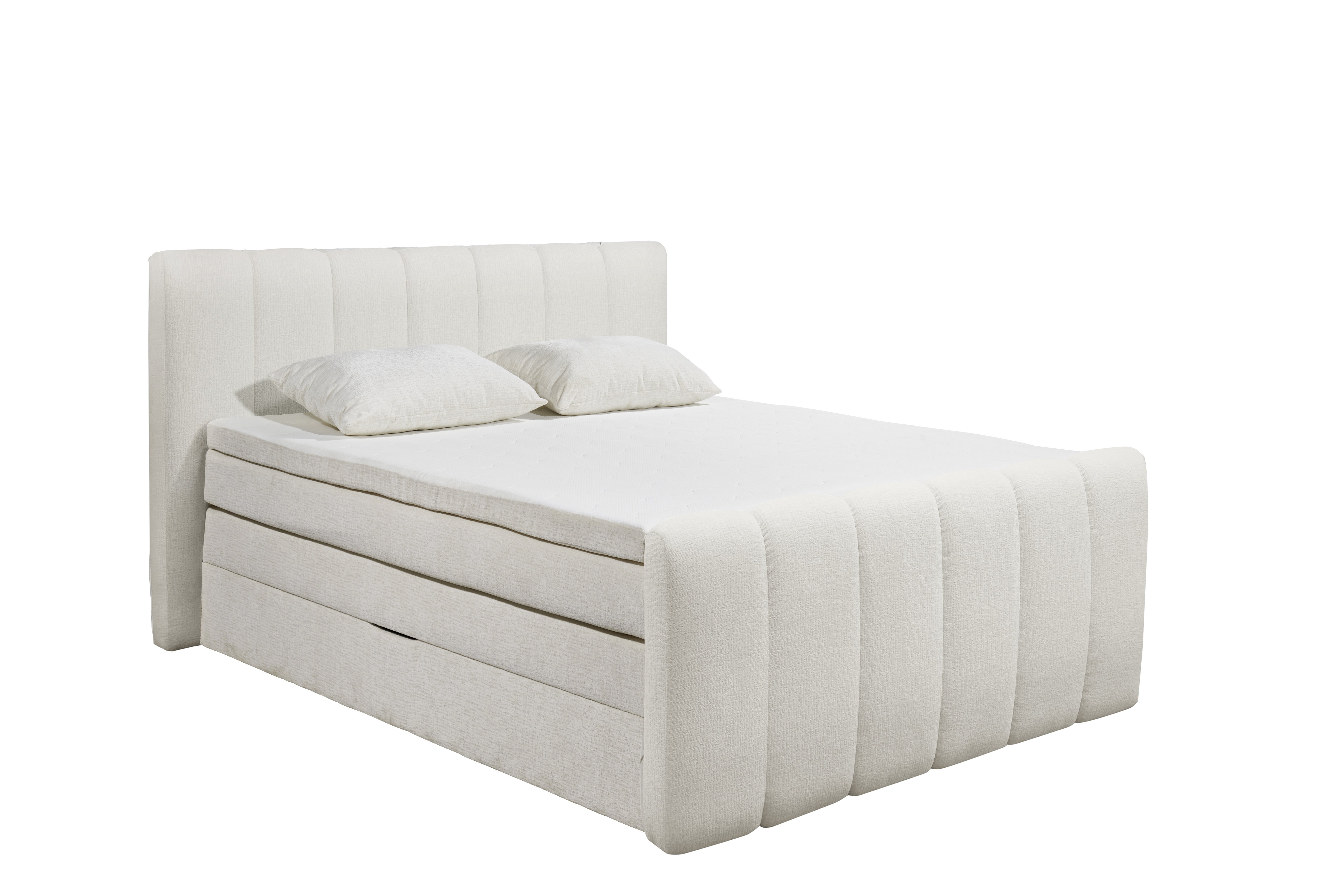 Dieses Boxspringbett vereint funktionale Ausstattung mit solider Verarbeitung und angenehmem Liegekomfort. Der Bezug in der Farbe Ivory aus 100 % Polyester ist pflegeleicht und verleiht dem Bett eine helle, neutrale Optik. Zwei Boxen mit Bonellfederkern und darauf abgestimmte Tonnentaschen-Federkernmatratzen bieten ein mittelfestes Liegegefühl (Härtegrad H2). Ein Komfort-Topper aus T25-Schaum verbessert die Druckentlastung zusätzlich – sein Bezug ist bei 40 °C waschbar. Seitlich zugängliche Bettkästen unter der Liegefläche sorgen für praktischen Stauraum. Kopf- und Fußteil sind gesteppt und runden das Gesamtbild funktional ab. Das Bett ist bis ca. 120 kg belastbar und wird ohne Dekoration geliefert.