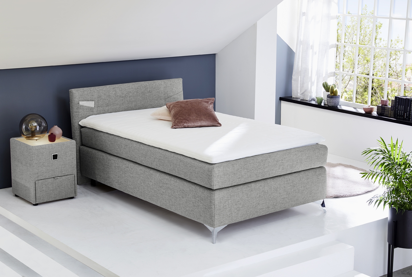 Die Grundlage für dieses moderne Boxspringsystem bildet eine Box mit einer Bonell-Federkernpolsterung. Dabei wird ein Bonell-Federkern als Unterfederung verwendet. Auf dieser Box liegt eine hochwertige Wende-Bonell-Federkern-Matratze. Durch die so erzeugte Doppelfederung entsteht ein einmaliger Federkomfort mit optimaler Körperanpassung und Druckentlastung. Den Abschluss eines wunderbaren Schlaferlebnisses bildet der PU-Schaum-Topper. Dieses Boxspringsystem ermöglicht einen hervorragenden Schlafkomfort durch sein exzellentes und individuelles Doppelfederungs-Verhalten.
