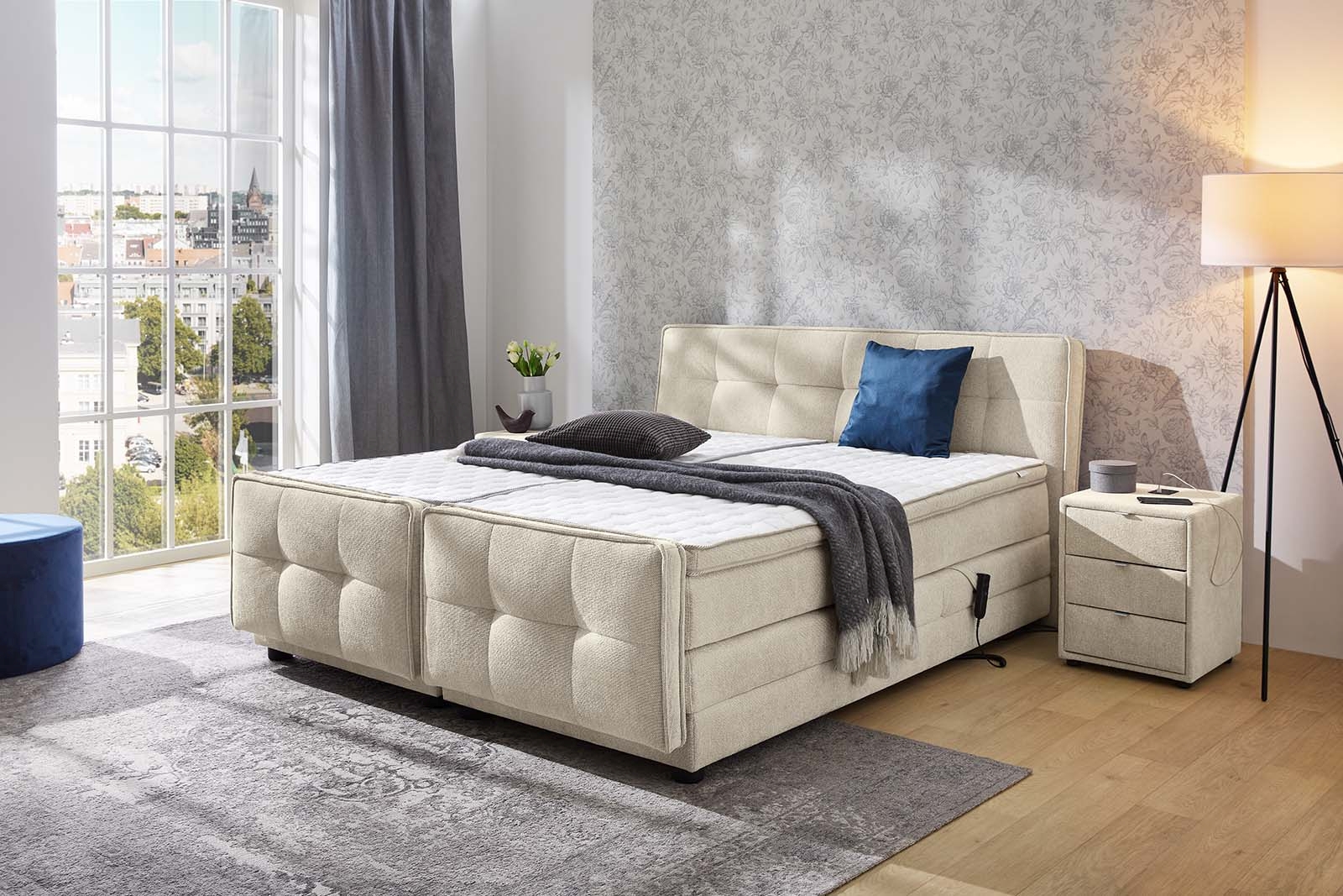 Highlight dieses Boxspringbettes liegt eindeutig in der elektromotorischen Verstellbarkeit. Die individuelle Lieblingsliegeposition kann mit Hilfe einer praktischen Fernbedienung in unzähligen Kopf- und Fußteilpositionen eingestellt werden. Das dekorative Kopf- und Fußteil ist mit einem interessanten Doppelkeder optisch aufgehübscht.Das Fußteil hat zudem die positive Eigenschaft, dass sich Matratze und Topper im Funktionsmodus nicht verschieben.