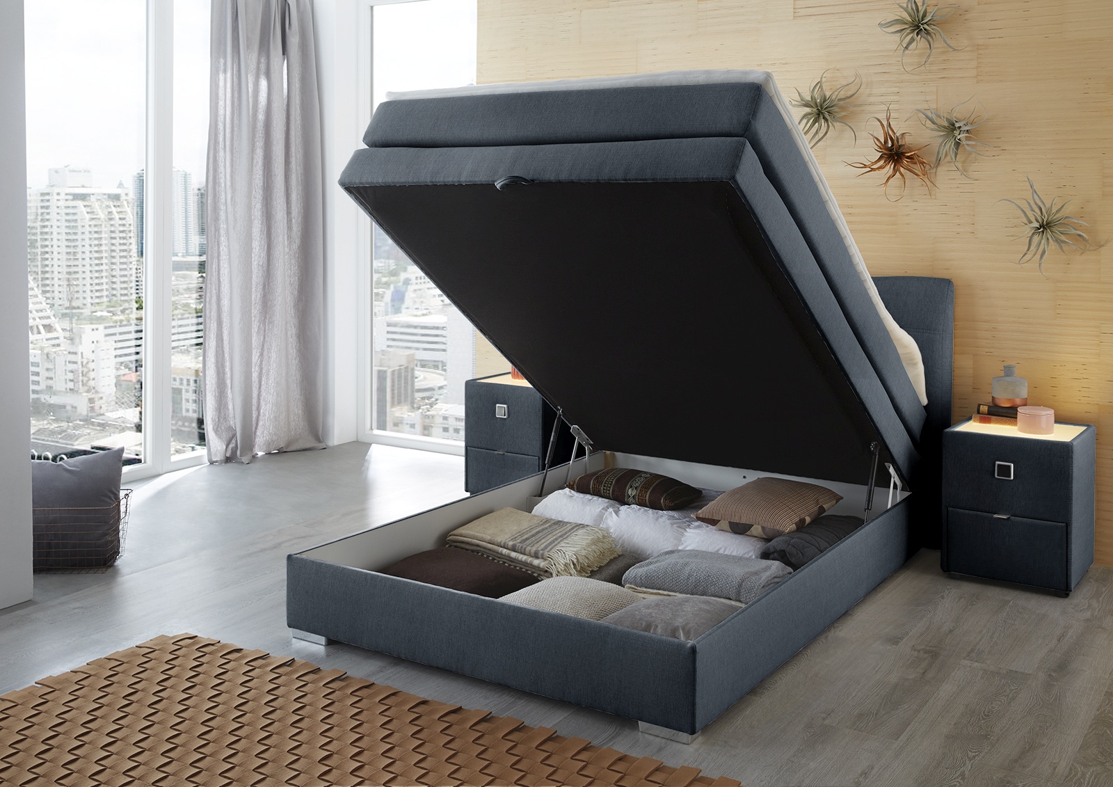 Der Unterbau für dieses Boxspringbett besteht aus einer Bettkastenbox und einem Hub-Matratzenrahmen mit Bonell-Federkernpolsterung. Auf dieser Unterfederung ist eine Bonell-Federkern-Matratze aufgelegt. Durch die so erzeugte Doppelfederung entsteht ein einmaliger Federkomfort mit optimaler Körperanpassung und Druckentlastung. Der obere Abschluss des Boxspringaufbaus wird durch einen PU-Schaum-Topper gebildet.