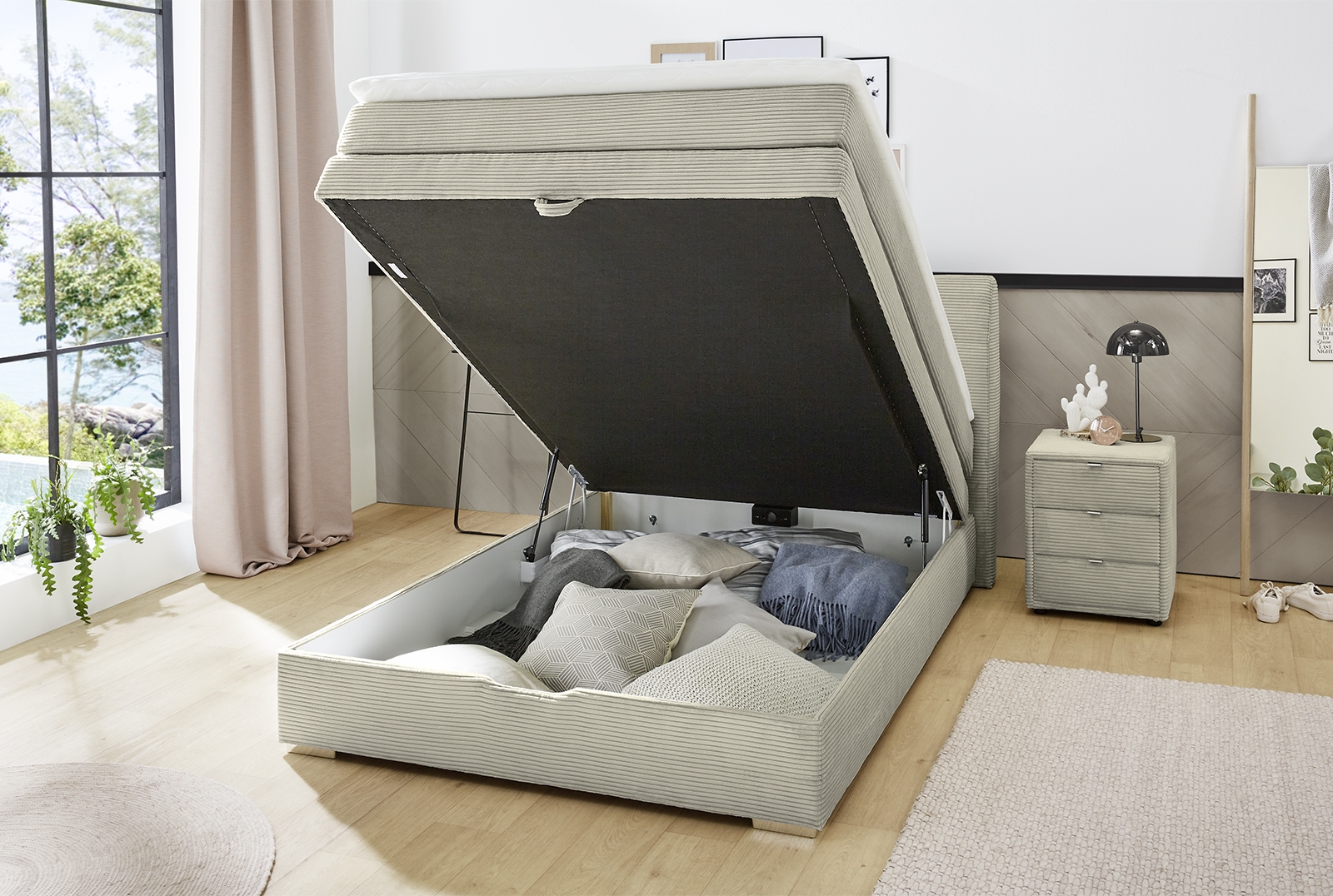 Der Unterbau für dieses Boxspringbett besteht aus einer Bettkastenbox mit Bonell-Federkernpolsterung. Auf diese Unterfederung ist eine Bonell-Federkernmatratze aufgelegt. Durch die so erzeugte Doppelfederung entsteht ein einmaliger Federkomfort mit optimaler Körperanpassung und Druckentlastung. Der obere Abschluss des Boxspringaufbaus wird durch einen PU-Schaum-Topper gebildet. Dieses Boxspringsystem ermöglicht einen hervorragenden Schlafkomfort durch sein exzellentes und individuelles Doppelfederungsverhalten. Der in der Box integrierte belüftete Bettkasten ist mit Unterstützung von Gasdruckfedern sehr leicht zu öffnen und bietet so sehr viel Stauraum.