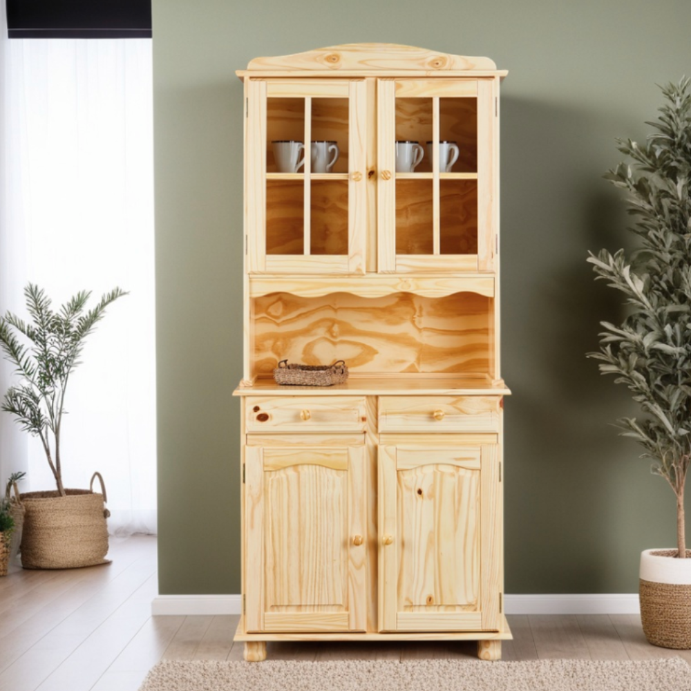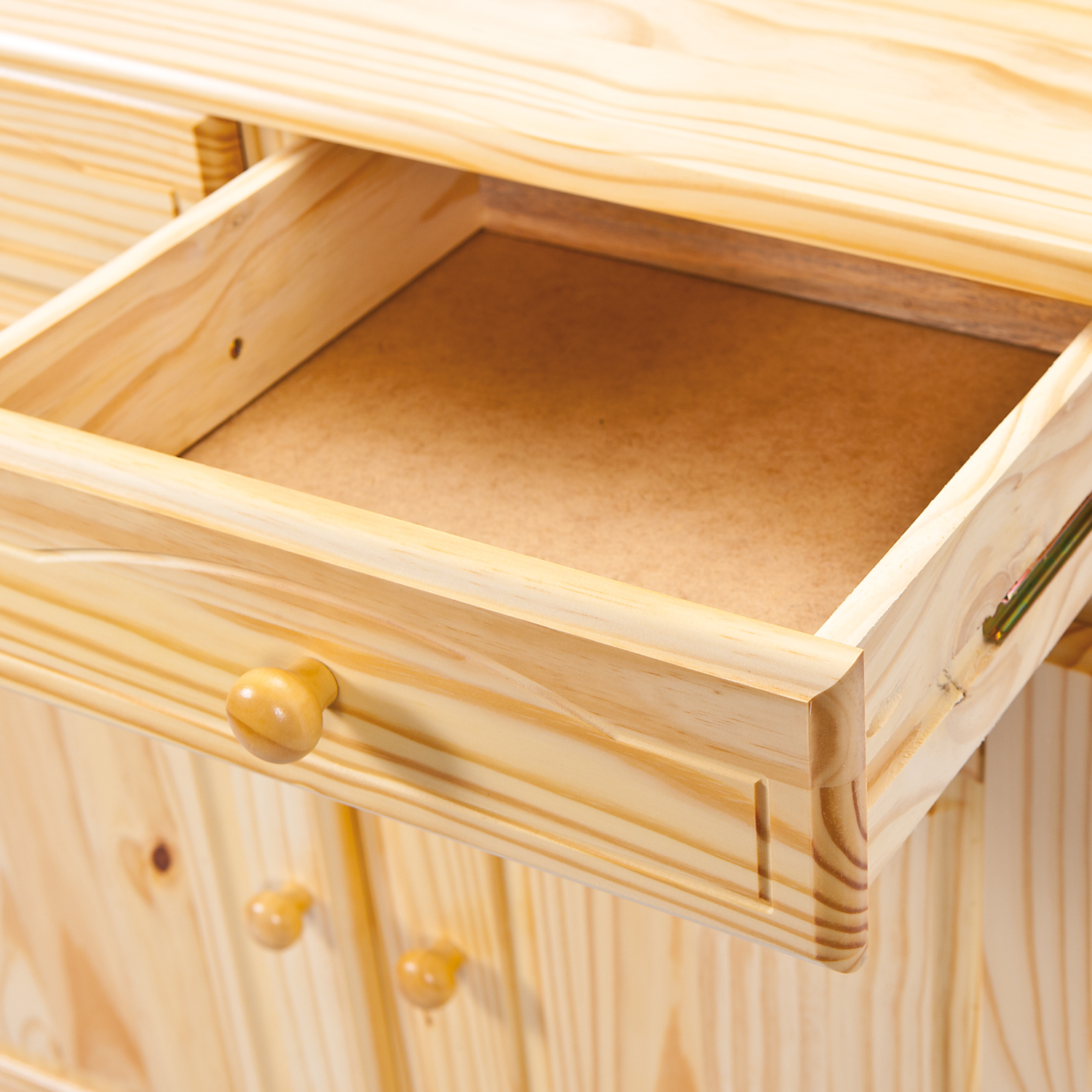 Sichtbare Regalfächer können genutzt werden, um dekorative Gegenstände zu platzieren. Dadurch entstehen viele Möglichkeiten, farbliche Akzente zu setzen und das Gesamtbild zu individualisieren. Der Schrank verfügt über 2 Schubladen, 4 Fachböden und insgesamt 4 Türen. Um das Massivholz zu schützen, wird die Oberfläche mit transparentem Klarlack versiegelt. Durch dieses Verfahren ist die Oberfläche pflegeleicht und wasserabweisend. Der verwendete Lack ist schadstoffarm.