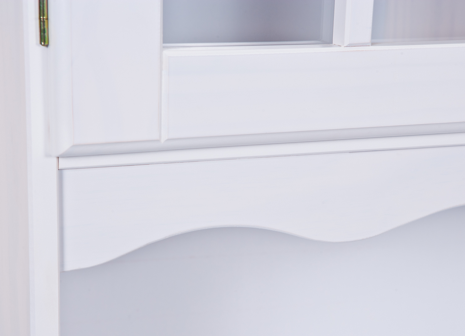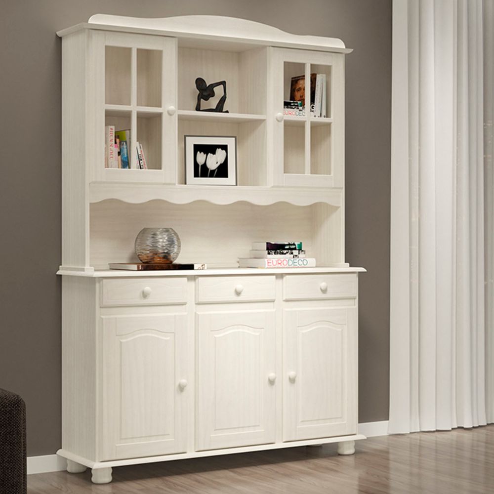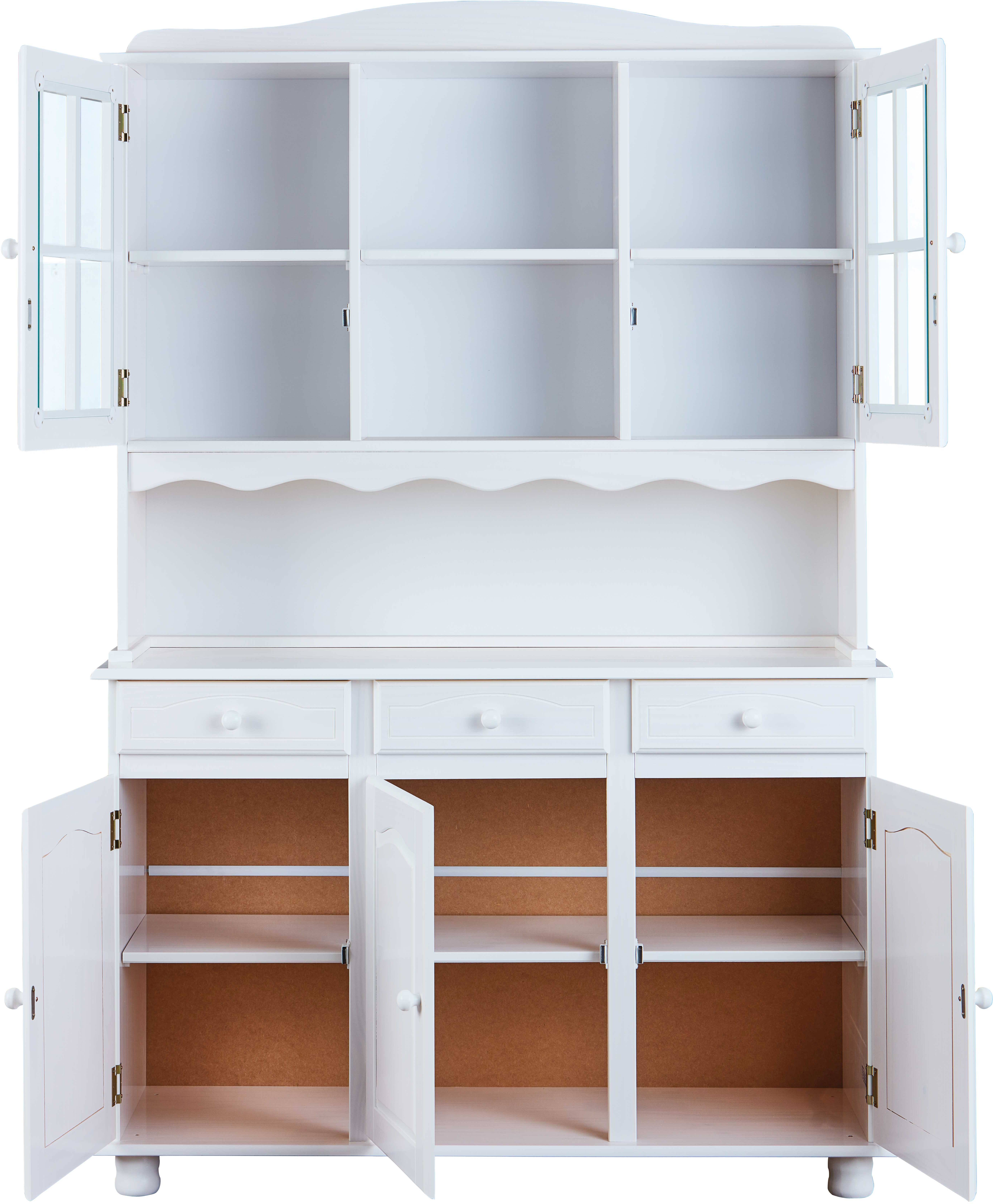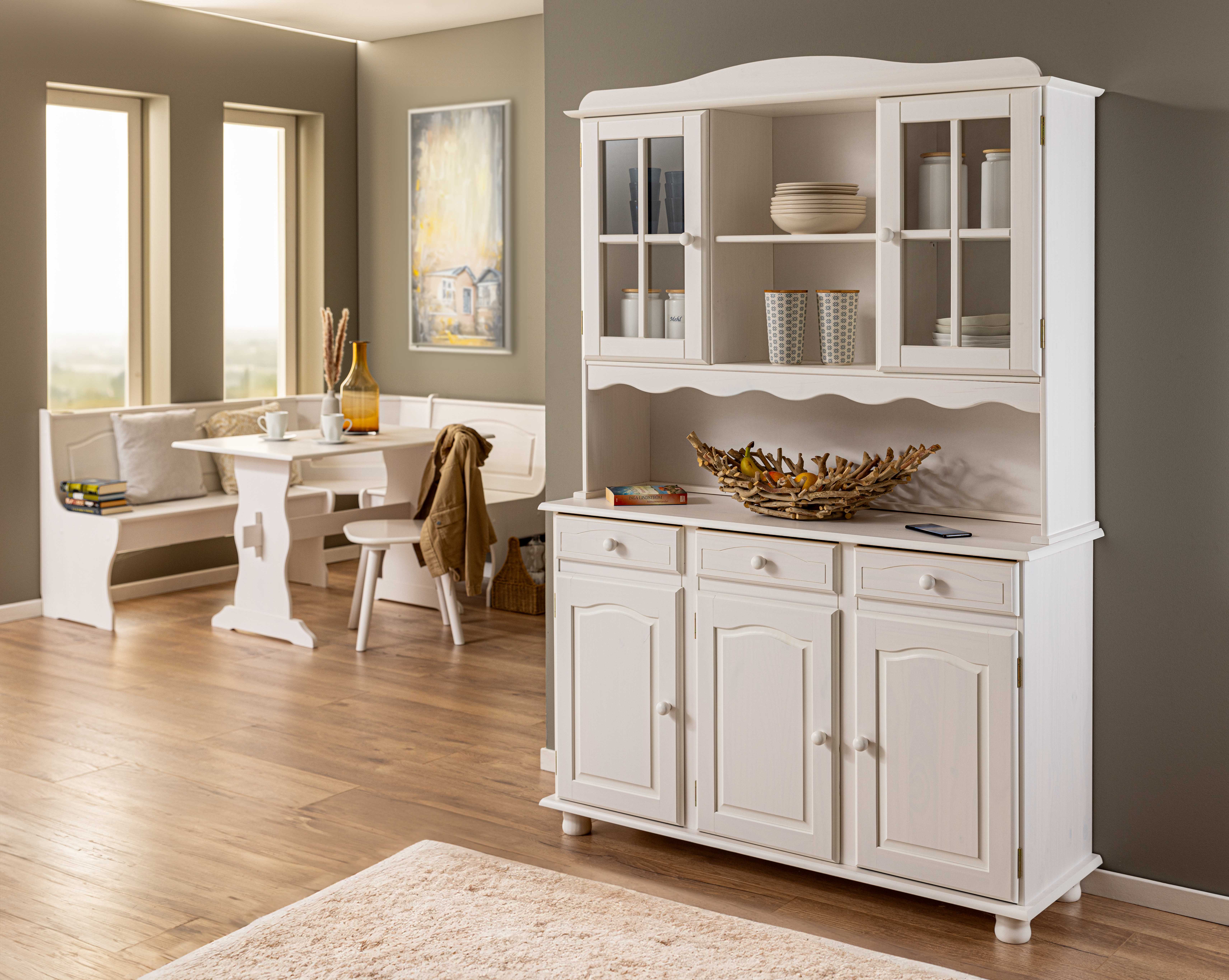 Sichtbare Regalfächer können genutzt werden, um dekorative Gegenstände zu platzieren. Dadurch entstehen viele Möglichkeiten, farbliche Akzente zu setzen und das Gesamtbild zu individualisieren. Der Schrank ist mit 3 Schubladen, 6 Fachböden und insgesamt 5 Türen ausgestattet. Das Massivholz wurde mit weißem Lack grundiert. Der widerstandsfähige Lack ist besonders pflegeleicht und wasserabweisend. Die natürlichen Holzmaserungen bleiben durch die leicht transparente Lackierung erhalten.