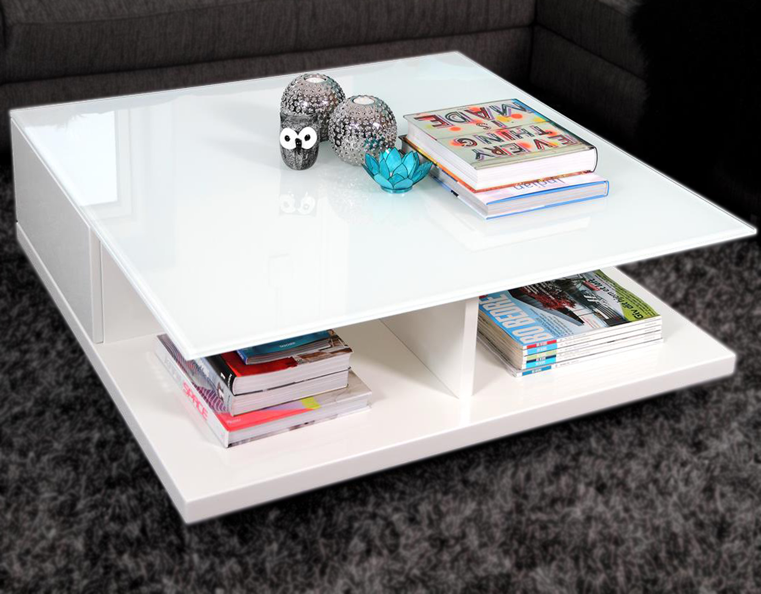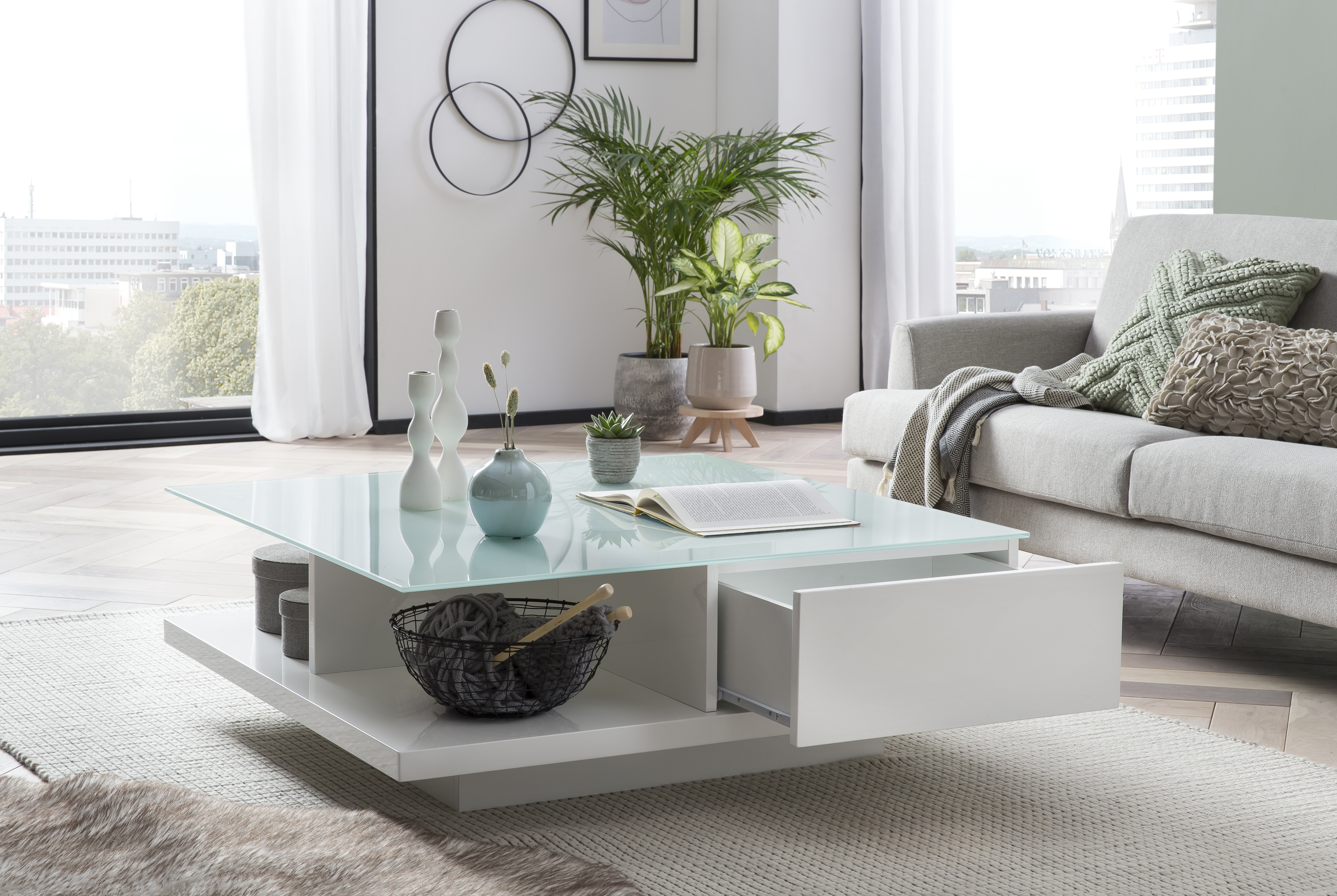 Tischplatte: Kristallglas gehärtet, Glasplatte von unten weiß lackiert
