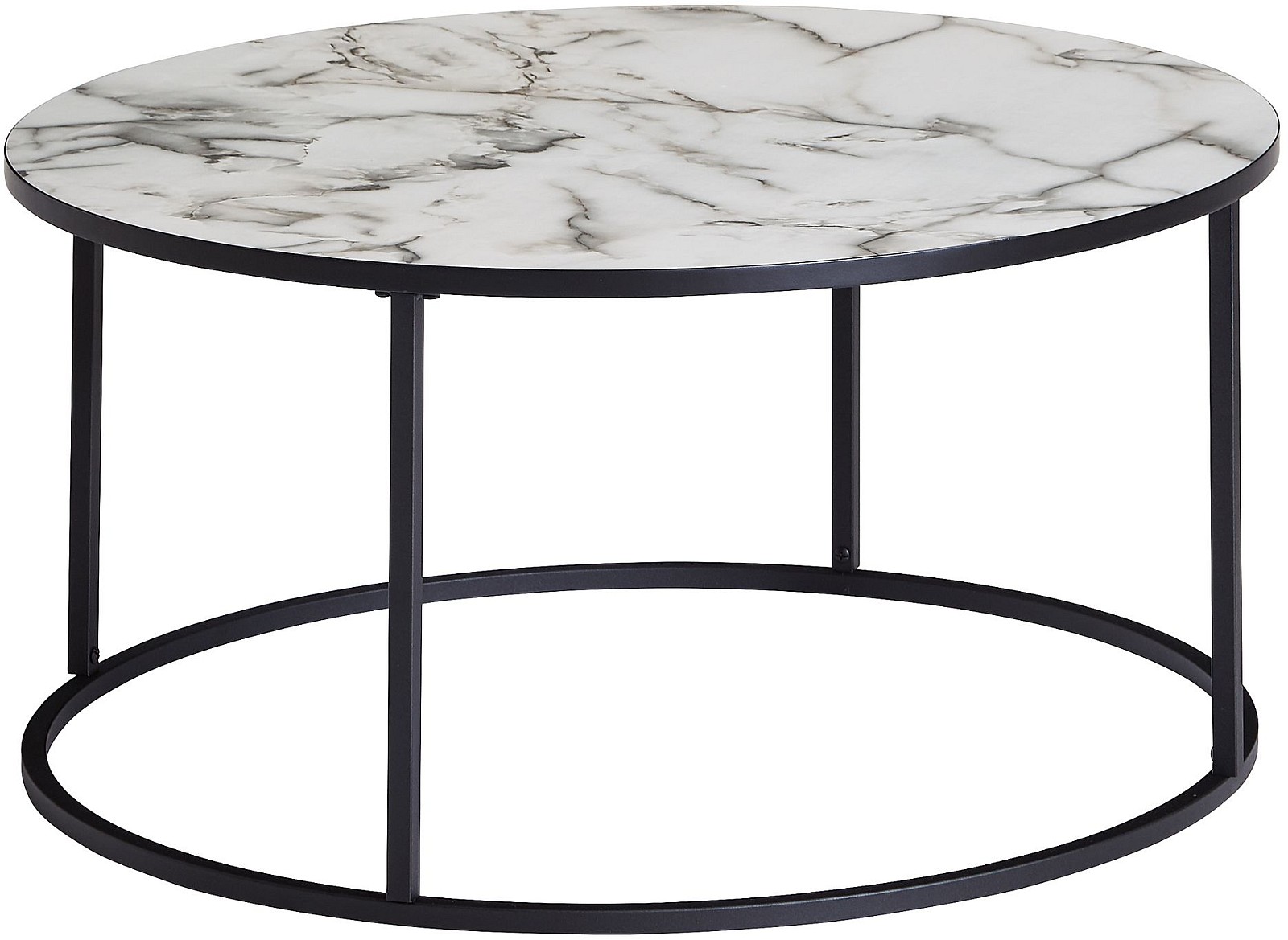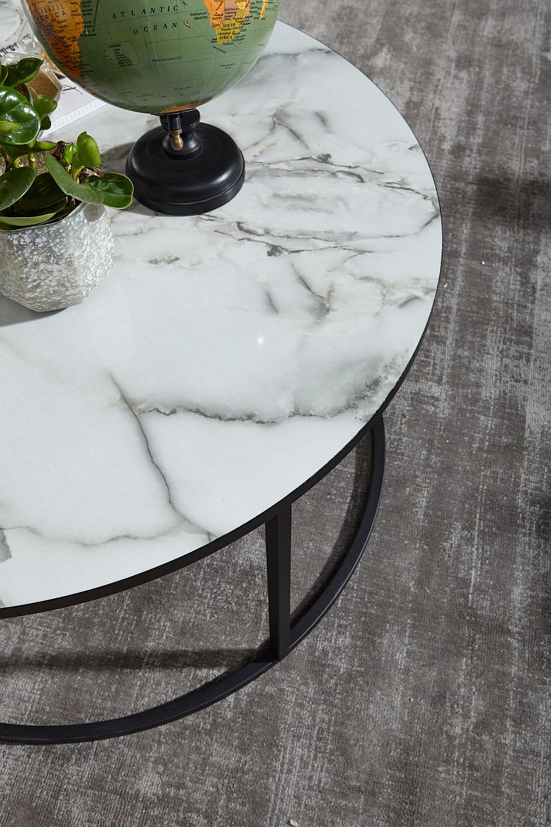 MATERIAL ✔ Tischplatte: Foliertes MDF in weißer Marmor Optik mit schützender PVC-Beschichtung // Gestell: Pulverbeschichteter Stahl.