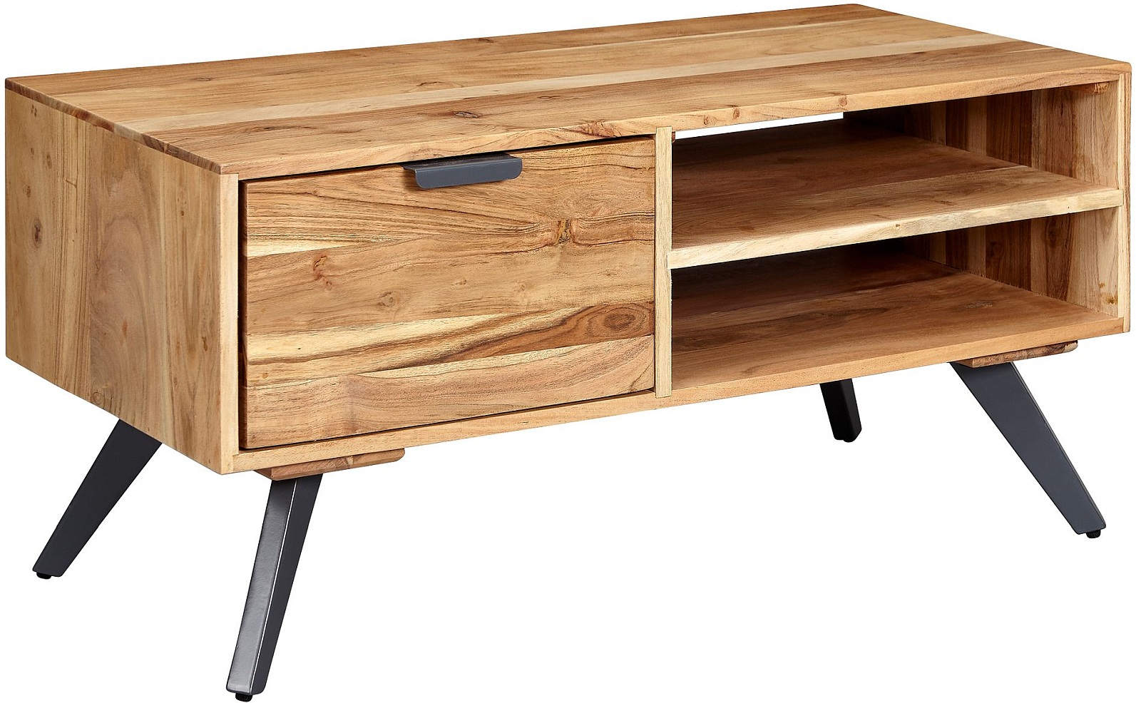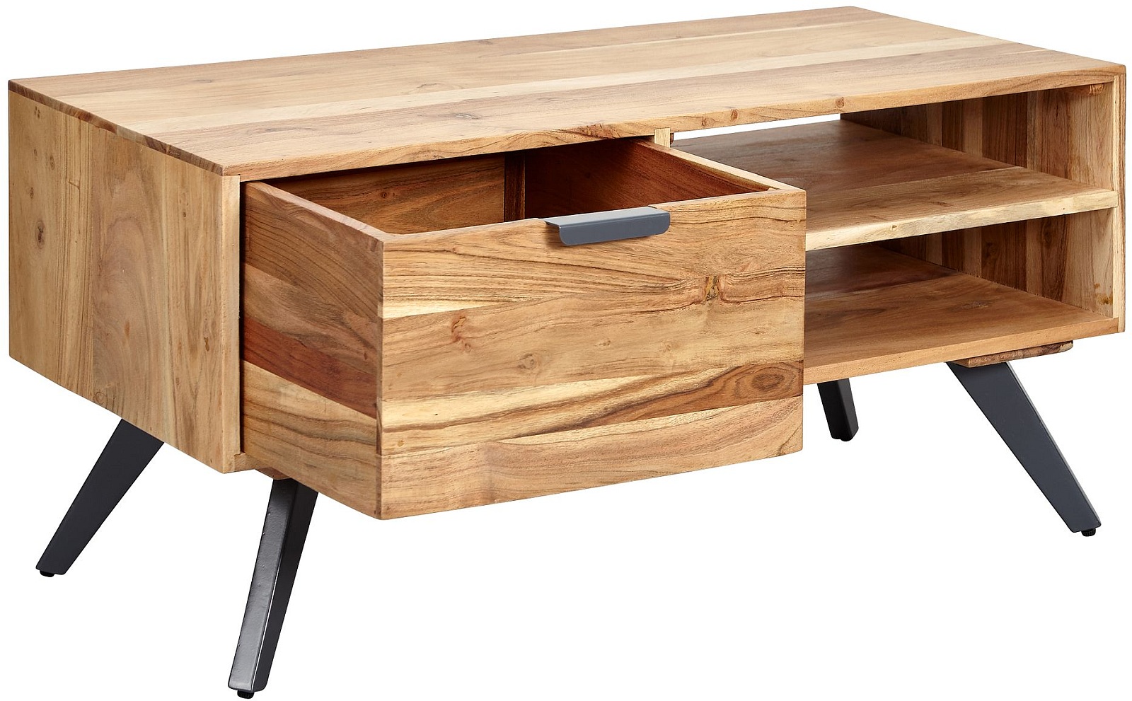 LIEBLINGSSTÜCK ✔ Eindrucksvoller Designer Tisch im angesagten Materialmix aus Holz und Metall für Liebhaber individueller Wohnträume. Besonderes Augenmerk liegt hier auf dem Design und auf der einzigartigen Maserung eines wahren Unikats. Die praktische Schublade und die Staufächer bieten Platz für Zeitschriften, Fernbedienung und weitere Gegenstände, die Ihren Fernsehabend ausgefallen & besonders machen.