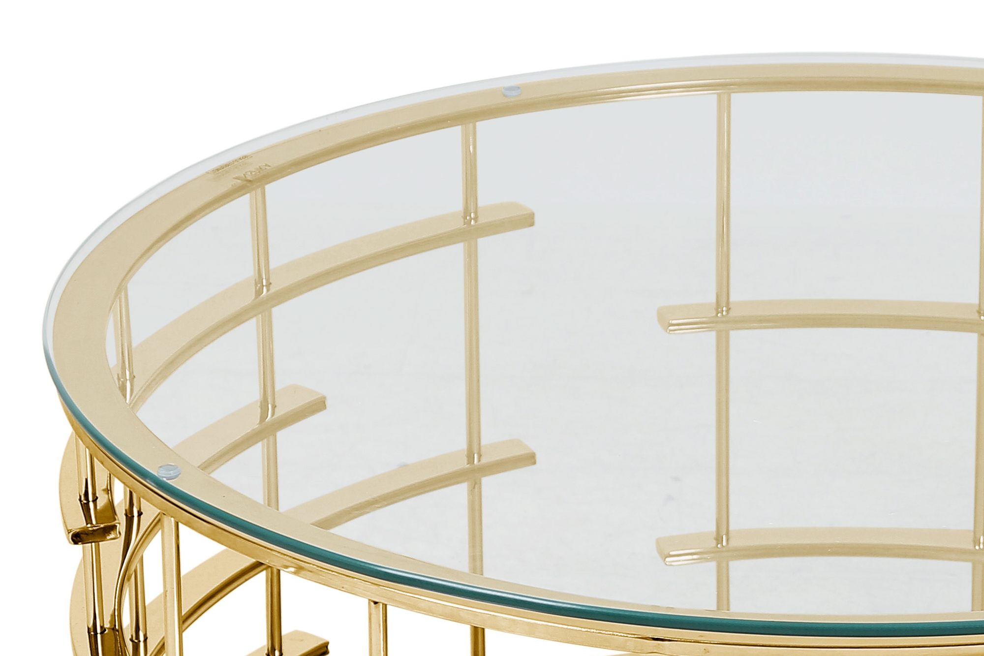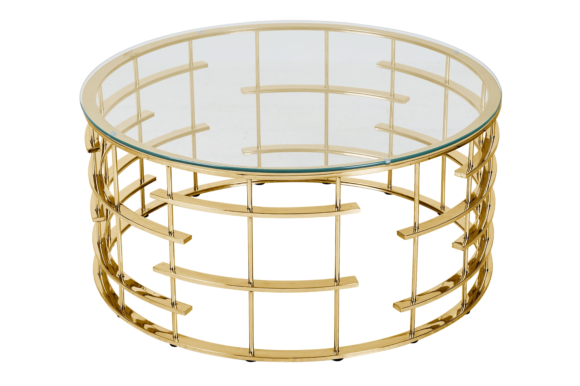 Wer ein extravagantes Design-Highlight abseits der Norm sucht, der trifft mit diesem runden Couchtisch aus Sicherheitsglas und robustem Stainless Steel garantiert die richtige Wahl. Das abstrakte Edelstahl-Gestell macht den Glastisch zu etwas ganz Besonderem und wertet jeden Wohn- und Sitzbereich im Handumdrehen luxuriös auf. Vor allem zu kubischen Sofas und Sesseln machen runde Couch- und Beistelltische eine gute Figur. Die Tischplatte besteht aus 8 mm starkem Sicherheitsglas und ergibt in Kombination mit dem Gestell aus rostfreiem Stahl eine besonders pflegeleichte und strapazierfähige Kombination. Das schöne Gestell in Gold wird in jedem Fall zum aufregenden Hingucker als Glanzstück vor dem Sofa.
