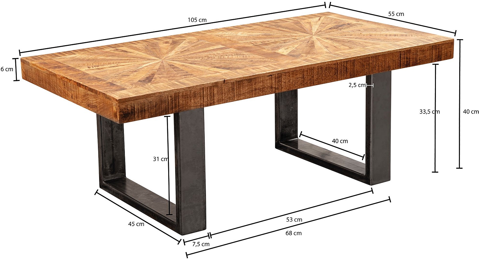 - MATERIAL ✔ Die Tischplatte des Sofatisches wurde aus naturbelassenem Mangoholz gefertigt. Die Tischbeine bestehen aus lackiertem Eisen.